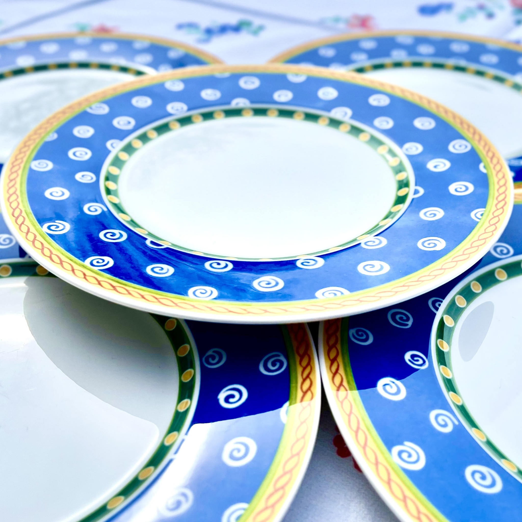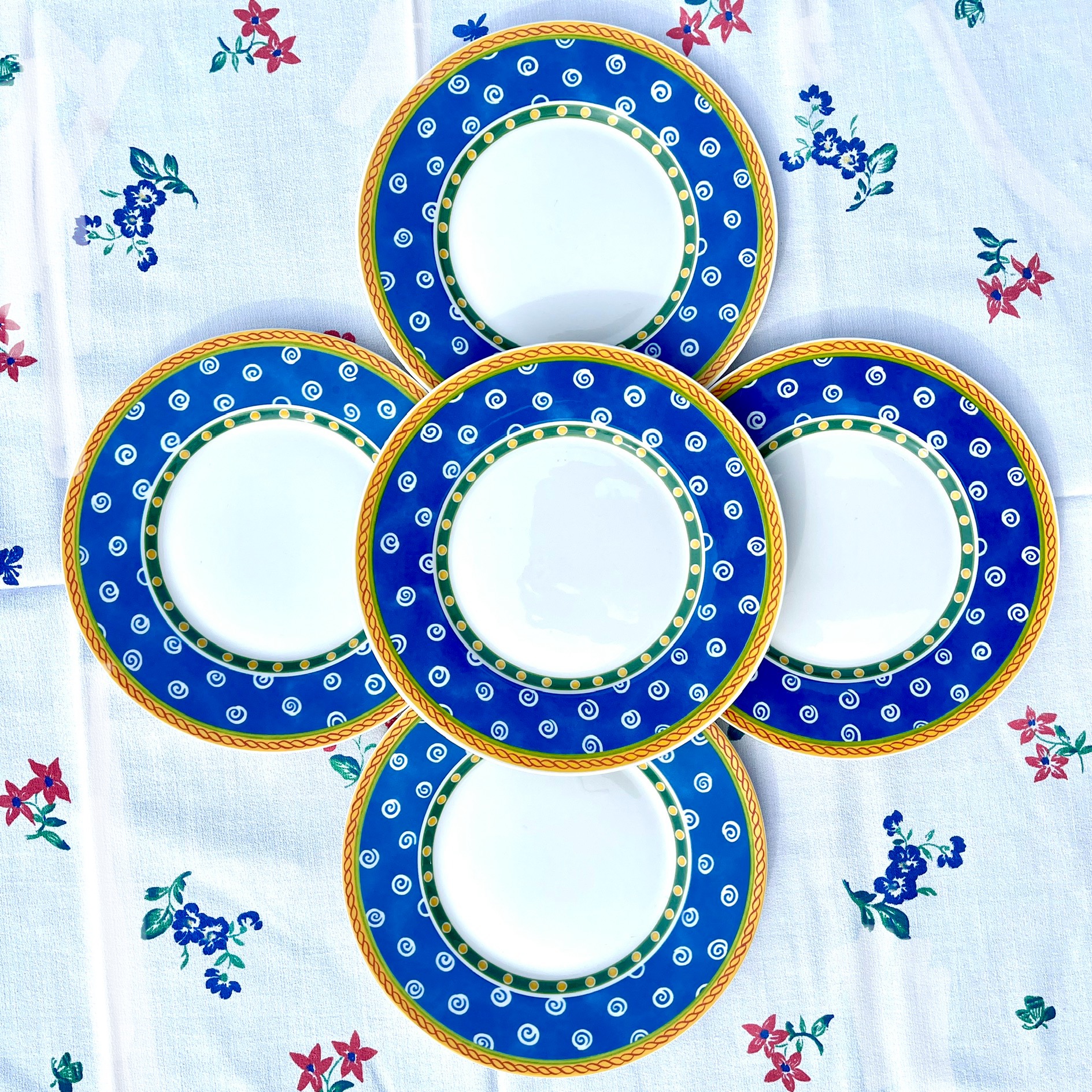 Set med fem läckra förrätts- eller salladstallrikar från Villeroy & Boch ur serien “Twist Cleá”. Har vissa spår av användning. Tål diskmaskin och micro. Diameter 21,5 cm.