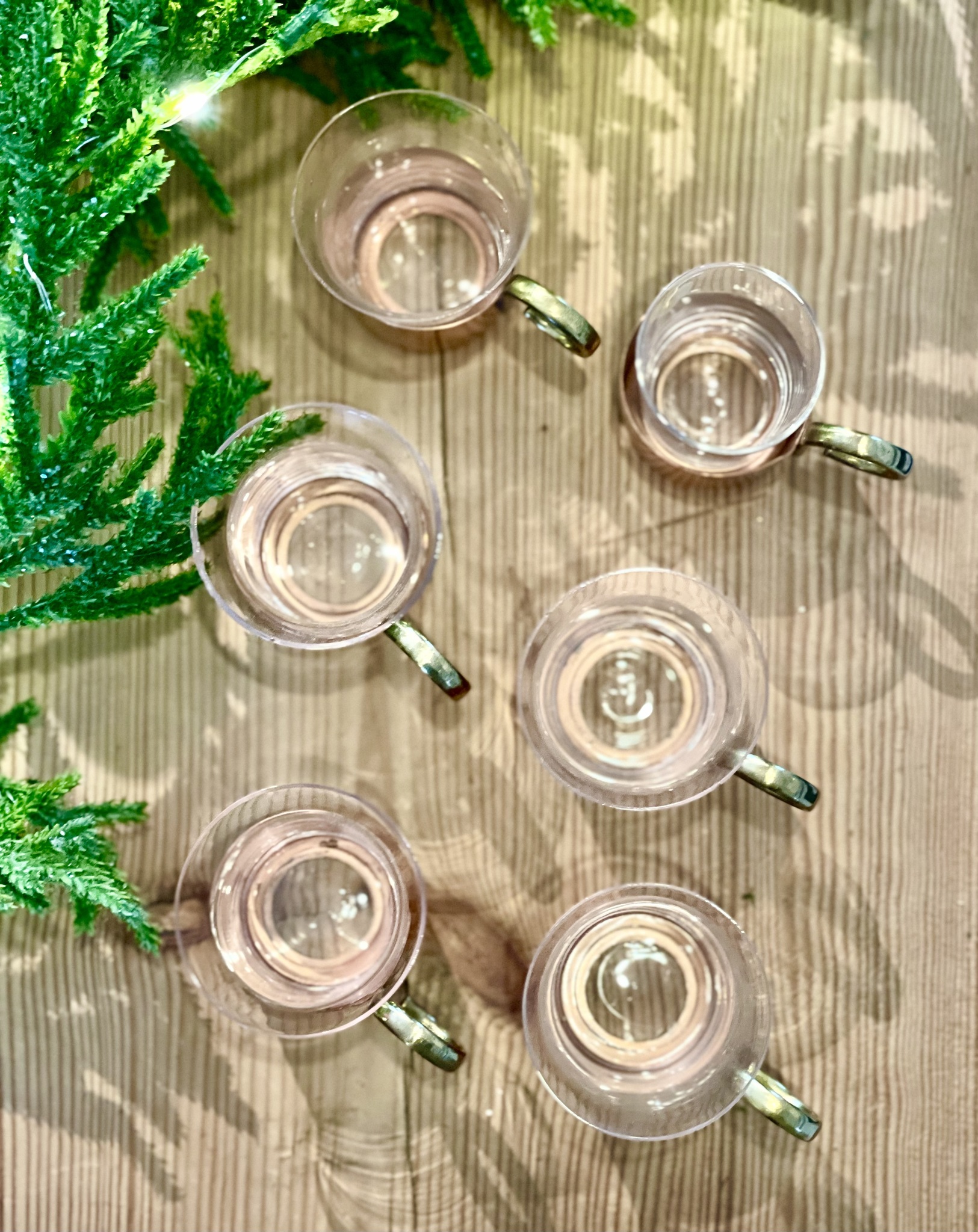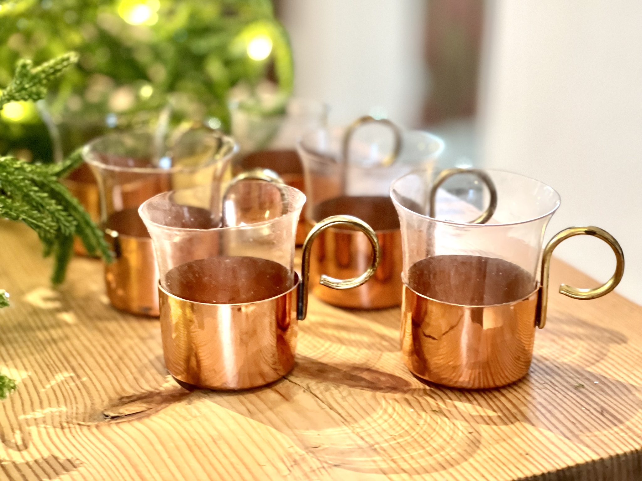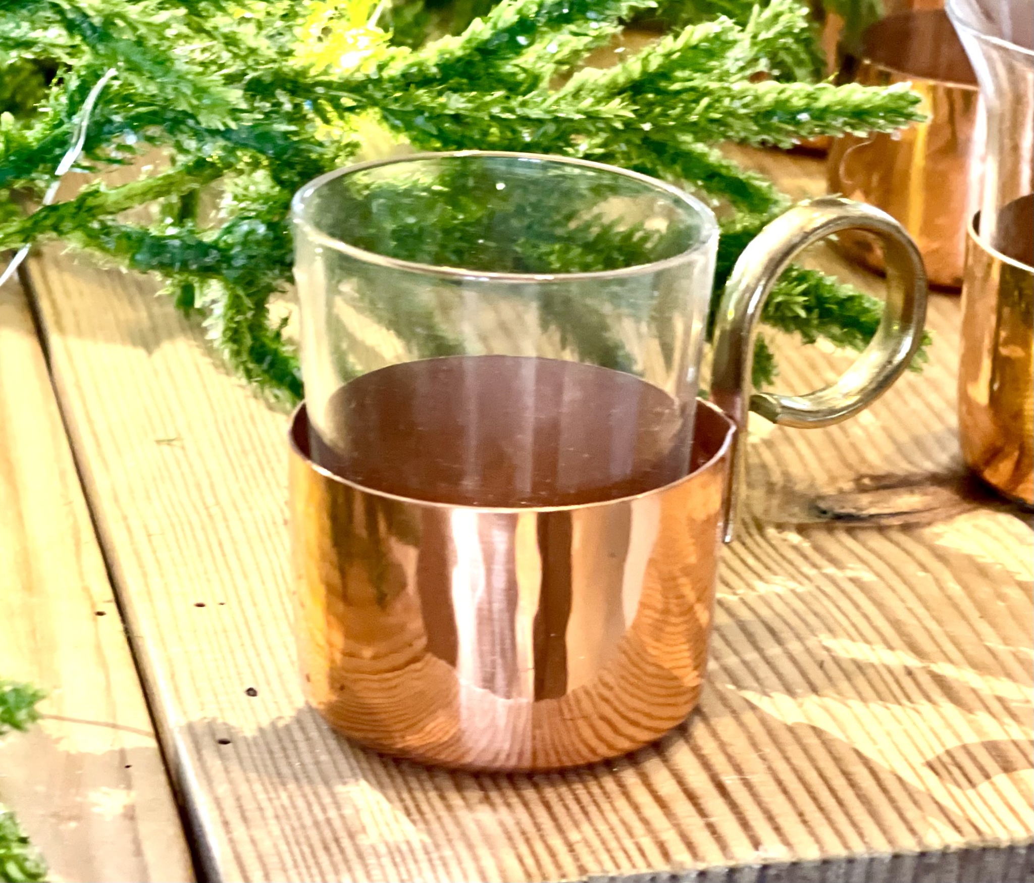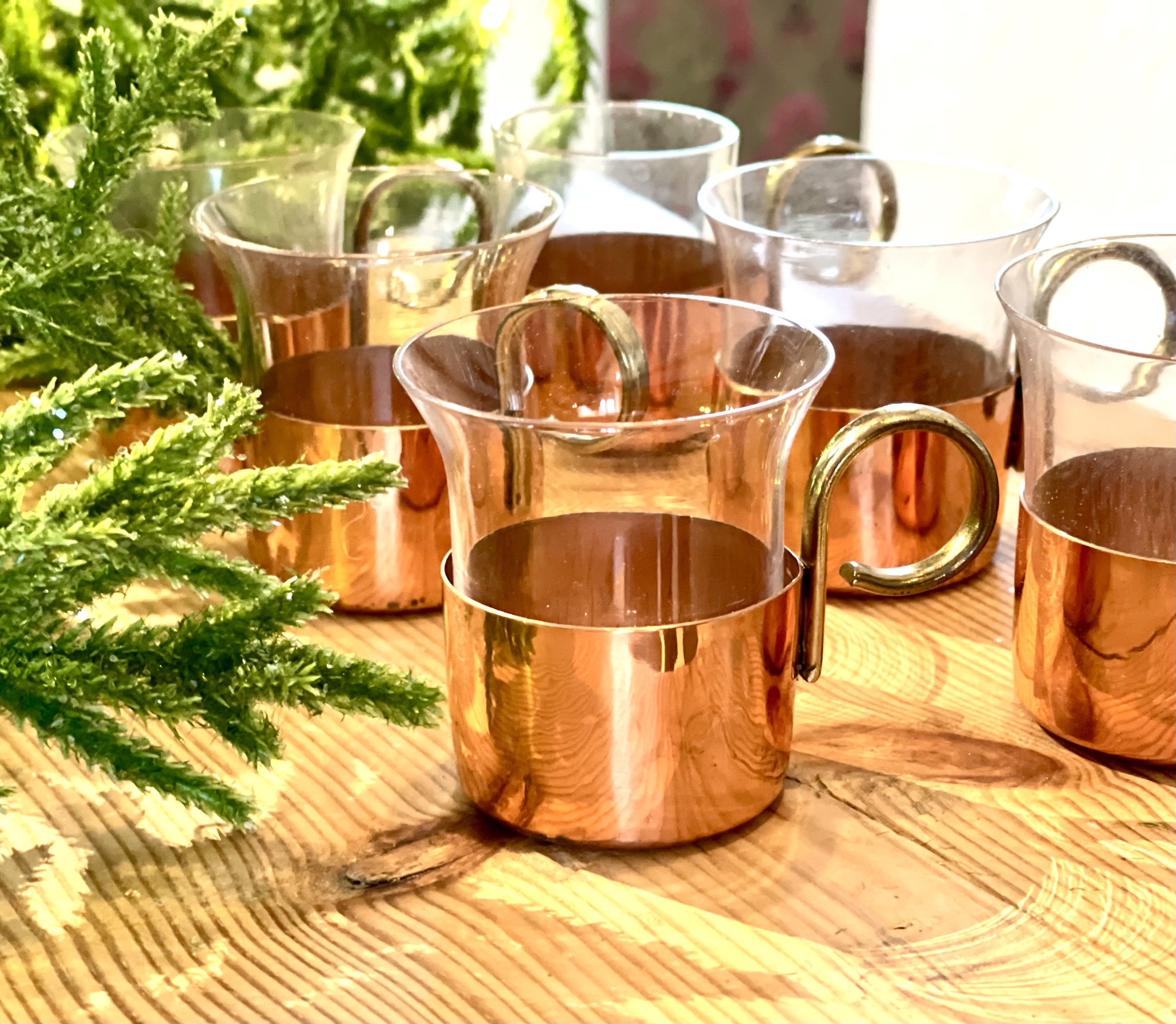 6 glöggmuggar i glas med hållare i koppar