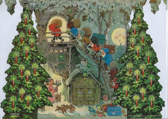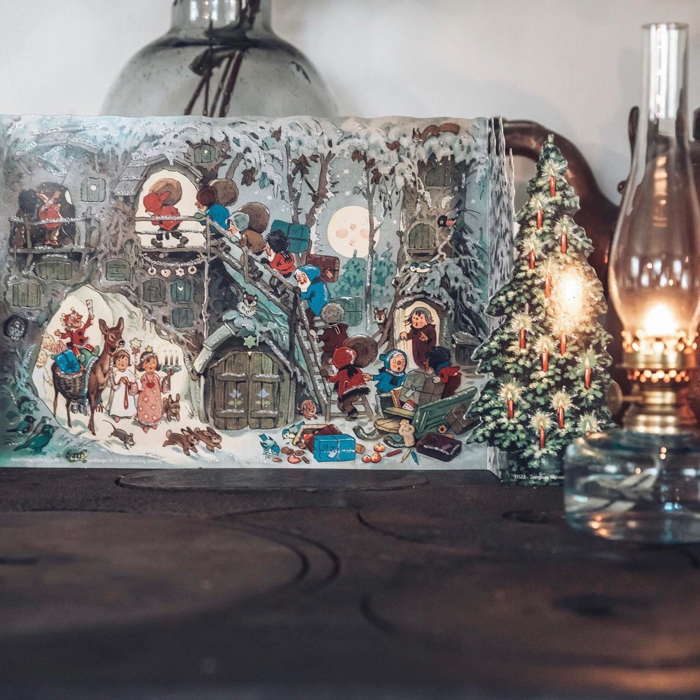 Fritz Baumgarten (1883-1966) skapade en vacker julvärld med sina iscensatta pixieillustrationer. Först publicerad på 50-talet och nu återutgiven i samma utförande. Denna adventskalender som kan vikas ut är en riktig nostalgisk skatt! Mått 29,7×21 cm.