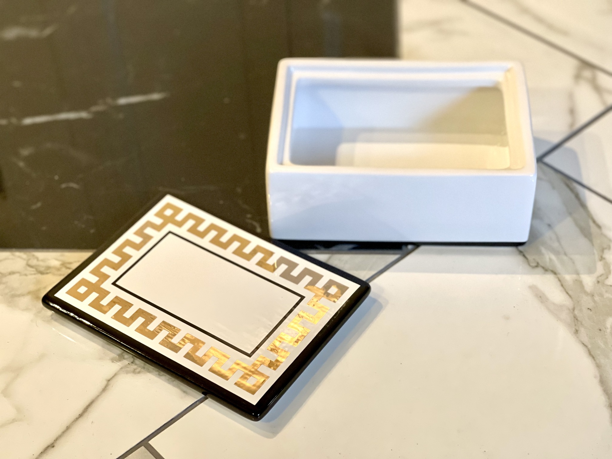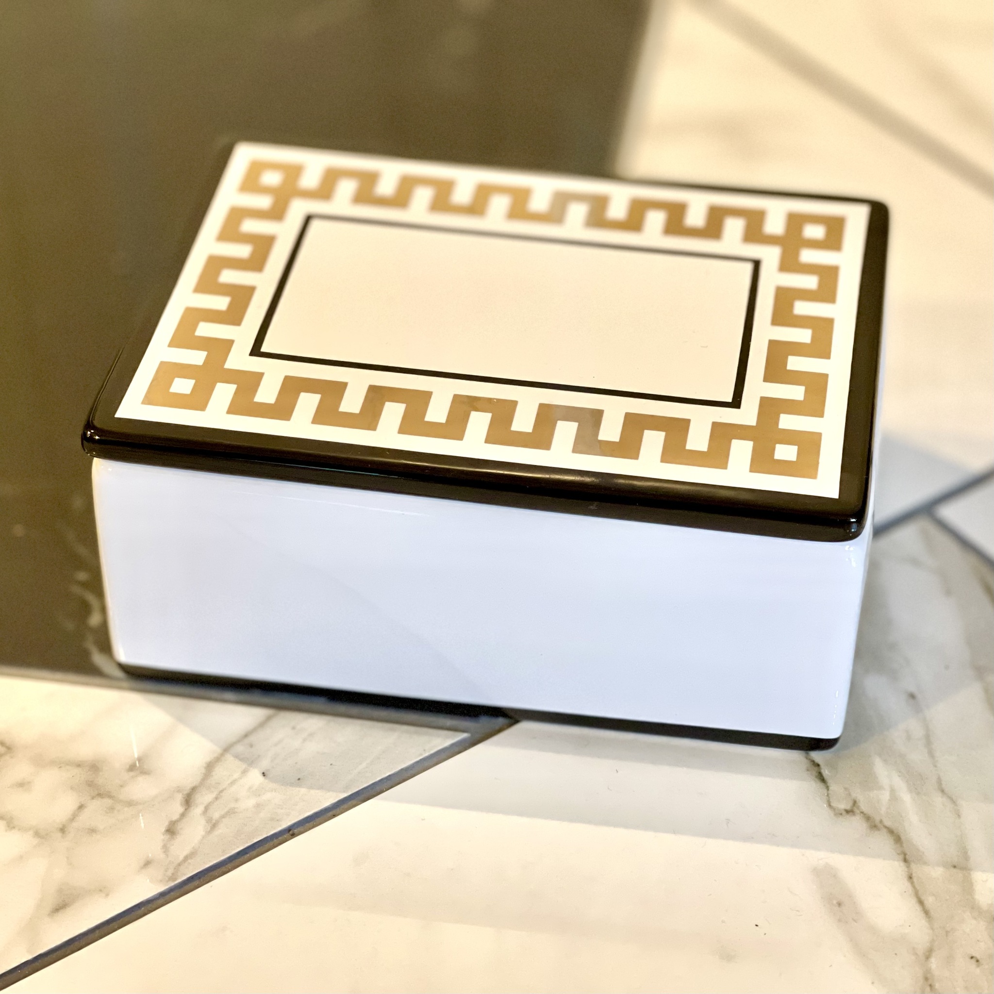 Underbar och stilren ask med lock från H&M Home. Gulddekor med svarta detaljer på vit botten. Längd 14,5 cm, bredd 10,5 cm, höjd 6,5 cm. Handdisk.
