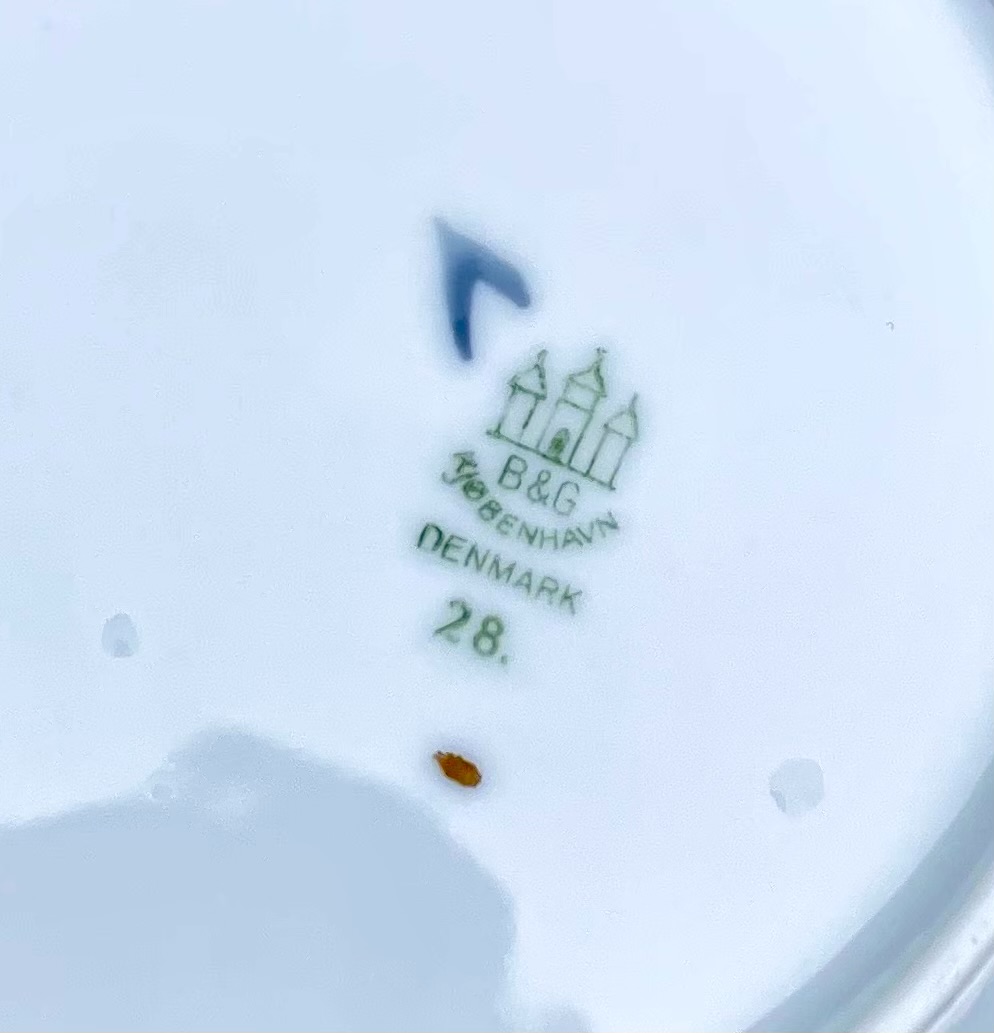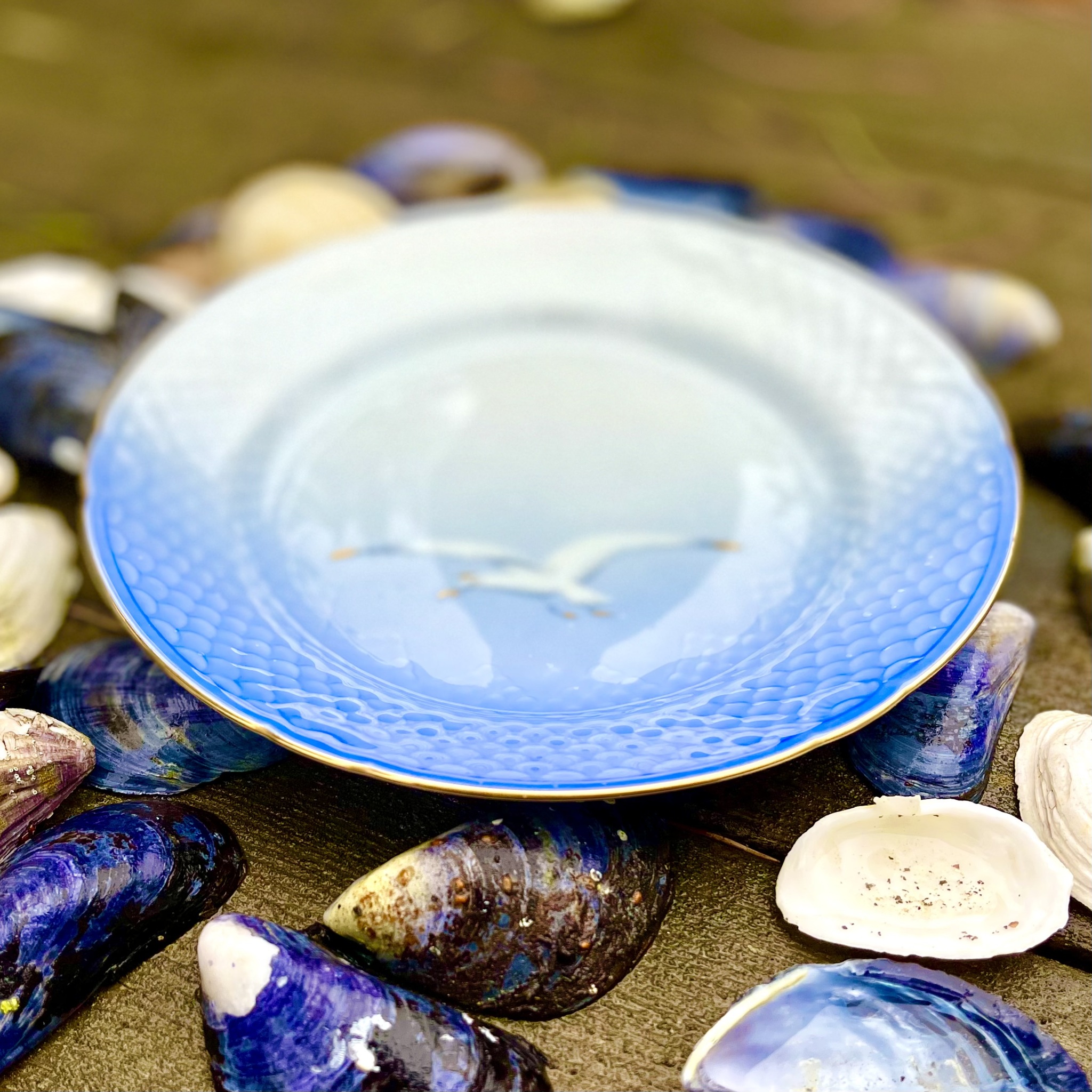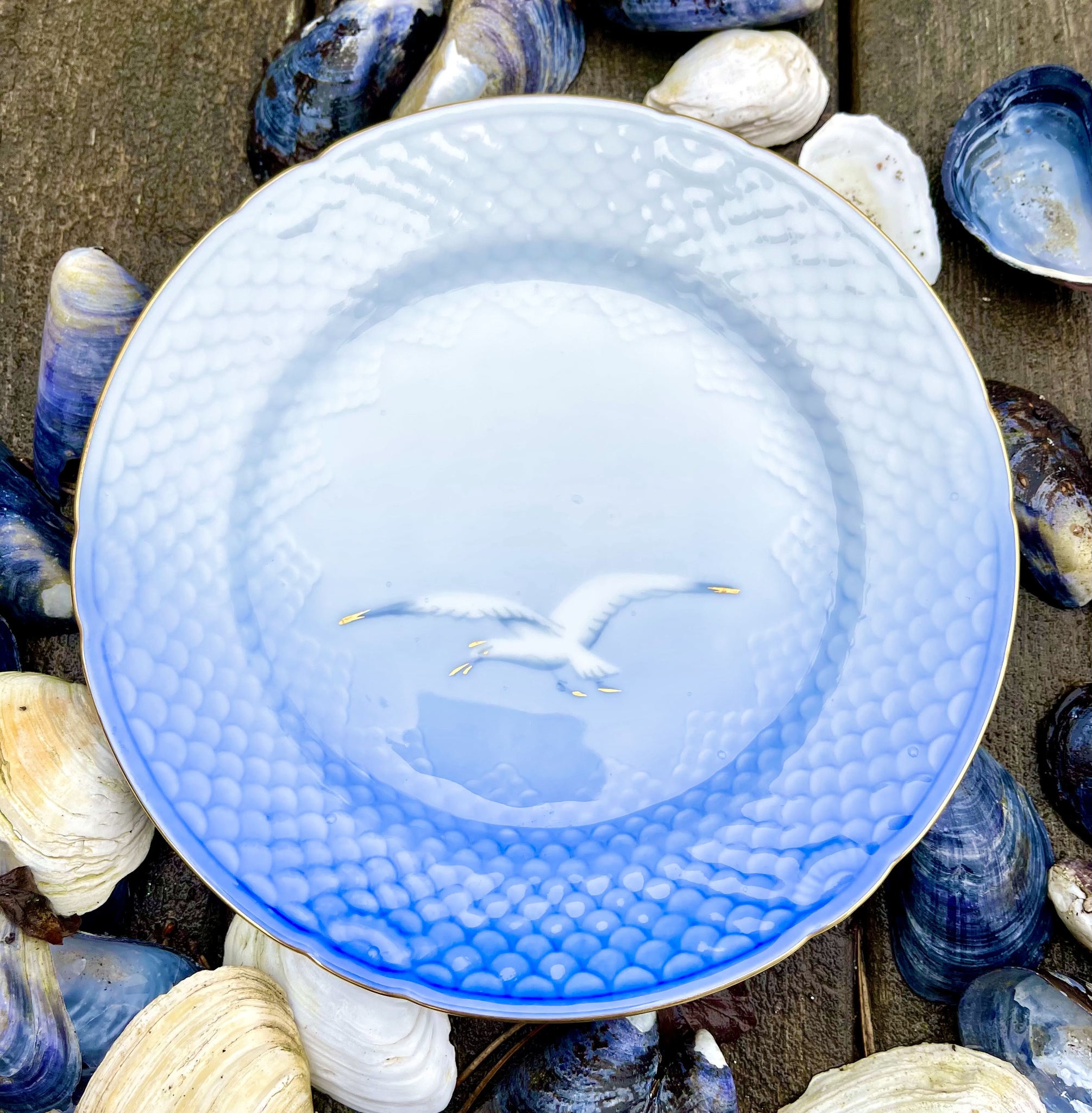 En riktig klassiker! Assiett ur Bing & Grøndahls serie ?Blå Måsen?. Guldkant. Obetydligt bruksslitage. Diameter 17,5 cm. Se nedan hur många som finns kvar i lager.