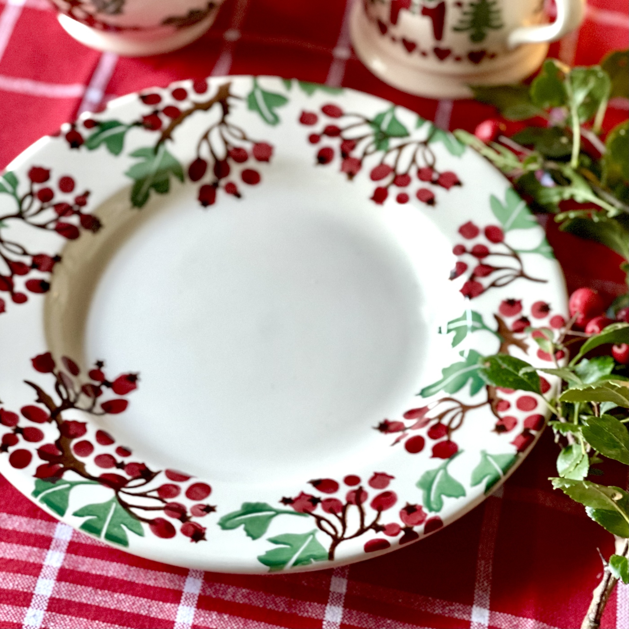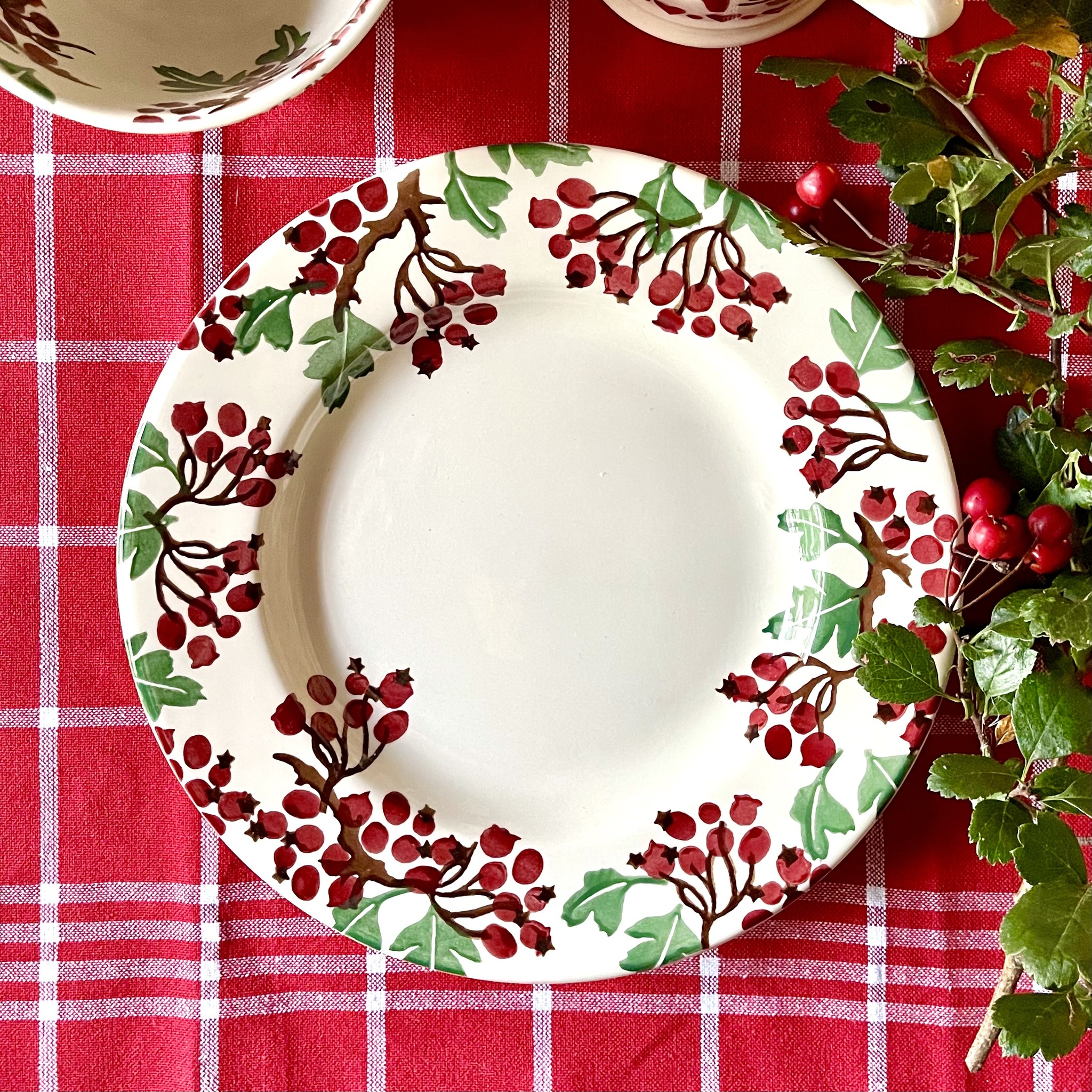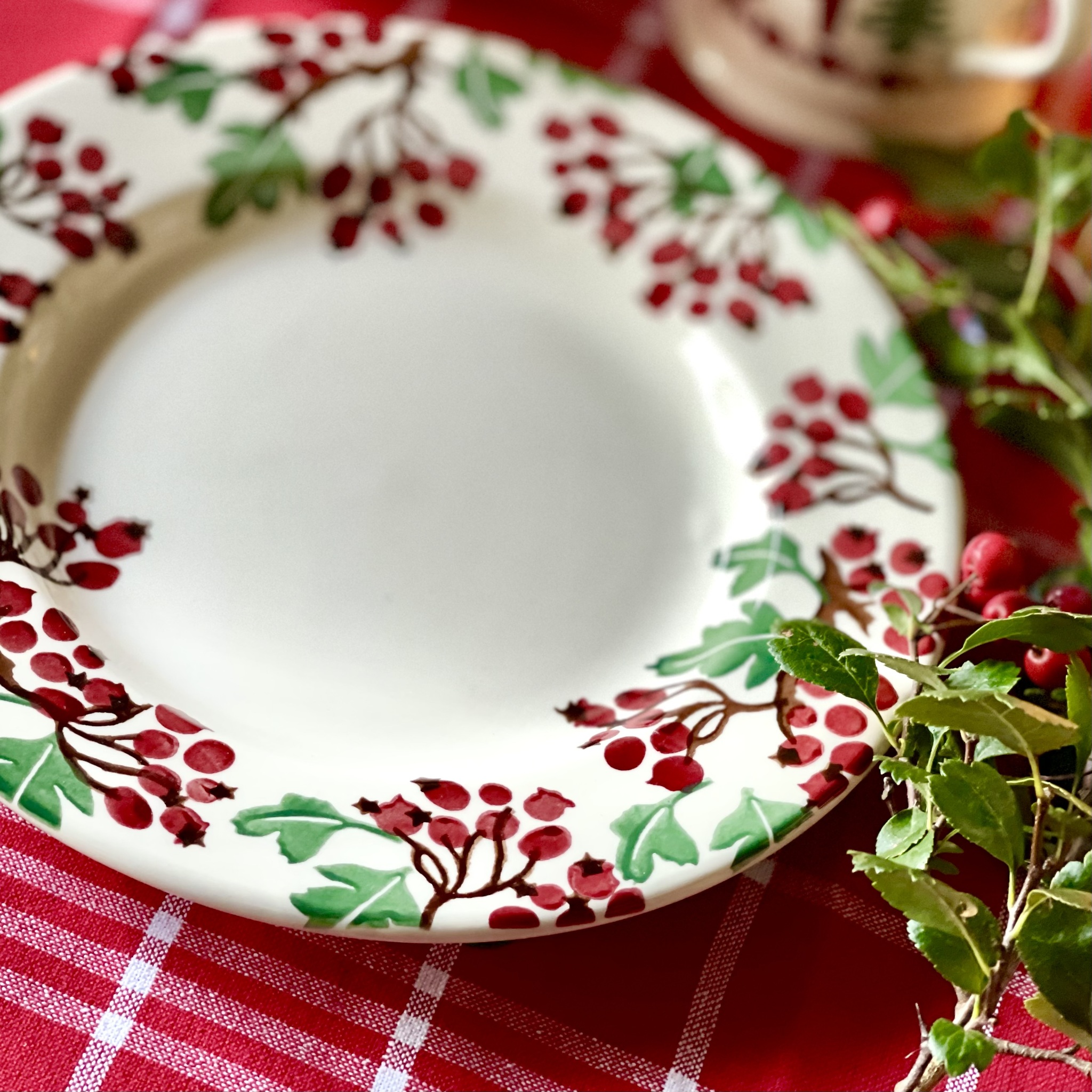 Vacker assiett av finaste porslin från Emma Bridgewater med mönstret “Hawthorn Berries”. Tål maskindisk och micro. Diameter 22 cm.