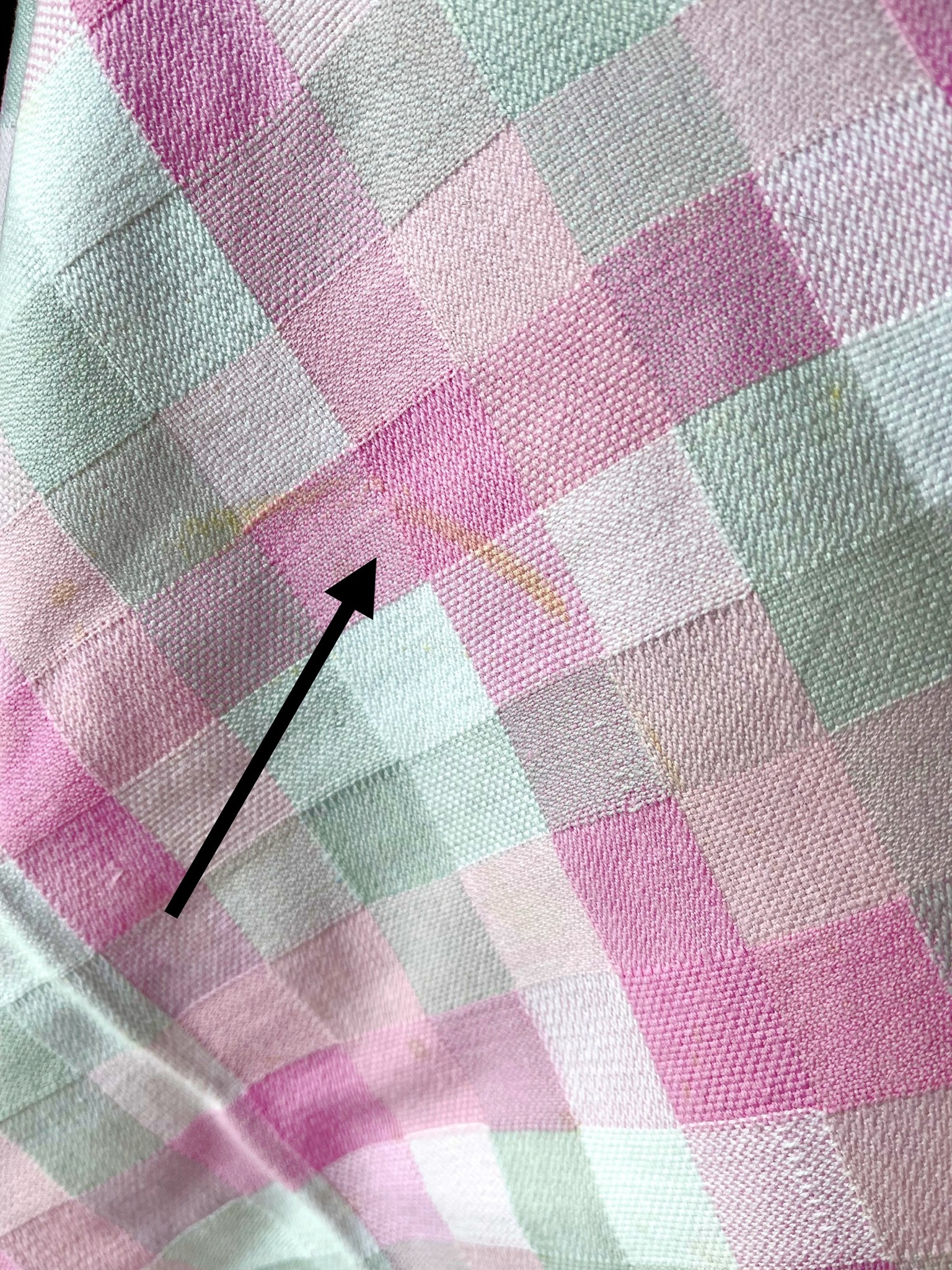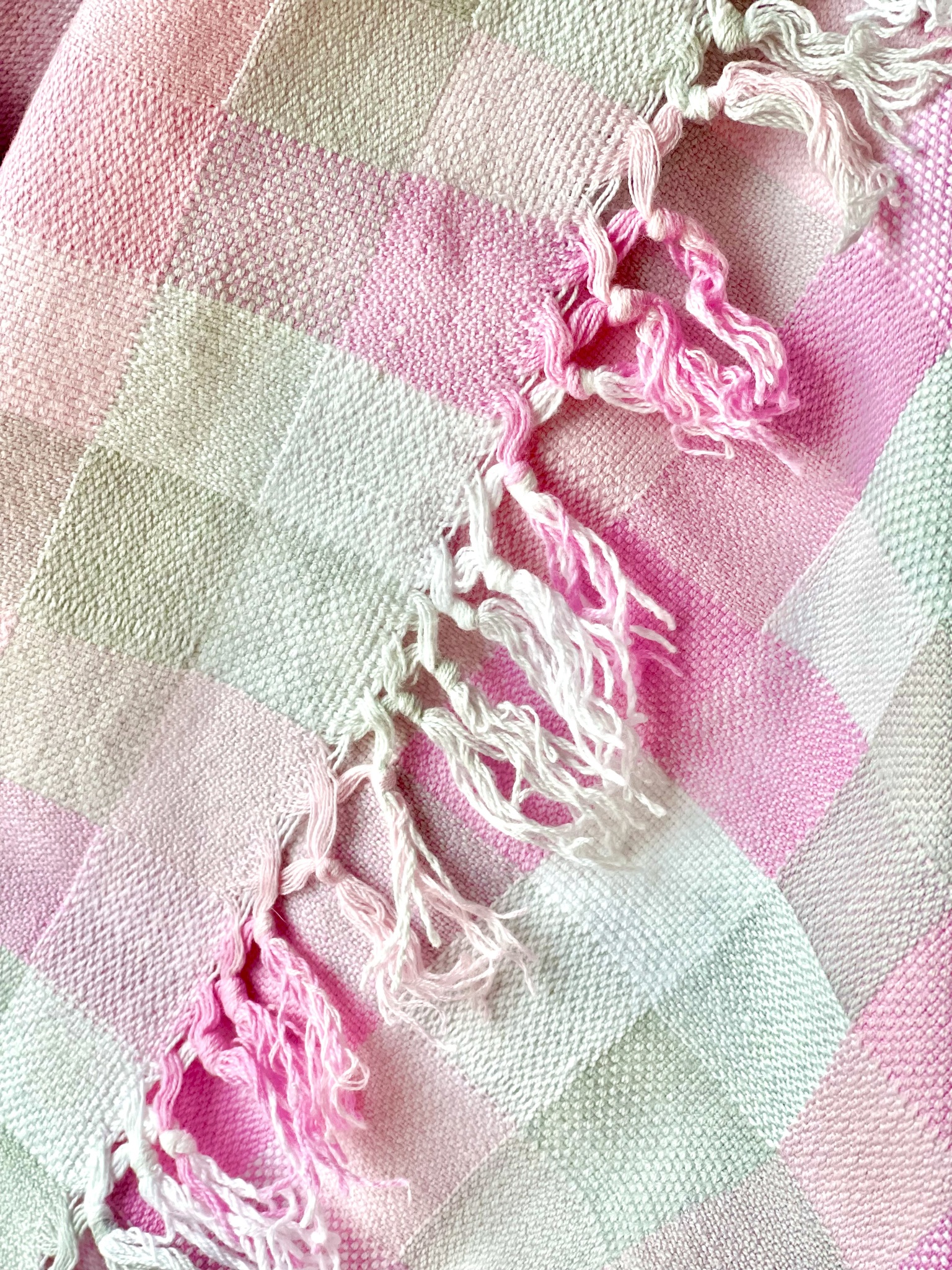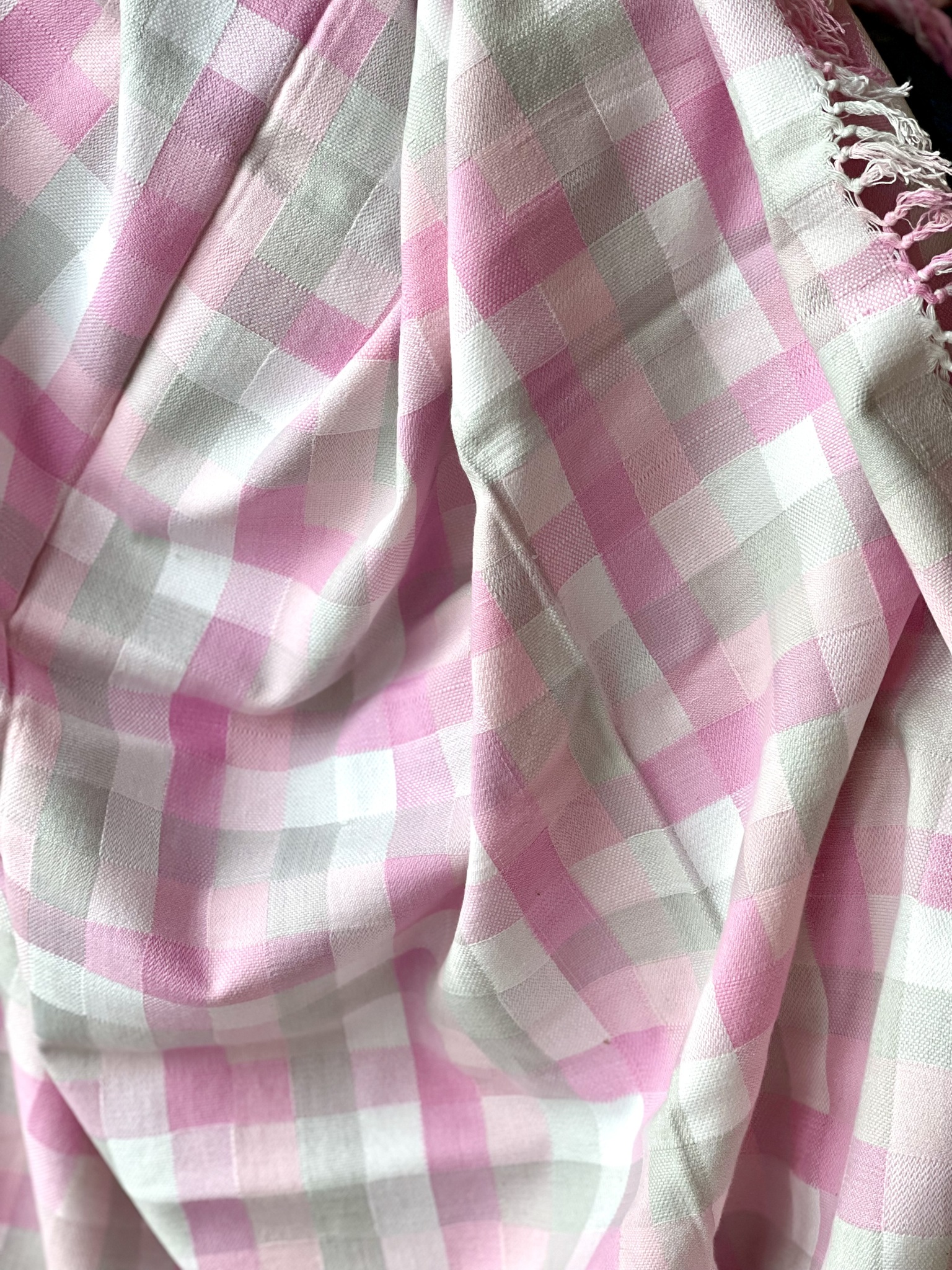 Rutig bordsduk i bomull med frans i pastelliga färger. Obetydligt bruksslitage men det förekommer en fläck av okänt ursprung, se sista bilden. Mått ca 185×140 cm.