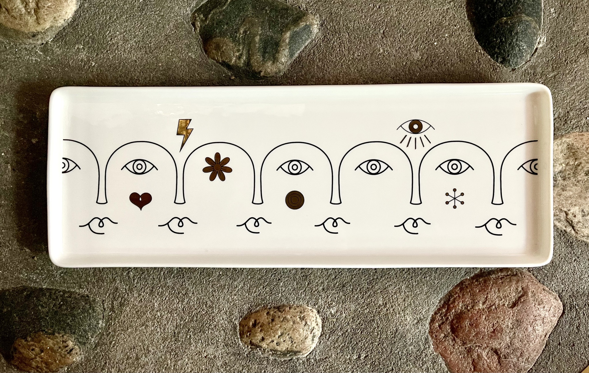 Rektangulär bricka av porslin formgiven av Jonathan Adler för HM Home 2019. Vit med svarta mönster och accenter i guld. Oanvänd, nyskick, NOS (New Old Stock). Handdisk. Ej micro. Längd 38 cm, bredd 14 cm.