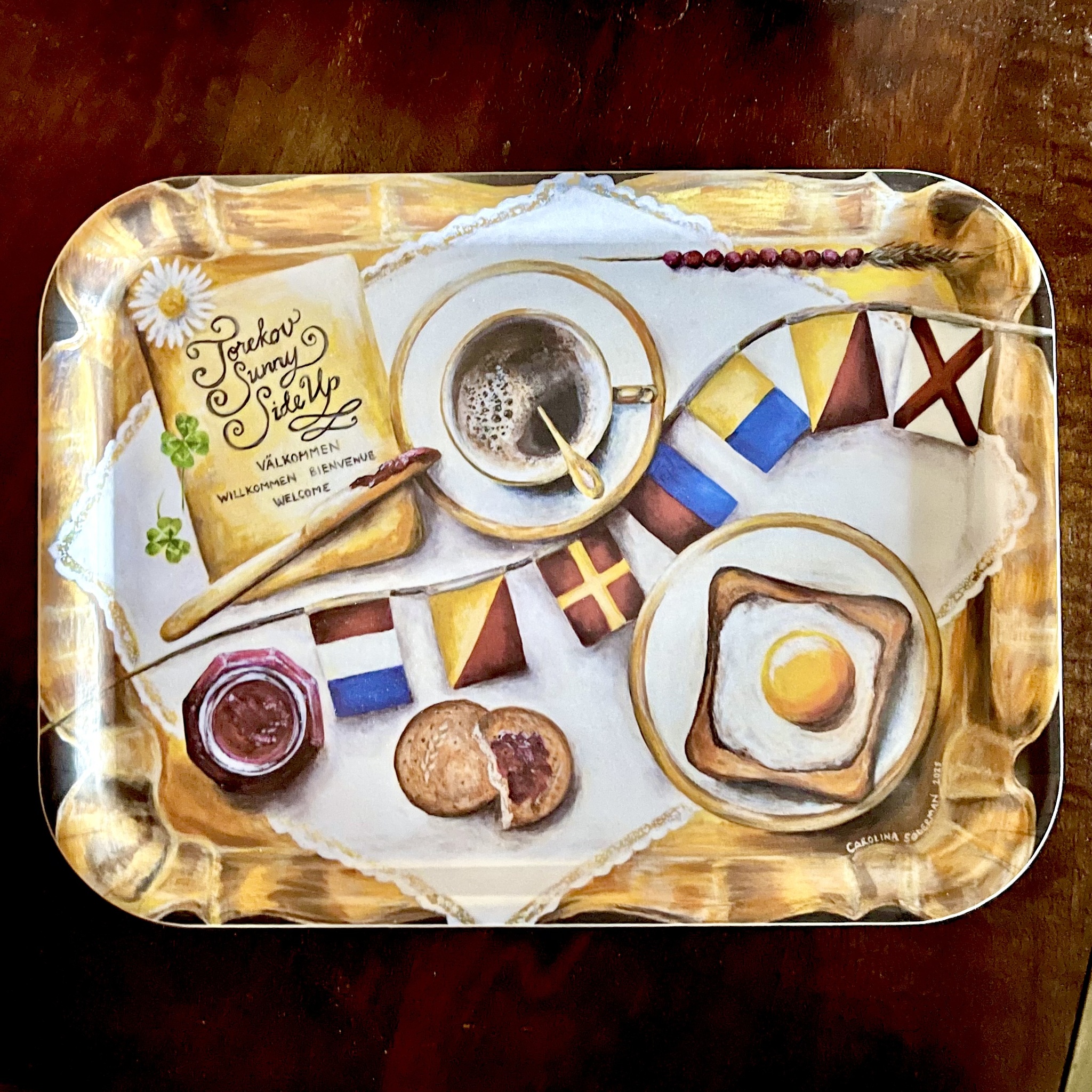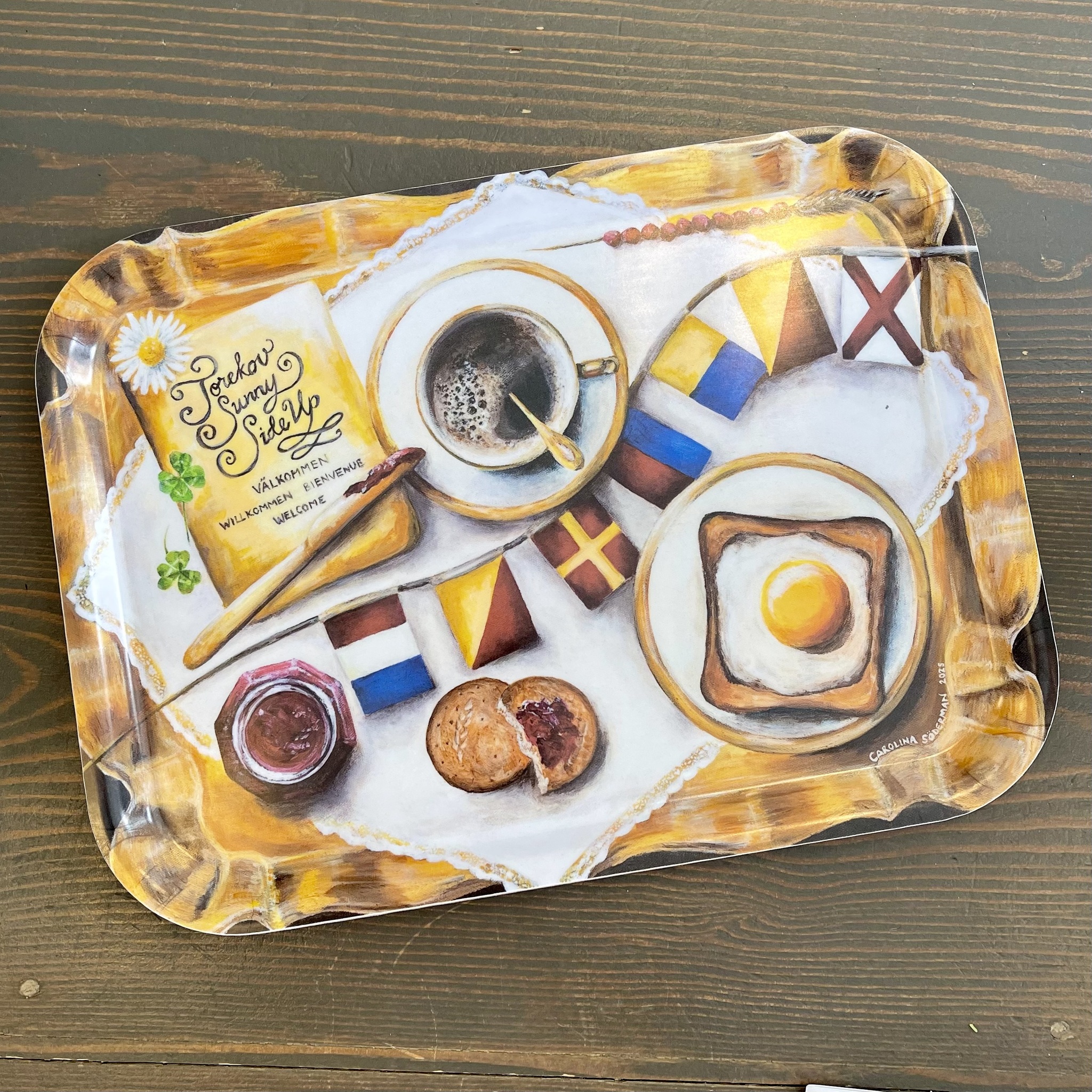 Bricka av trä 27×20 cm. ?TOREKOV – Sunny Side Up? med motiv av Carolina Söderman.?Torekov för mig är som en gyllene kaffebricka en sommarmorgon när solen skiner. Tunt porslin med guldkant som klingar