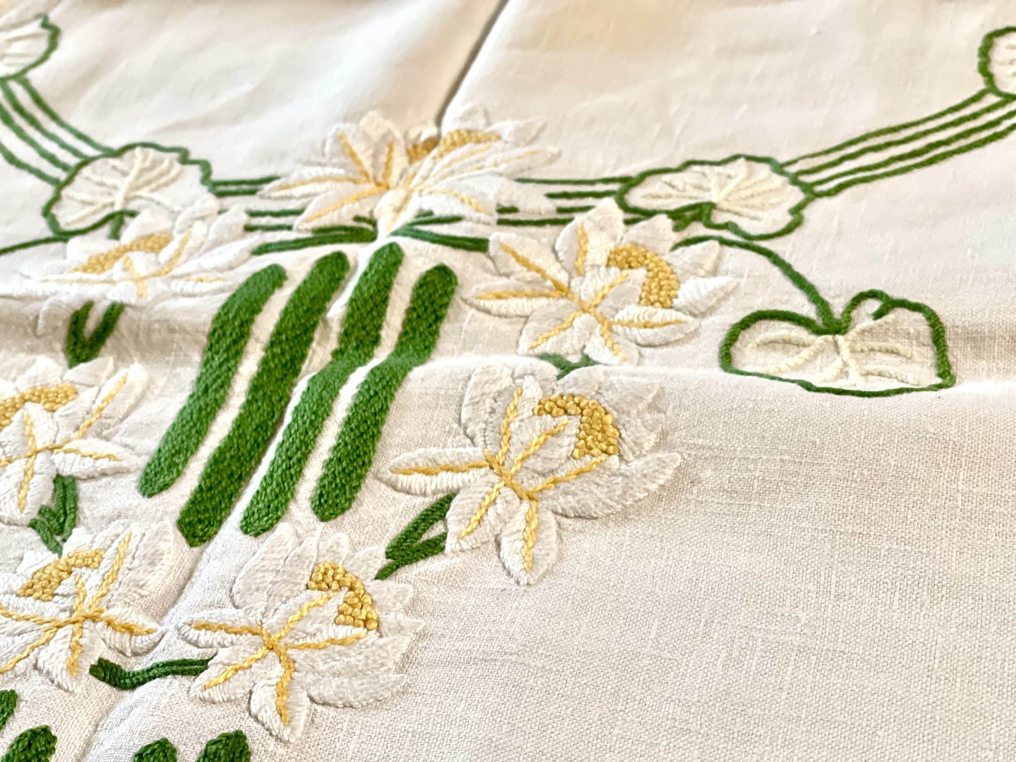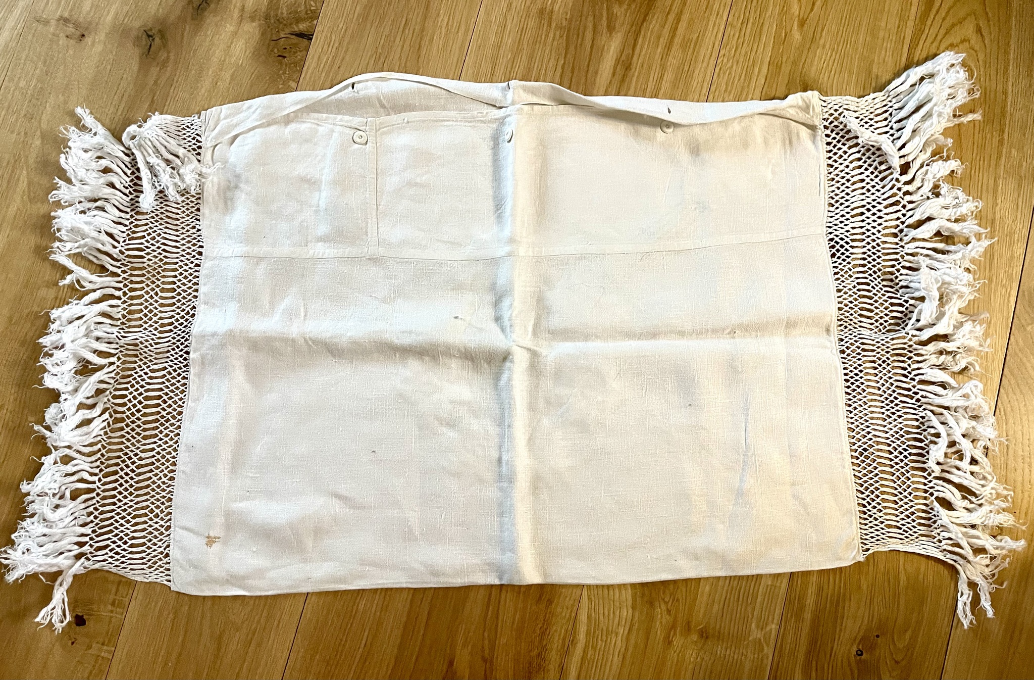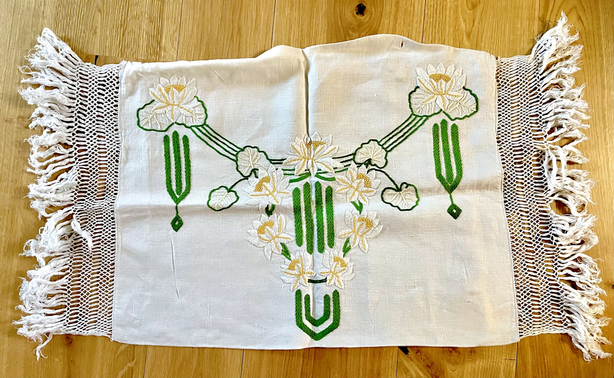 Kuddfodral av linne med broderade näckrosor och fransar. Tillsluts med hjälp av knappar. Liten fläck av okänt ursprung på baksidan, se sista bilden. Passar för innerkudde med cirkamåtten 50×37 cm.