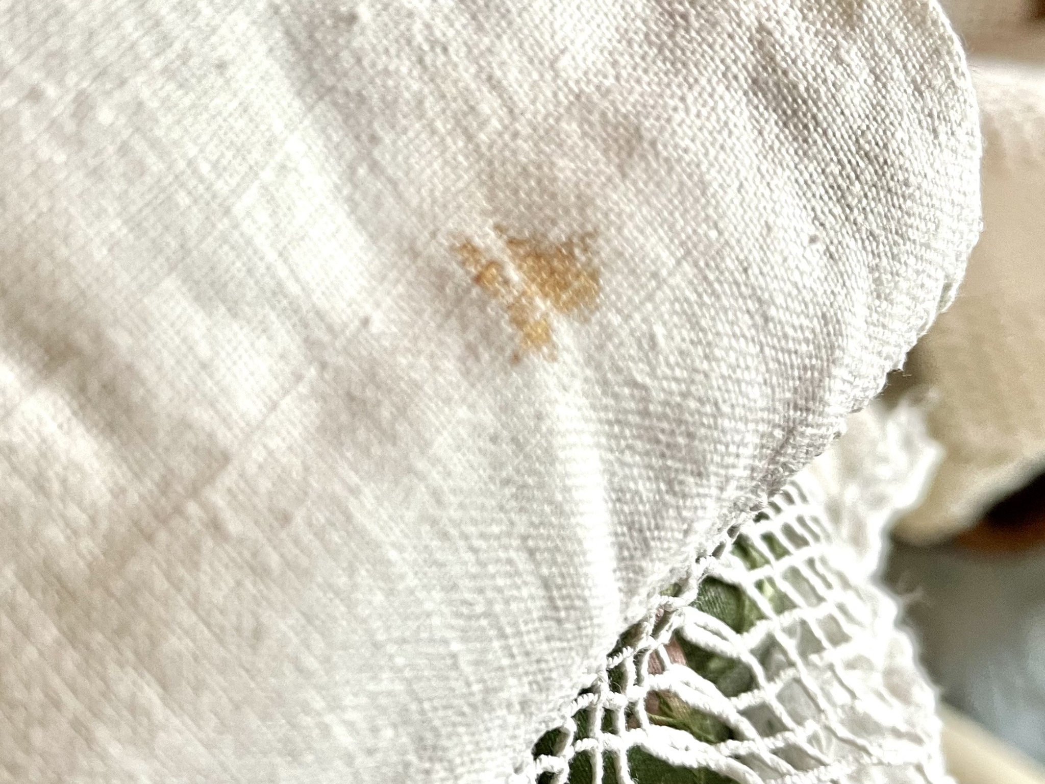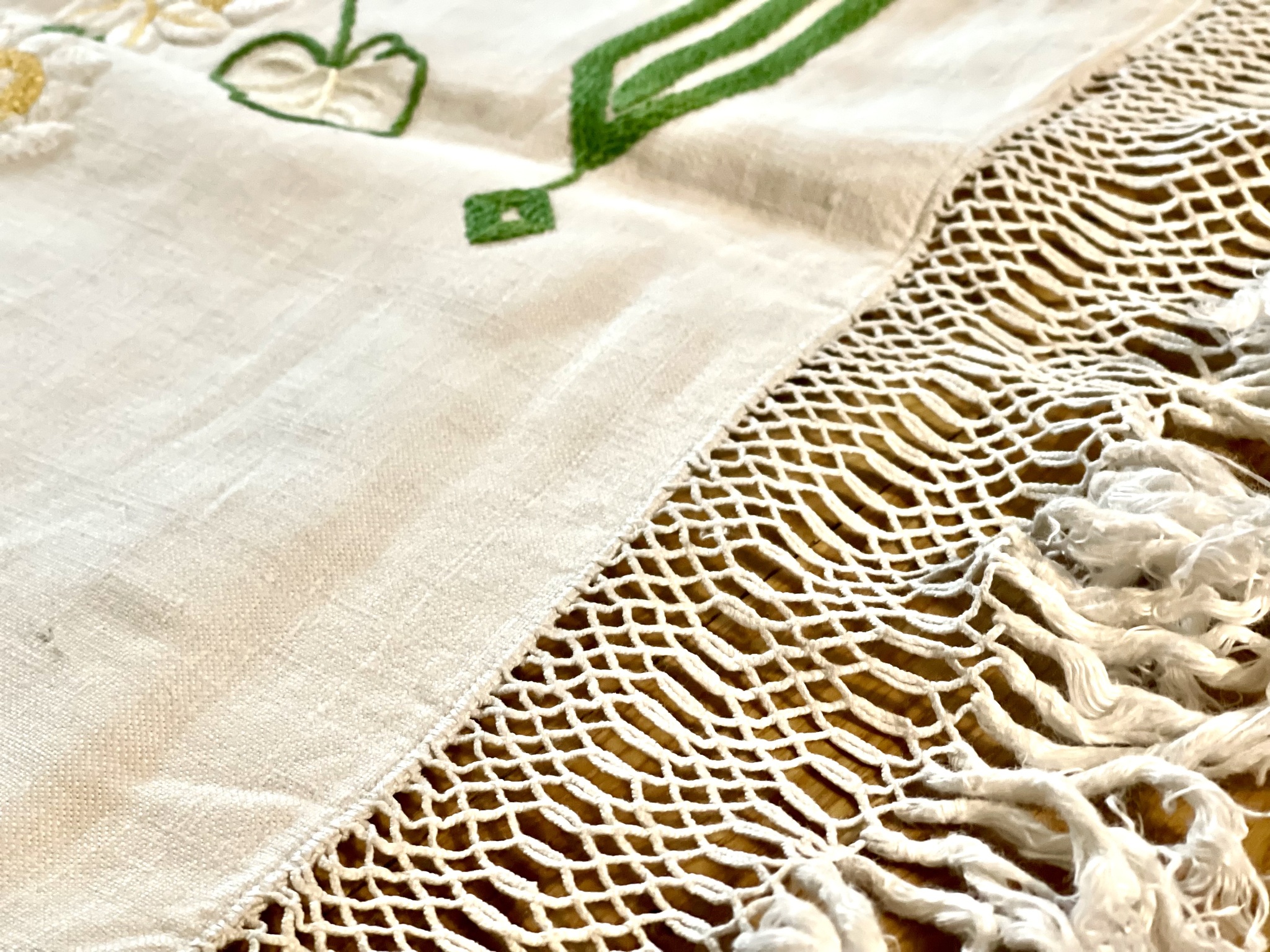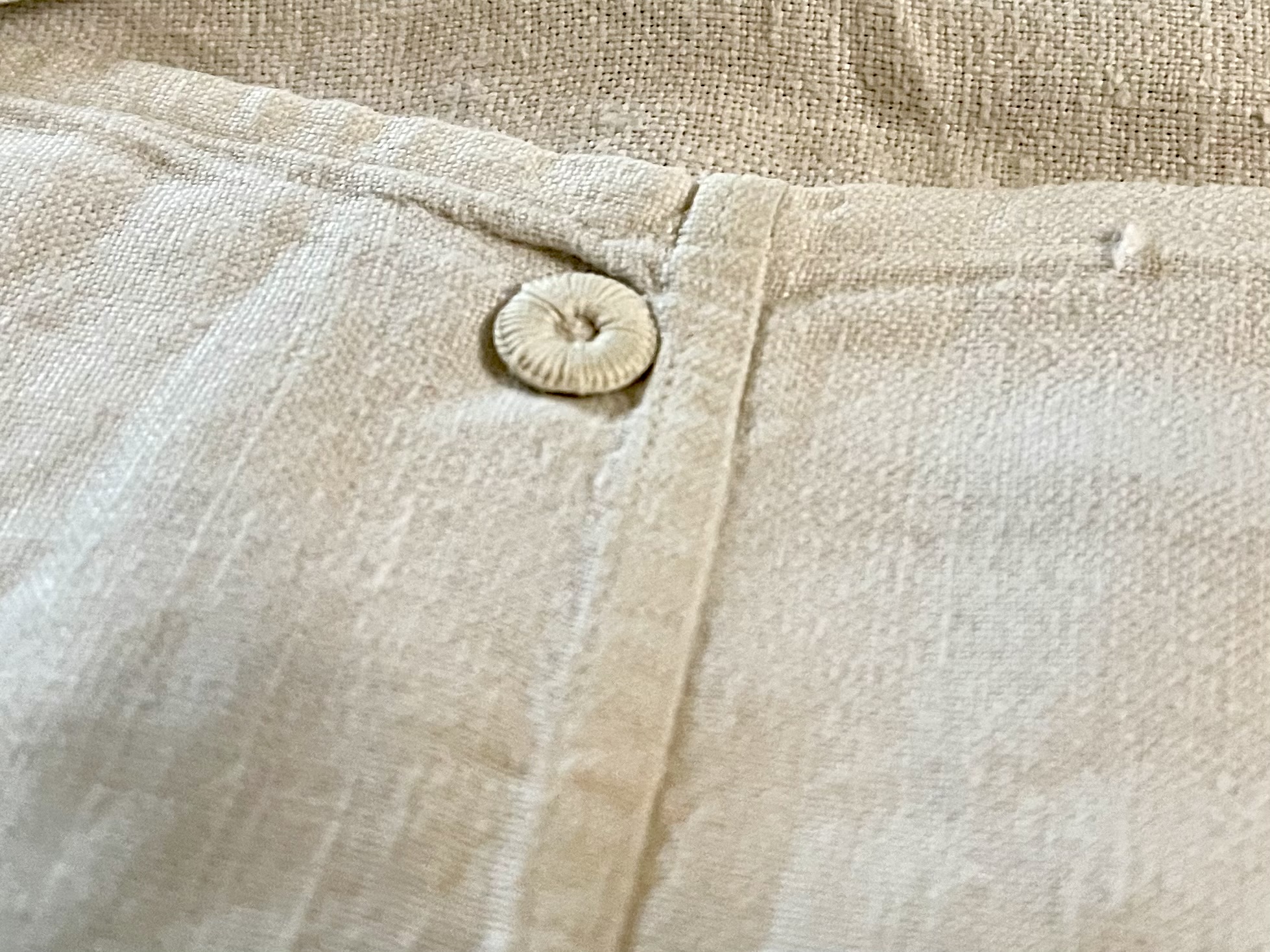Kuddfodral av linne med broderade näckrosor och fransar. Tillsluts med hjälp av knappar. Liten fläck av okänt ursprung på baksidan, se sista bilden. Passar för innerkudde med cirkamåtten 50×37 cm.