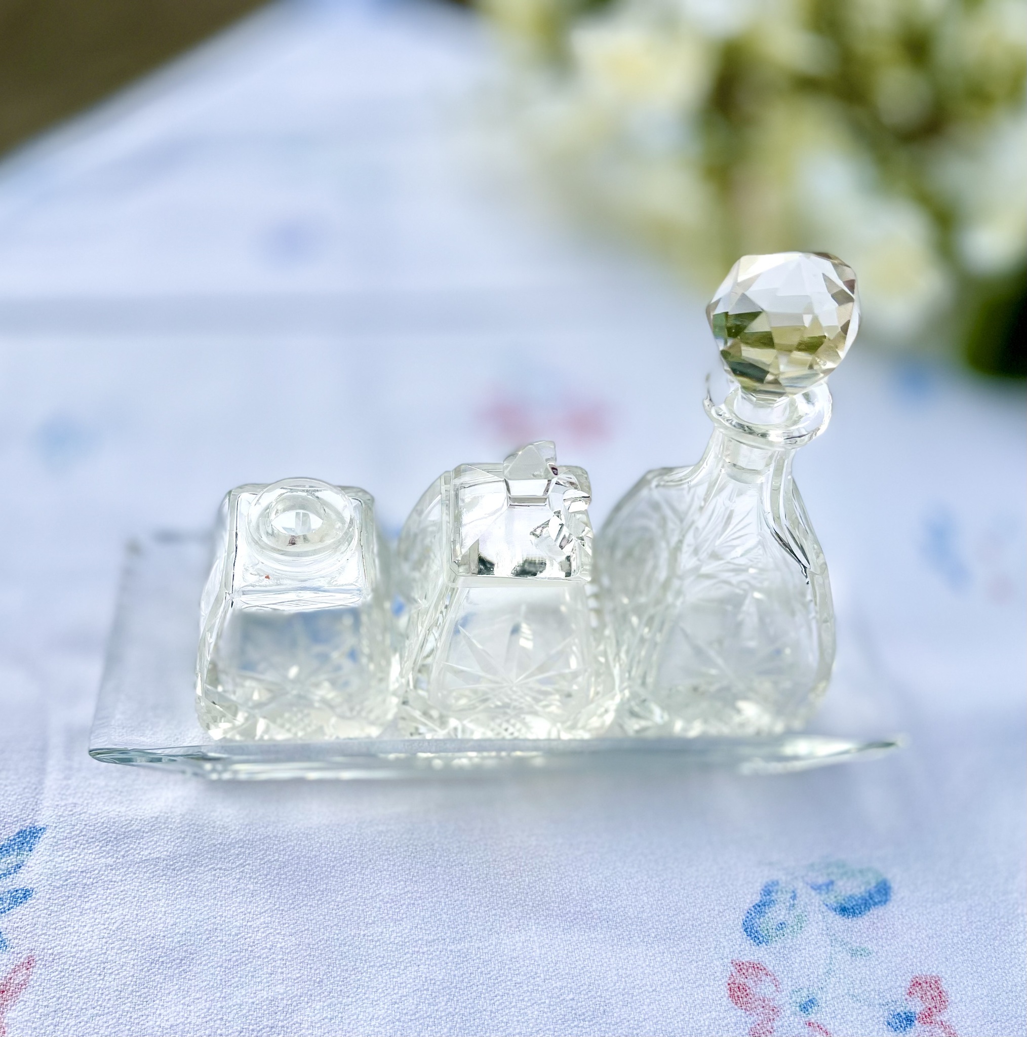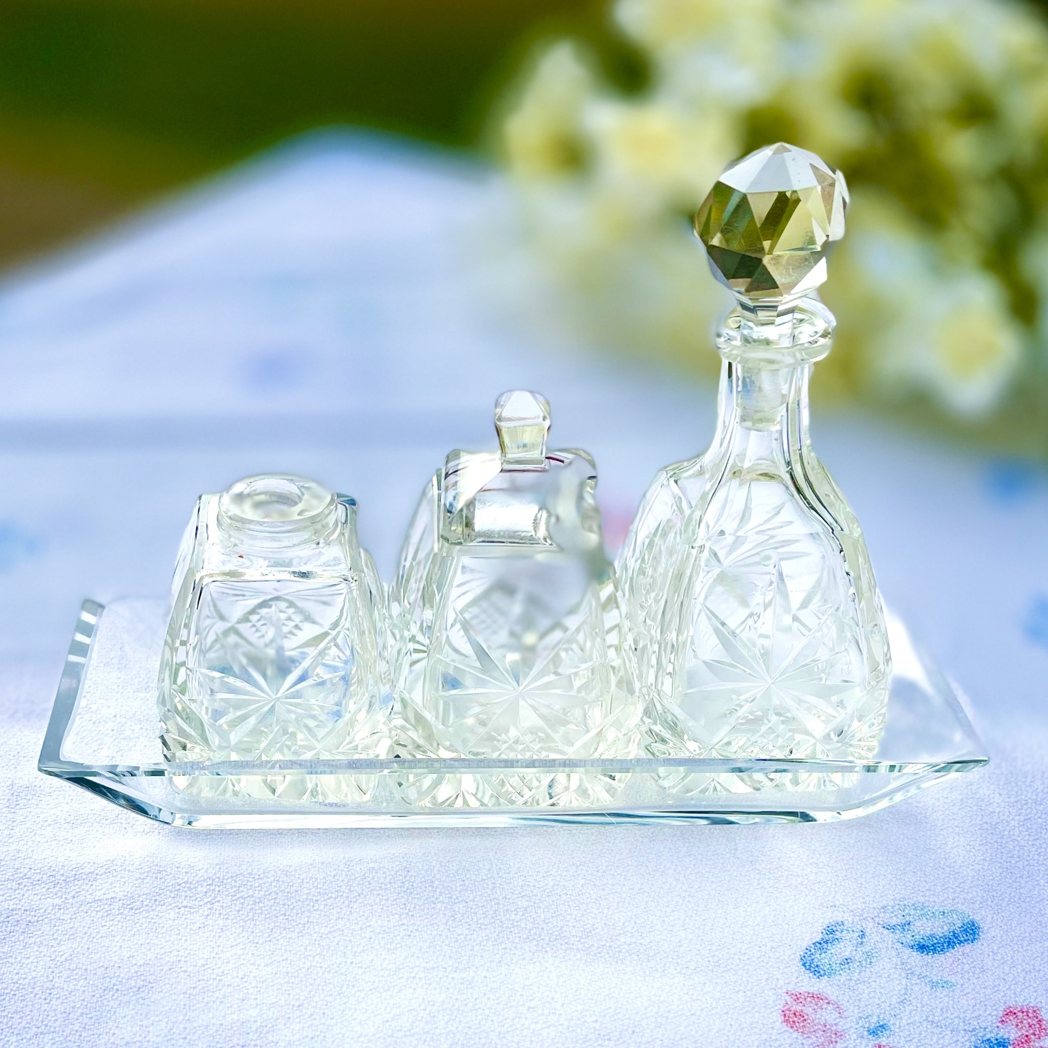 Elegansen blir total när du dukar med detta cruet set från förr. Ett lock/kork saknas. Bruksslitage, bär spår av användning, kalk/vätskebeläggning inuti den höga flaskan. Höjd 12,5 cm, längd 19,5 cm.