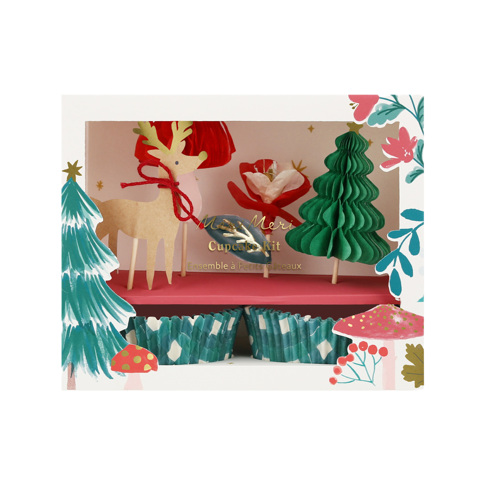 Set med cupcakeformar och toppers med vintertema. Setet innehåller 24 toppers – 6 gröna honeycombgranar, 6 röda honeycombsvampar, 6 renar och 6 blommor.