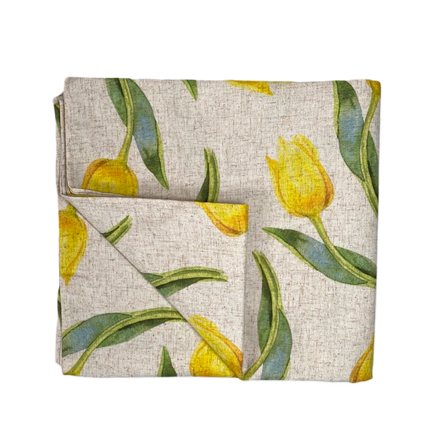 Nu blommar duken! Piffa vår- och påskbordet med gula tulpaner. Duken tvättas enkelt i maskin vid behov. Tillverkad i en polyesterkvalitet som har en känsla och struktur av linne. Mått 260 cm x 140 cm. 100% Polyester.