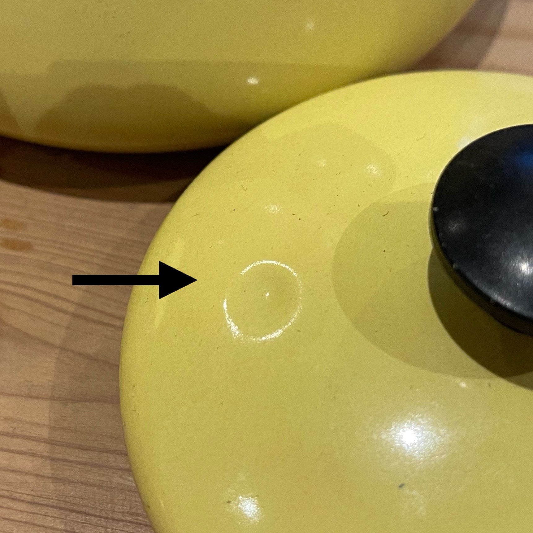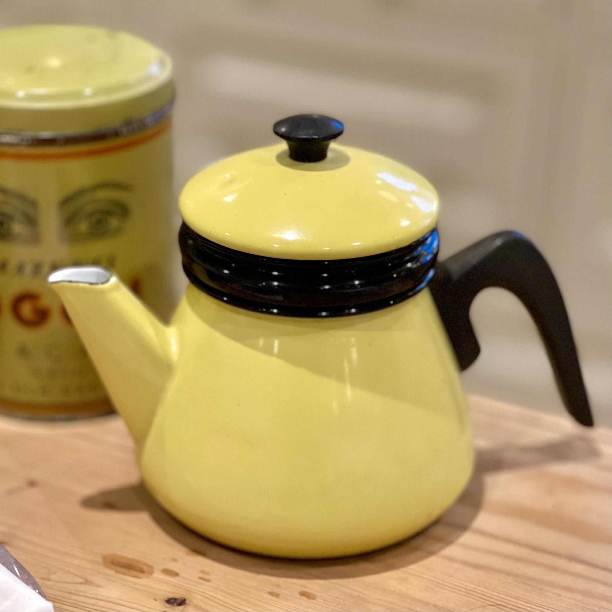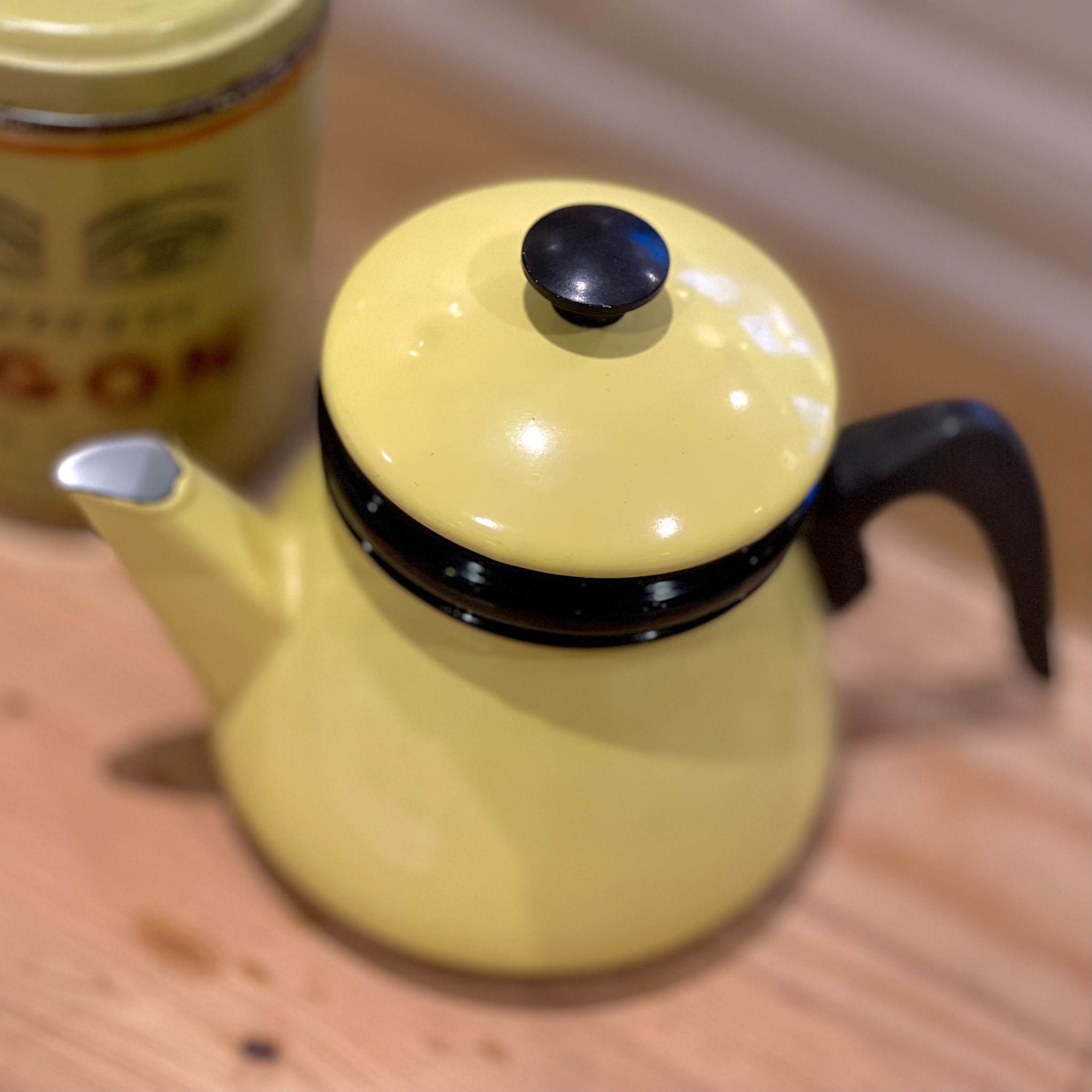 Underbar gul retrokanna av emalj. Bruksslitage, liten buckla på locket. Höjd med lock 17 cm, bredd 12 cm, längd 22 cm.