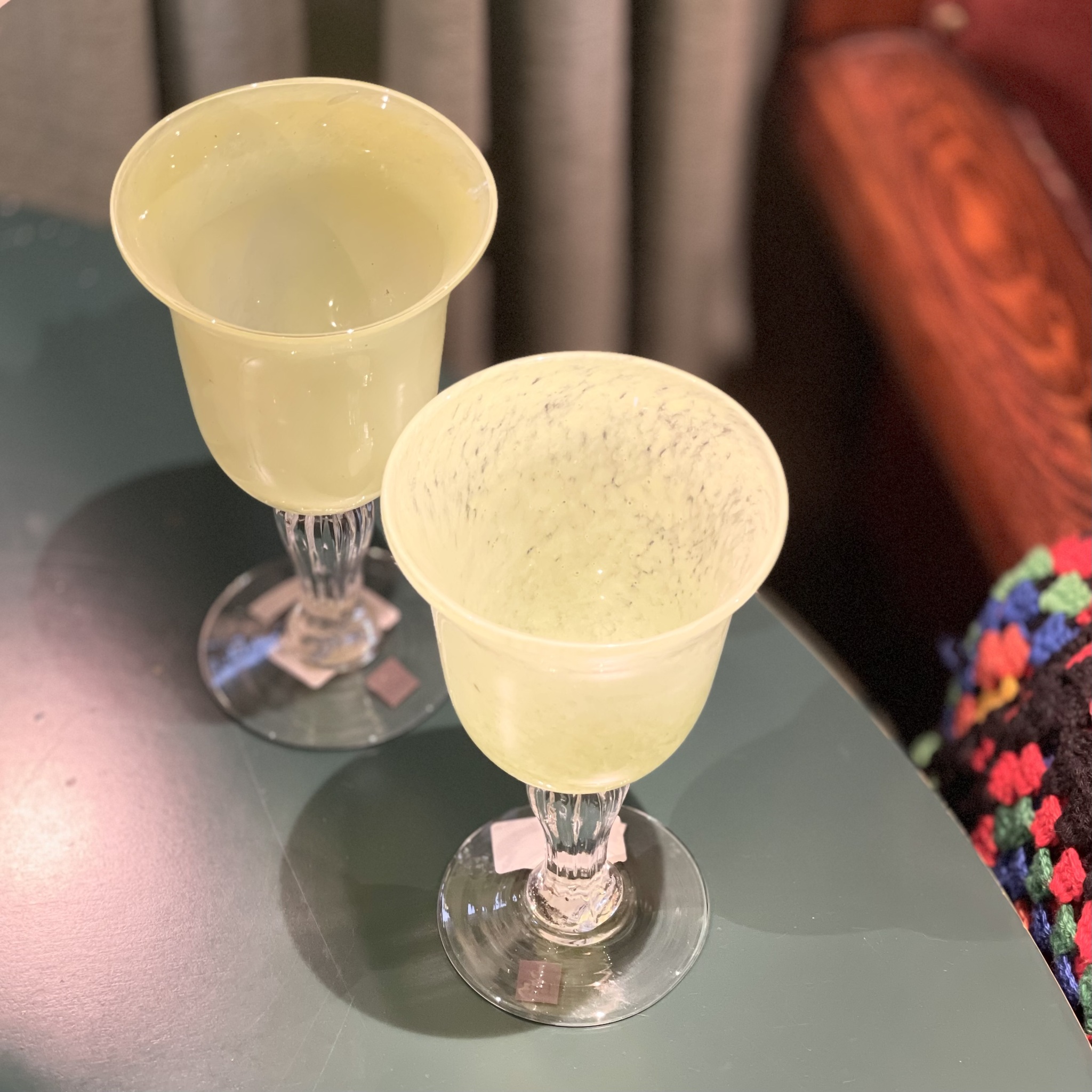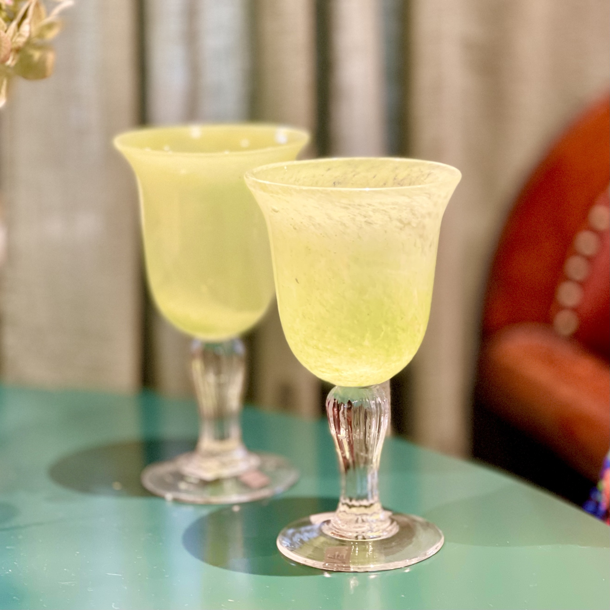 Äppelgröna glas på fot från SIA Home Fashion. Glasen är handblåsta och handmålade och därför inte exakt likadana. NOS (New Old Stock) innebär att glasen är nya och oanvända och tillhör en kollektion som inte tillverkas längre. Priset är för paret. Höjd 19 cm. Handdisk.