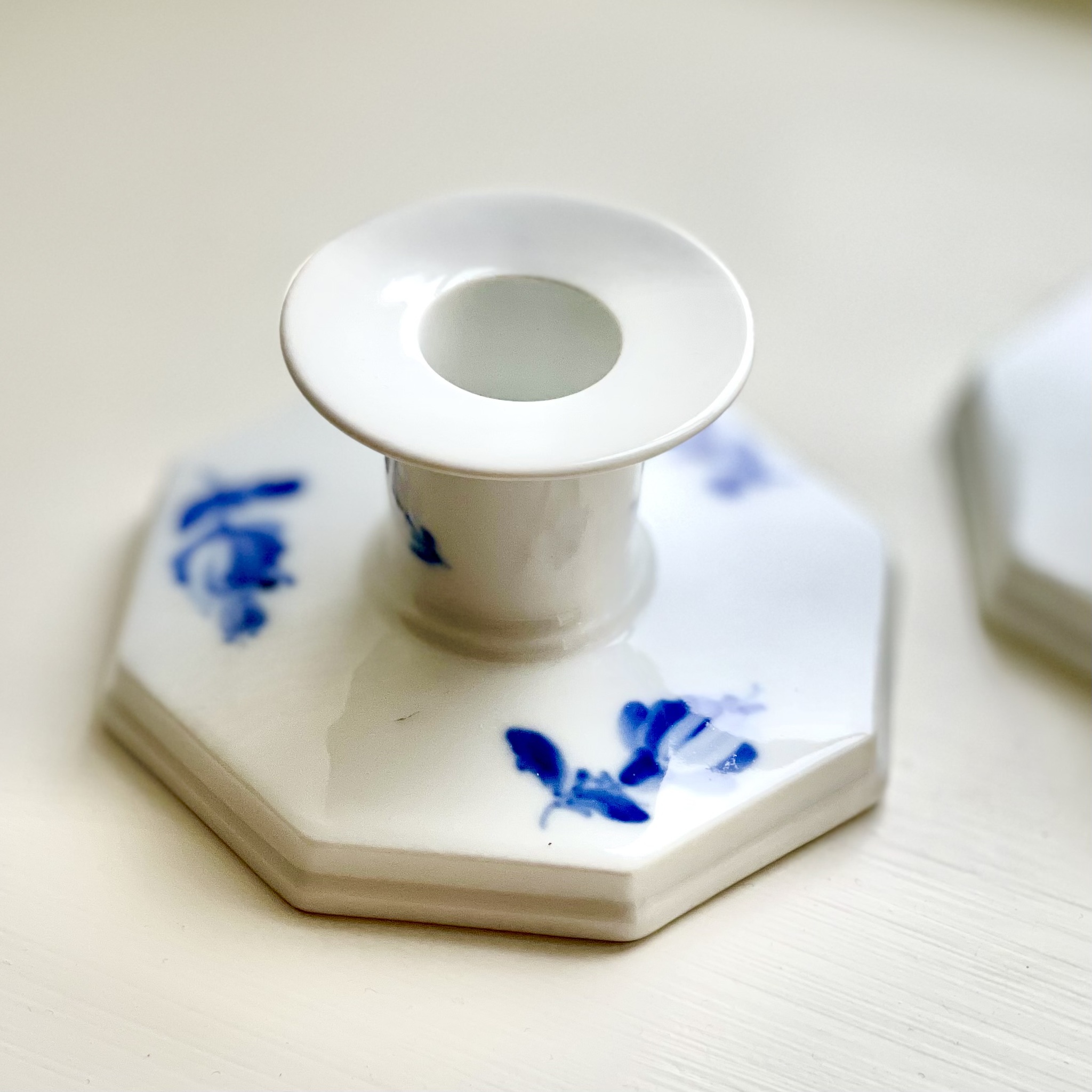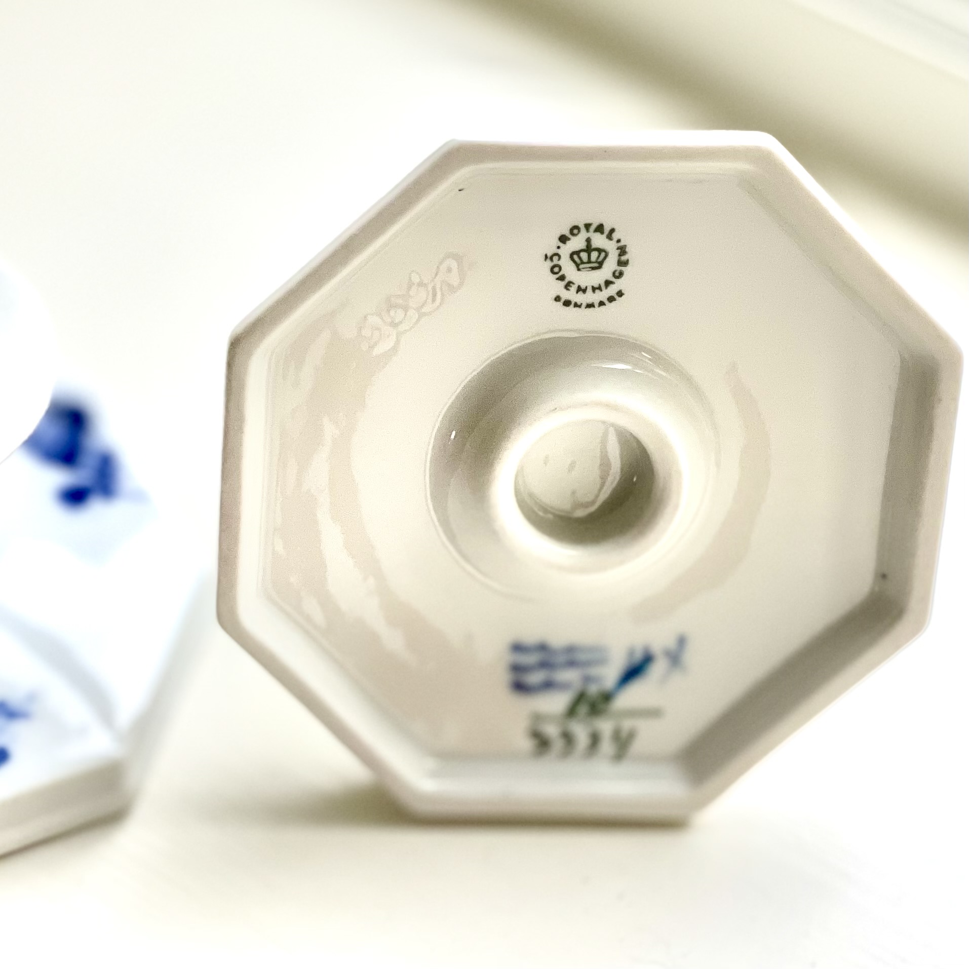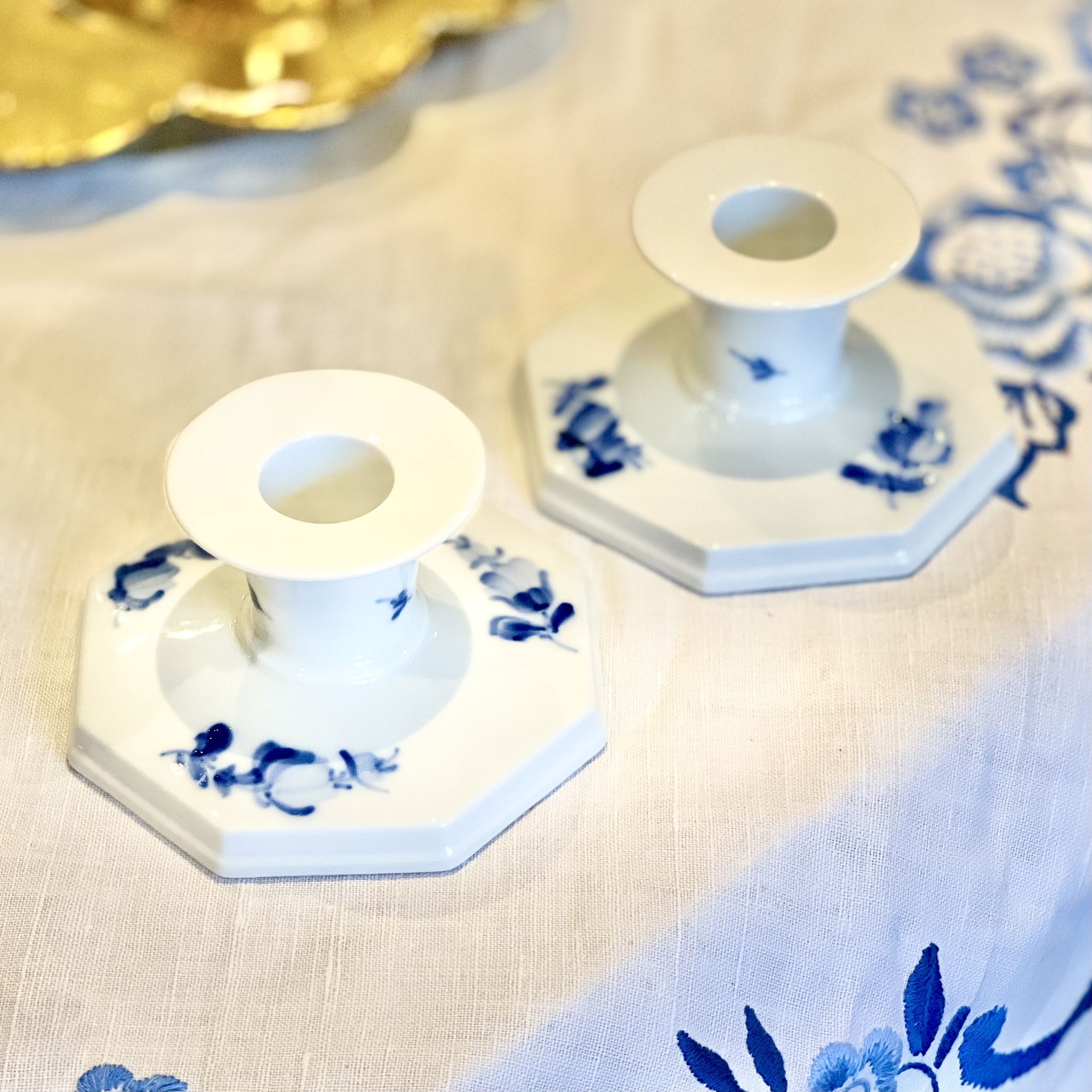 Ett par ljusstakar av porslin ur klassiska serien ?Blå blomster? från Royal Copenhagen. Nyskick. Höjd 5,5 cm, bredd 10 cm.