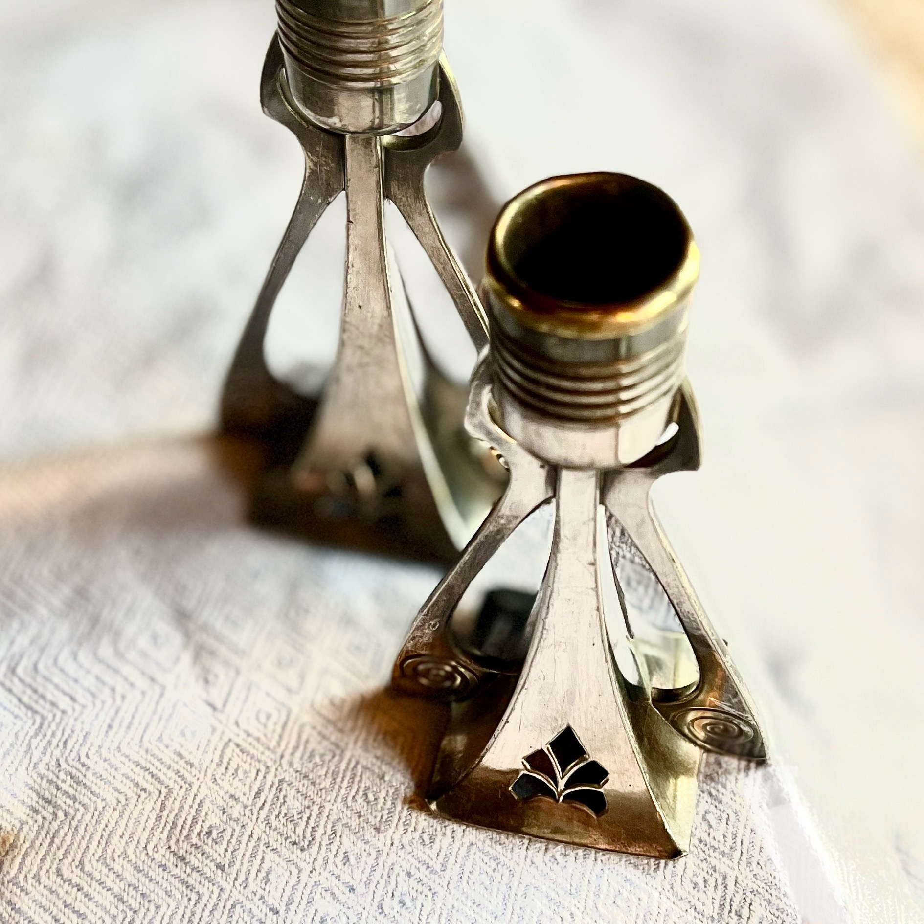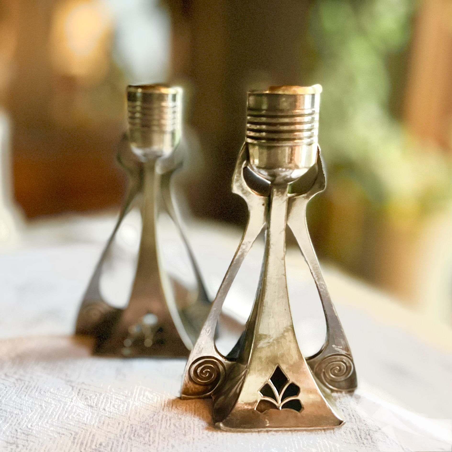 Ett par nätta ljusstakar i jugendstil. Bruksslitage, repor, spår av stearin i ljuskopparna. Stämplade, se bild. Höjd 13cm. Priset är för paret.