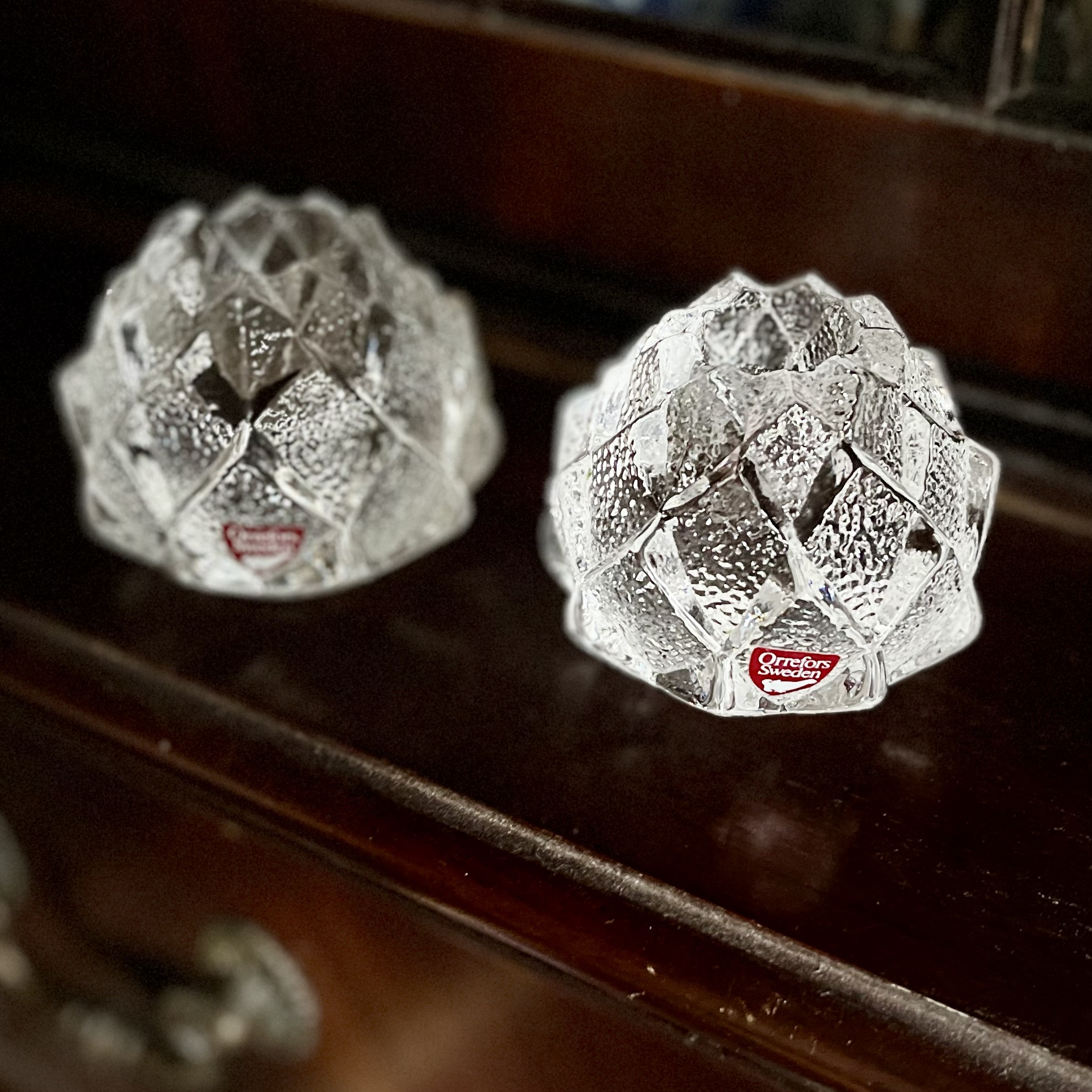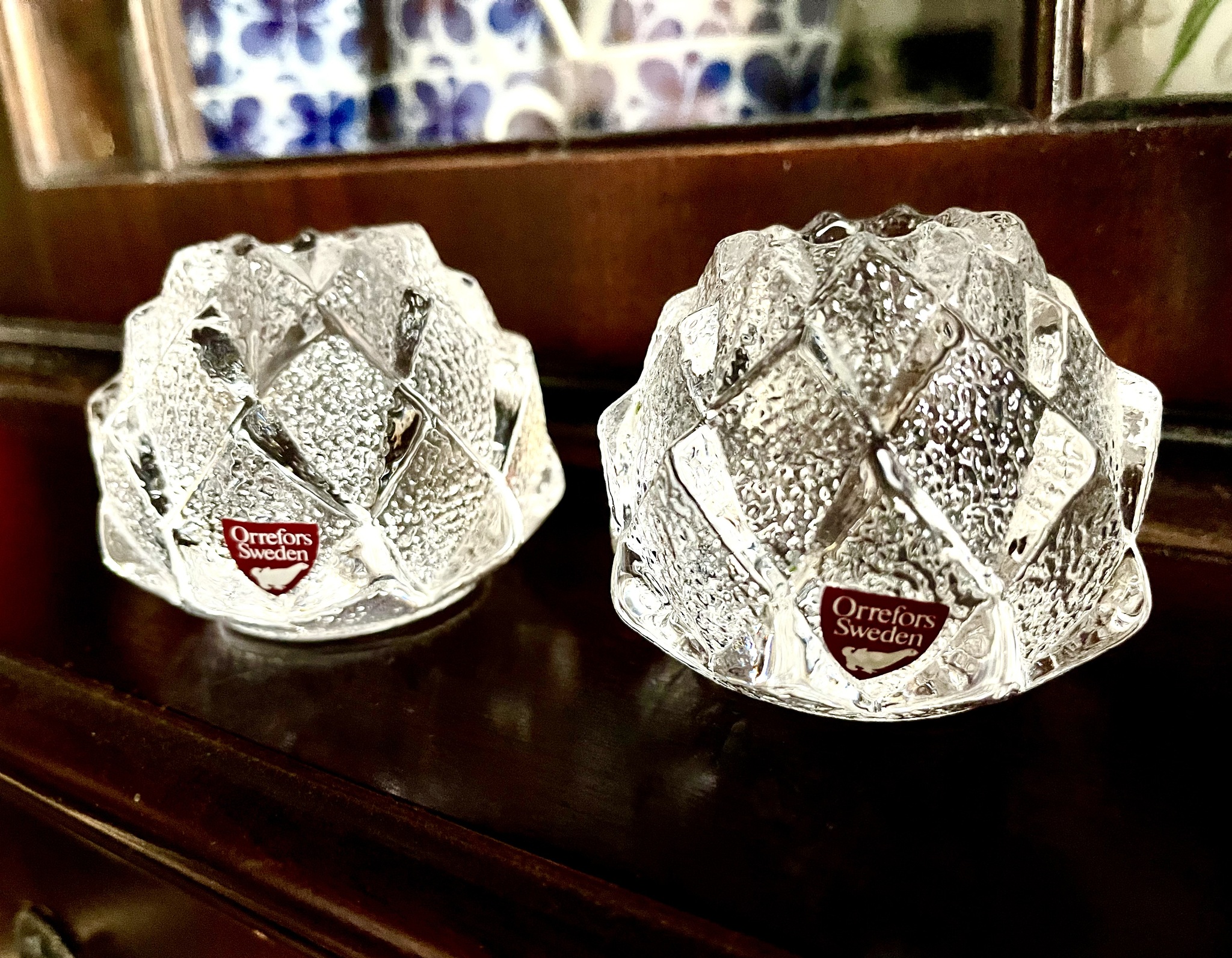 Ett par ljusstakar ?Nimbus? av kristall från Orrefors, design Berit Johansson. Det här är den ovanliga modellen för långa stearinljus. Etikettmärkta. Minimala rester av stearin i ljuskopparna men i övrigt är ljusstakarna i nyskick. Priset är för paret. Höjd 6 cm, diameter 7 cm.