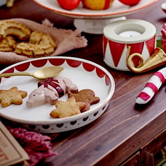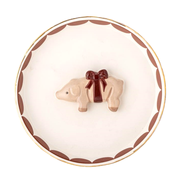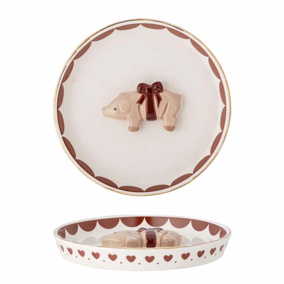 Gulligare julporslin får man leta efter! Rustikt och handmålat fat av stengods dekorerad med rosettförsedd gris. Diameter 18, höjd 3 cm.
