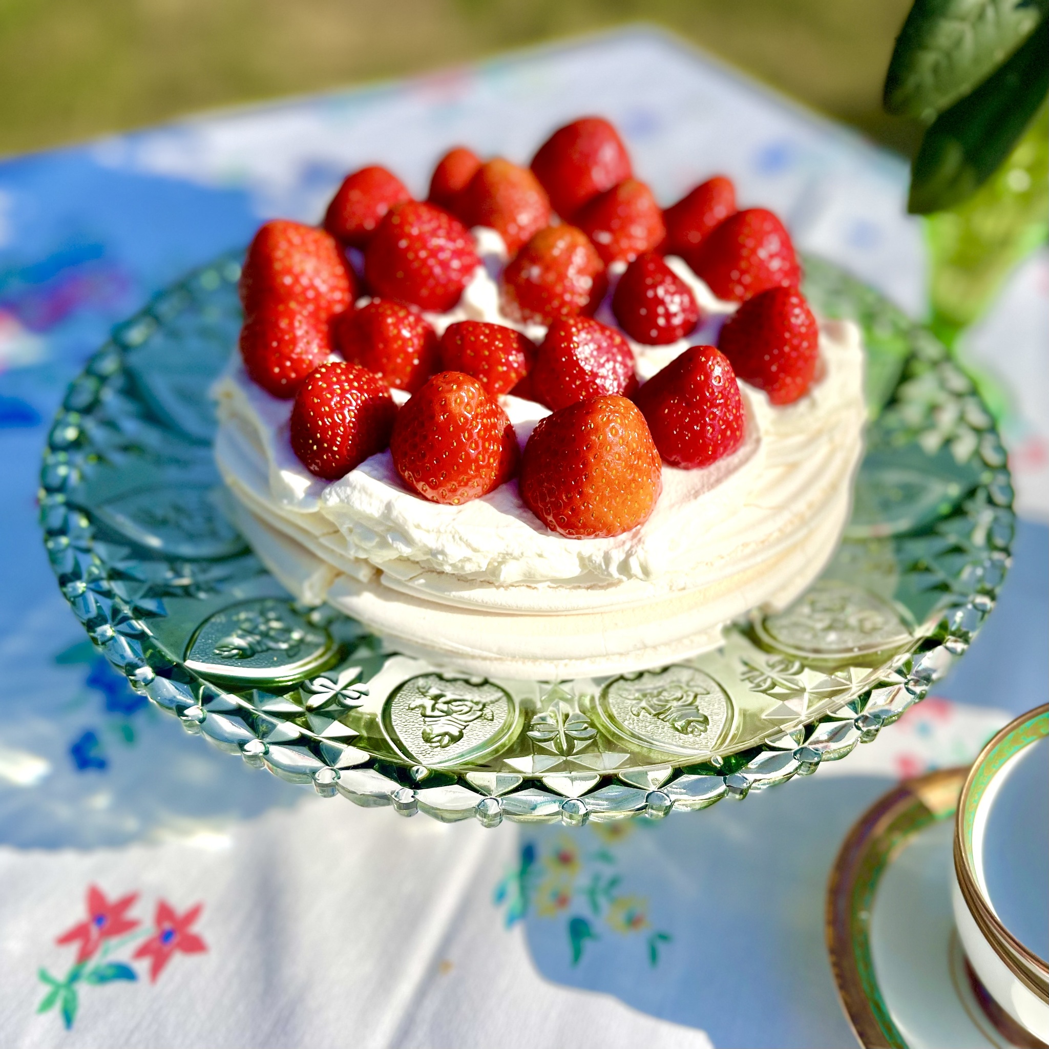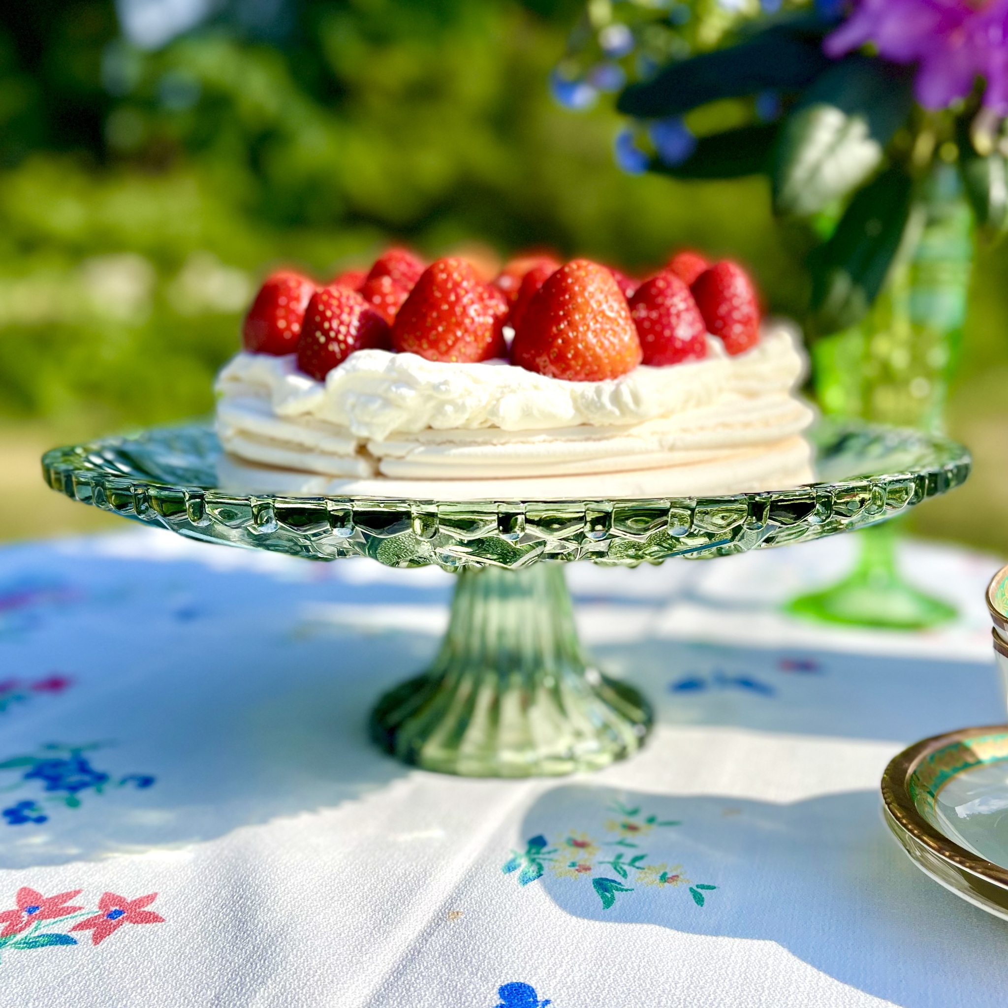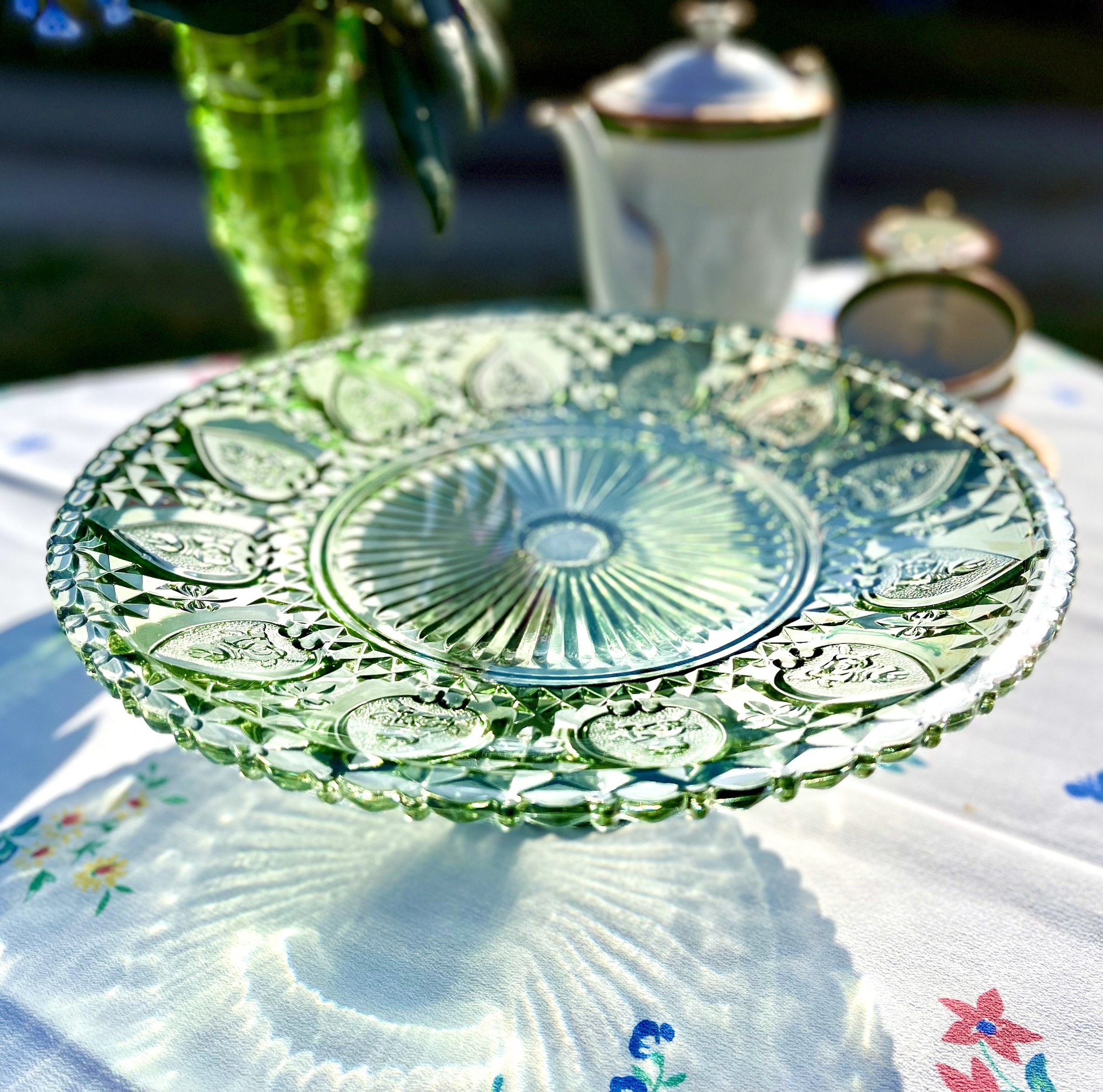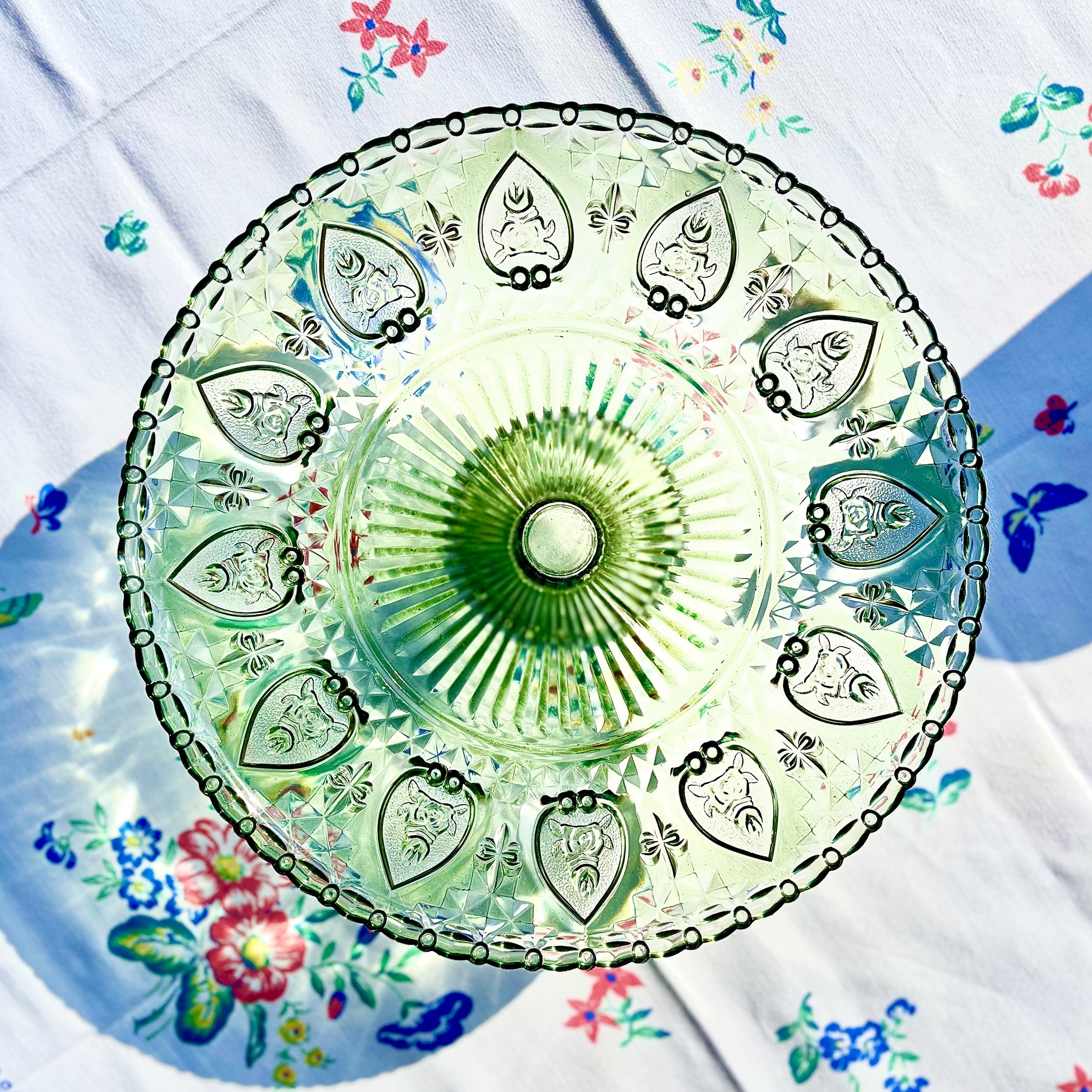 Klassiskt, romantiskt och elegant är detta fat på fot av grönt pressglas. Diameter 30 cm, höjd 10,5 cm.