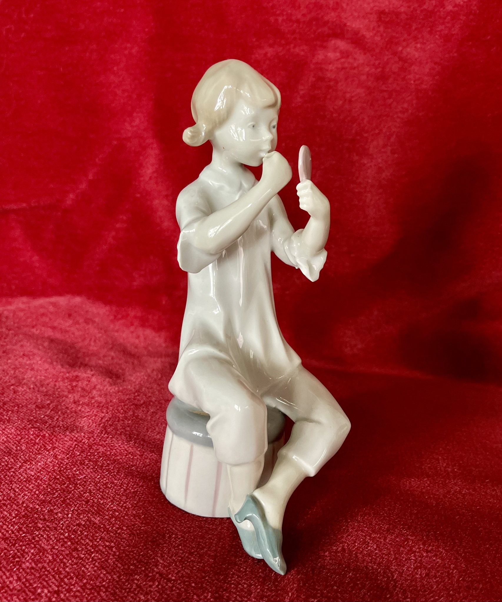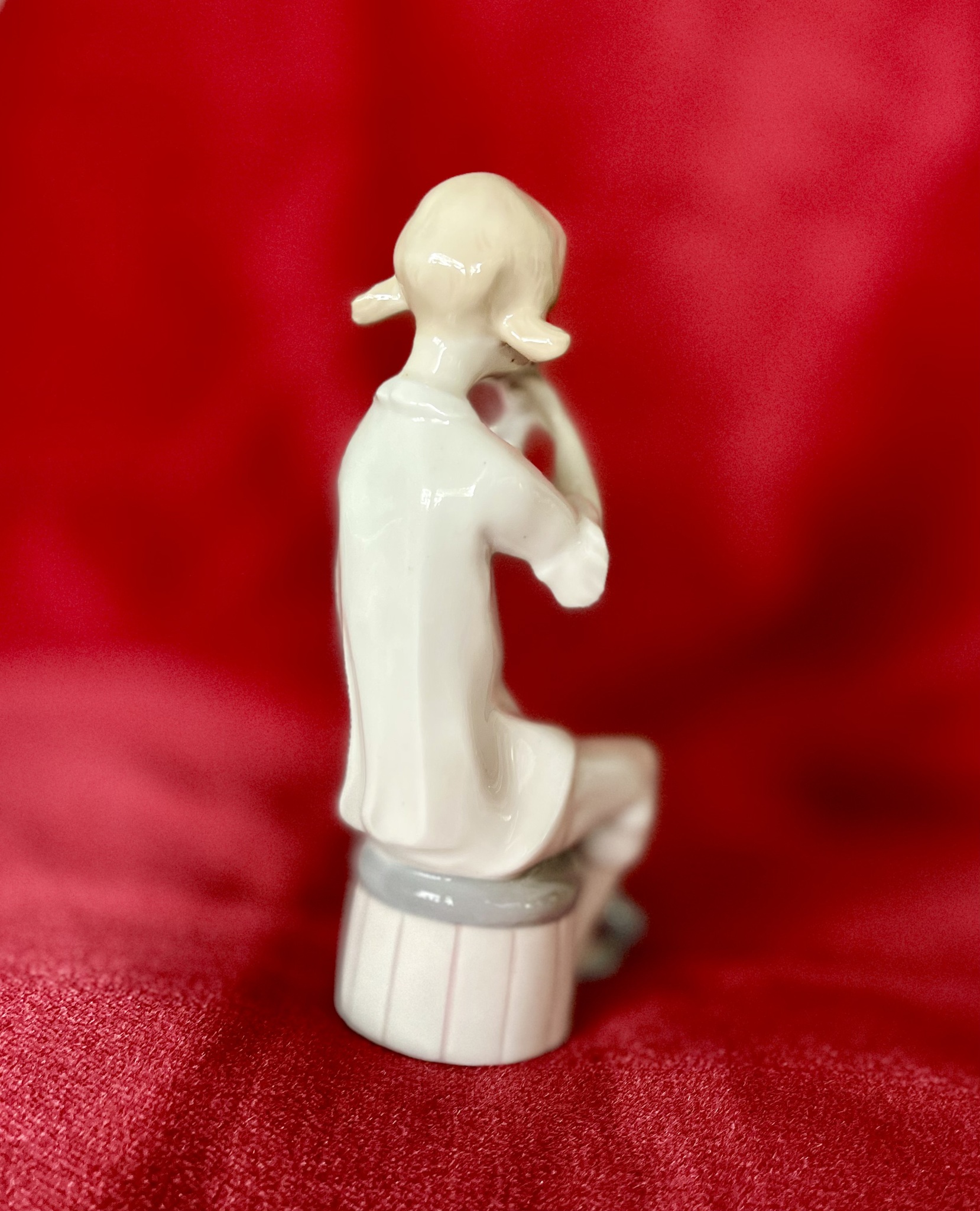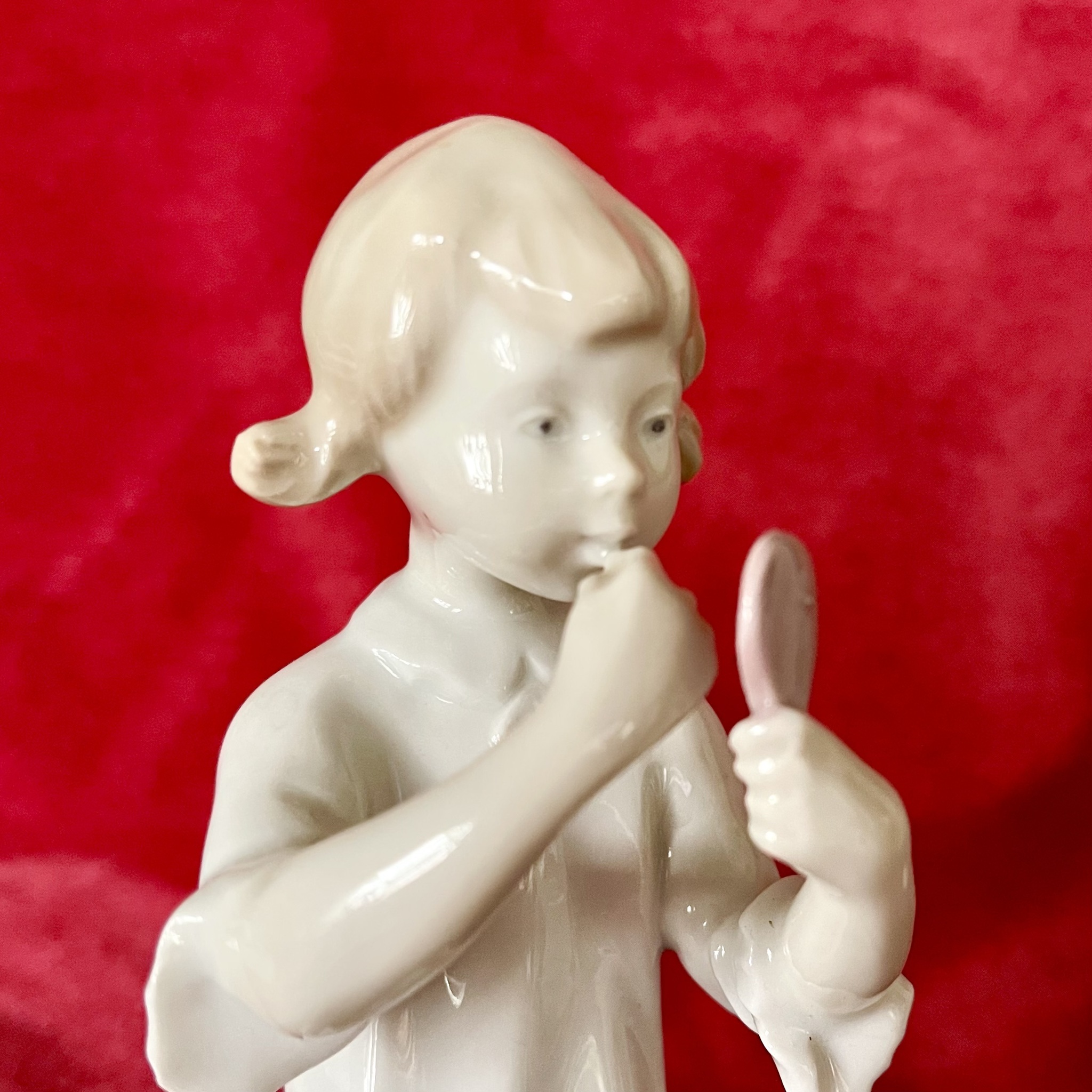 Förtjusande figurin i porslin föreställande en flicka som speglar sig, GDR nr 14. Höjd 17 cm. Obetydligt bruksslitage.