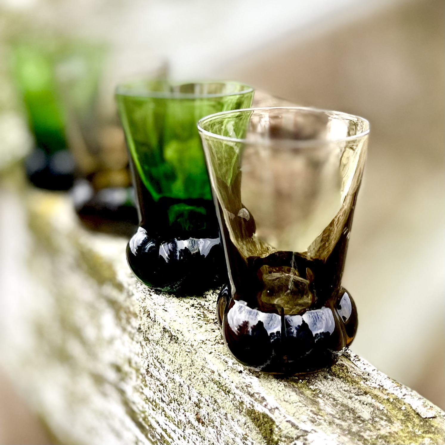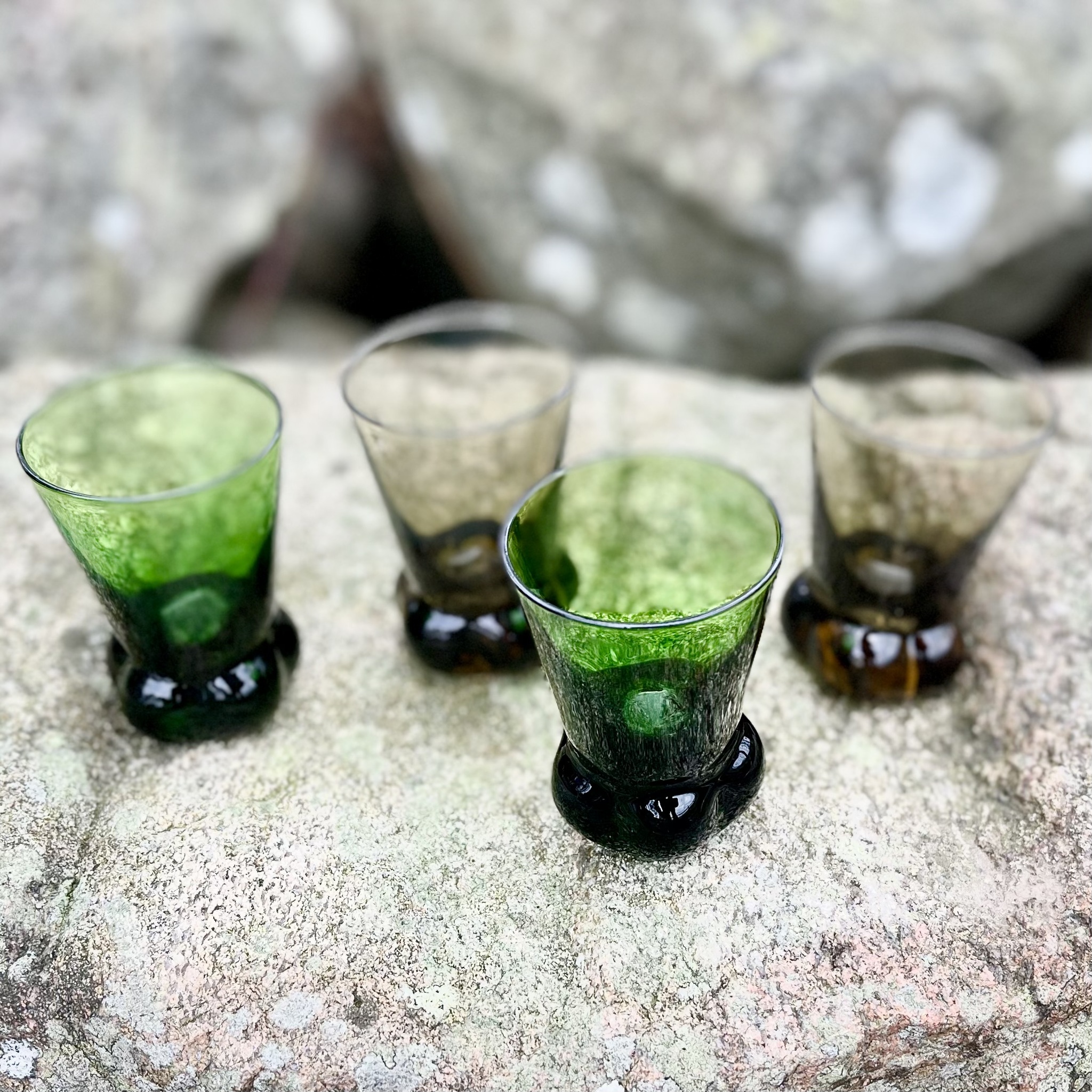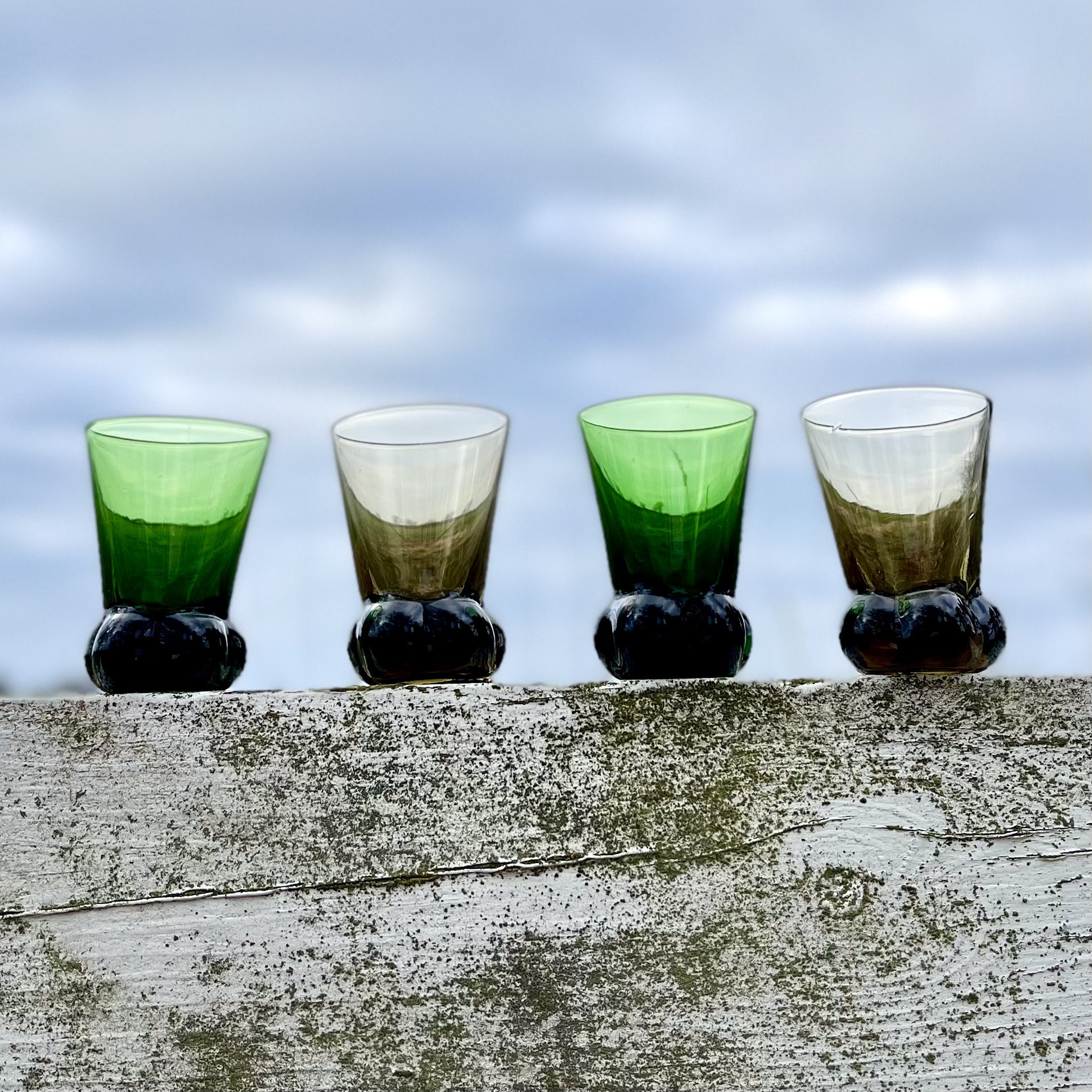 Fyra munblåsta snapsglas, två bruna och två gröna. Bruksslitage. Höjd 6,5 cm.