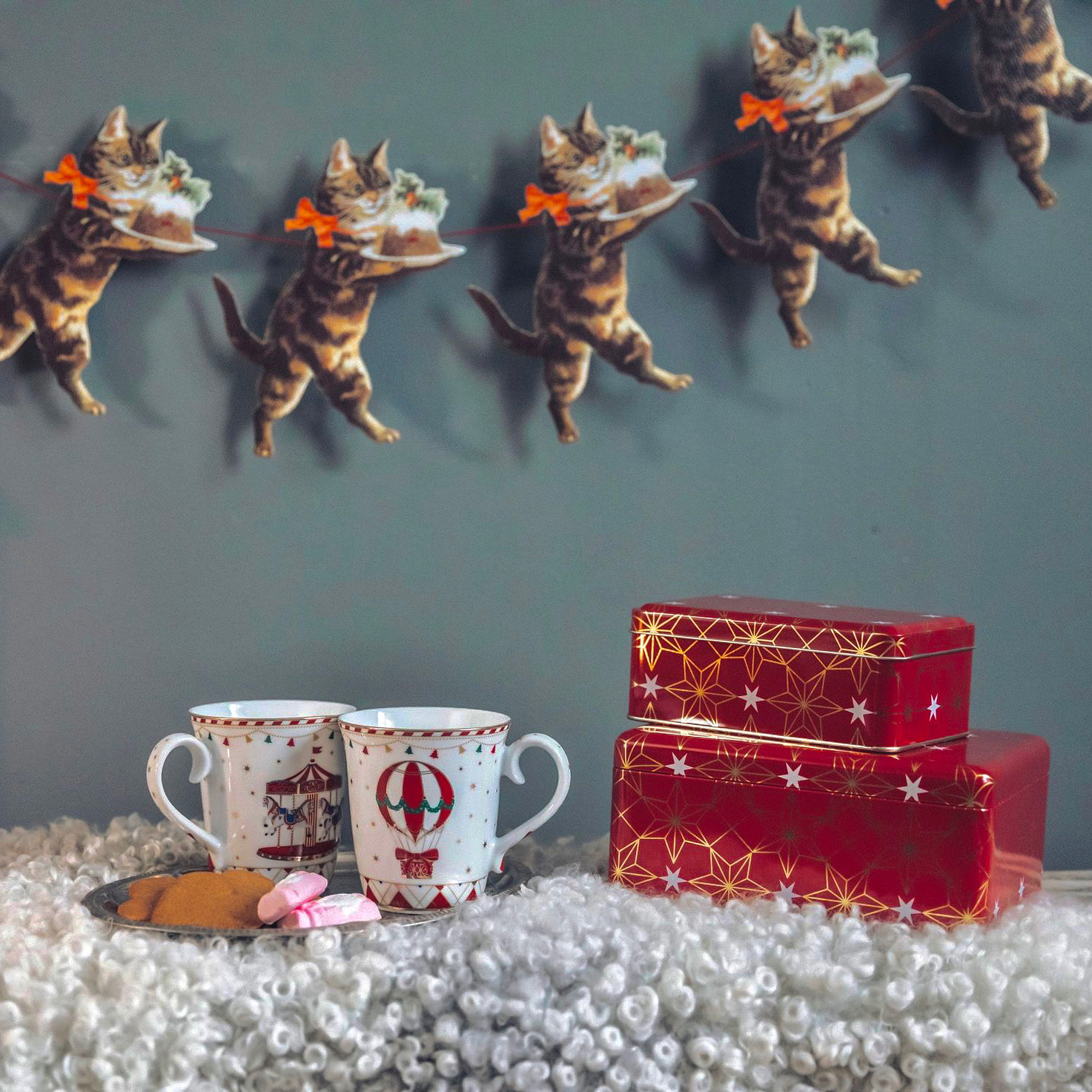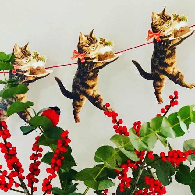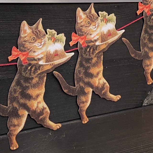 En glädjespridare i juletid! Kattgirlang, 3 meter lång med 18 cm höga katter serverandes julpudding. Katterna 18 cm höga och motiv på ena sidan.