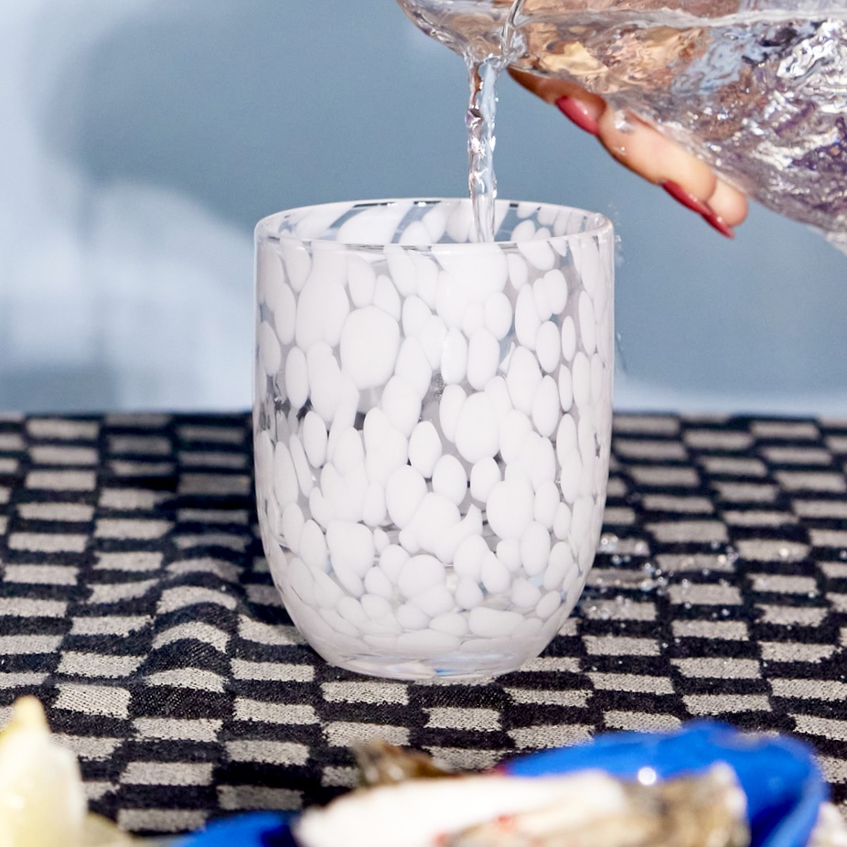 Som en liten delikat snöstorm är detta mjuka, handgjorda och handblåsta glas från Byon. Passar utmärkt till julmusten men kan användas året runt till allt som är gott. Tål maskindisk. Bredd 8 cm, höjd 10 cm, volym 30 cl.