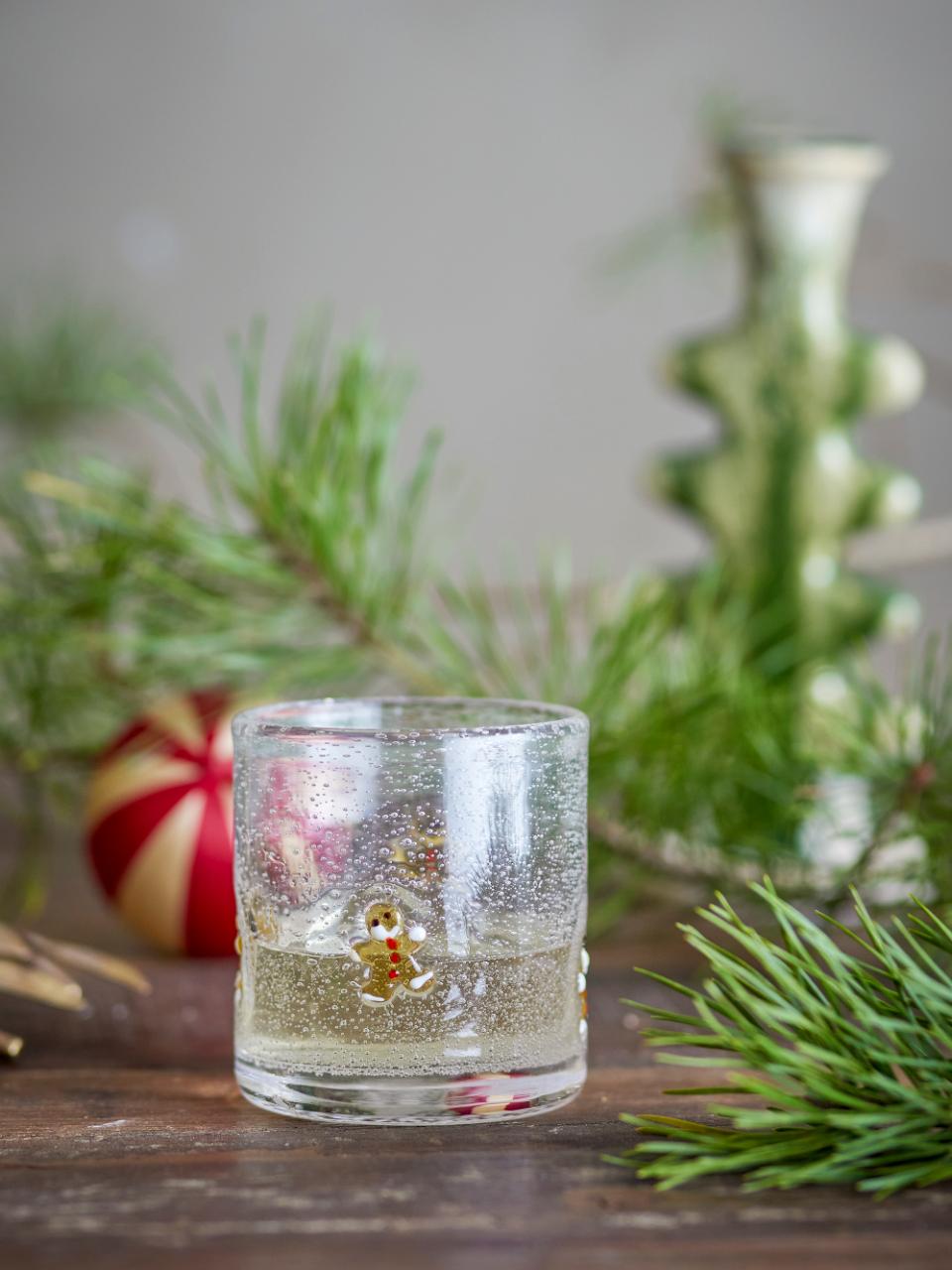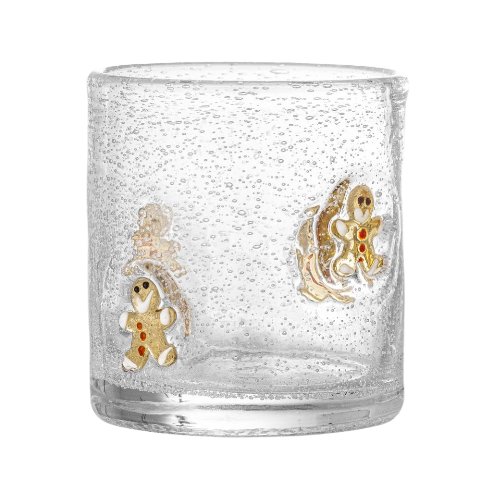 Rustikt munblåst glas med handgjorda små pepparkaksgubbar som dansar runt i ring kring glaset. Iögonfallande och rolig detalj för din juldukning. Tål diskmaskin. Höjd 10 cm, diameter 9 cm.