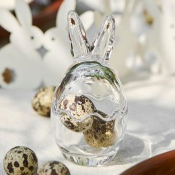 Litet 11 cm högt öppningsbart glasägg med påskharens öron (eller kaninöron om man så vill) överraskar garanterat dina gäster. Höjd 11 cm, diameter 5,5 cm.