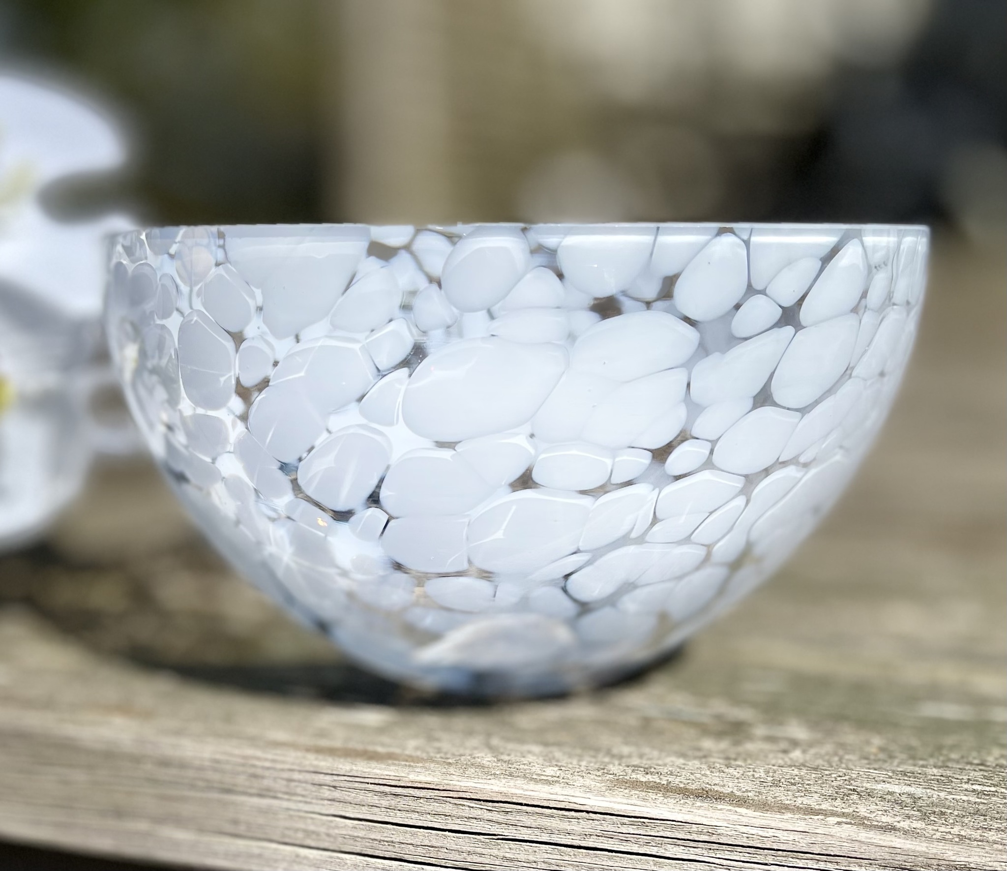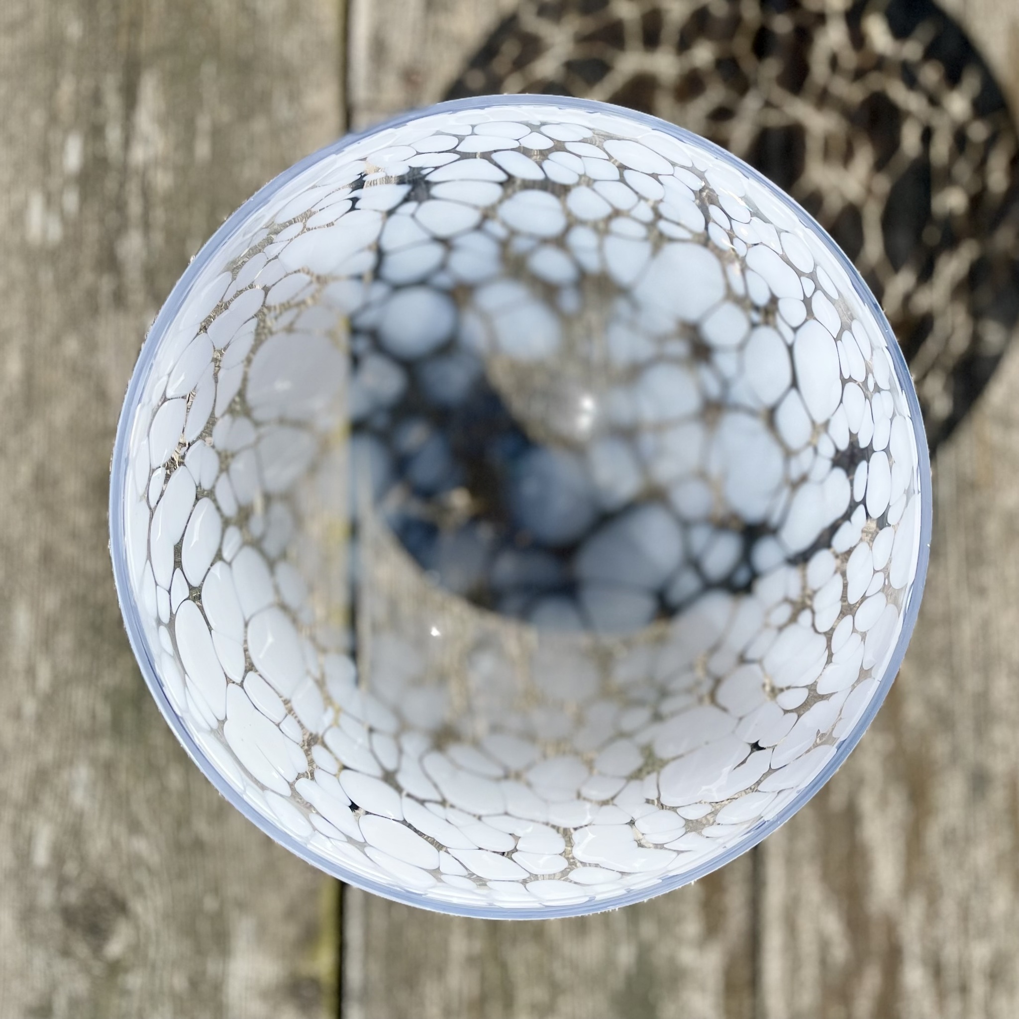 Glasskål med vackert vitt mönster som påminner om brudslöja eller kanske en snöstorm? Nyskick. Höjd 10,5 cm, diameter 18,5 cm.