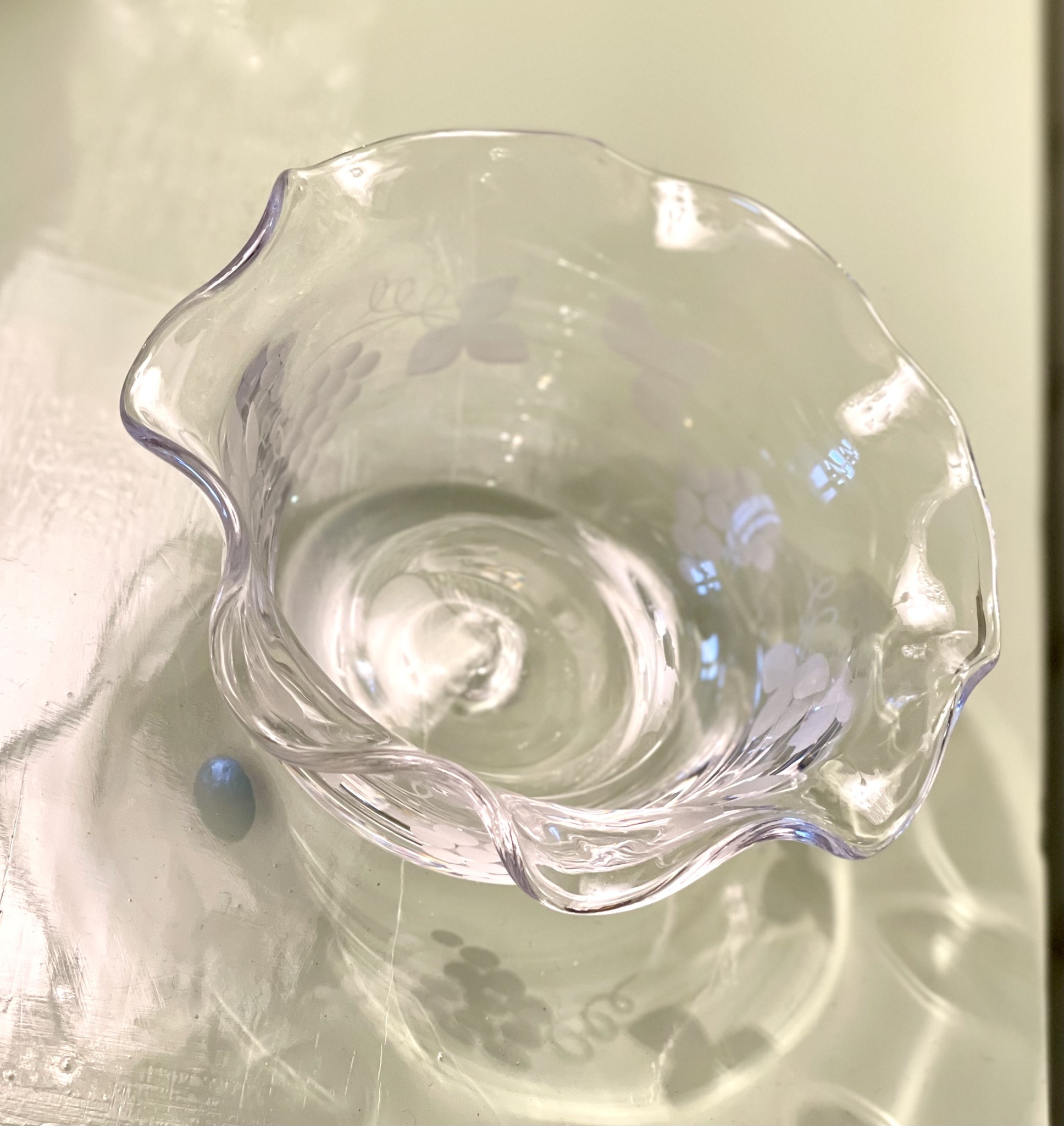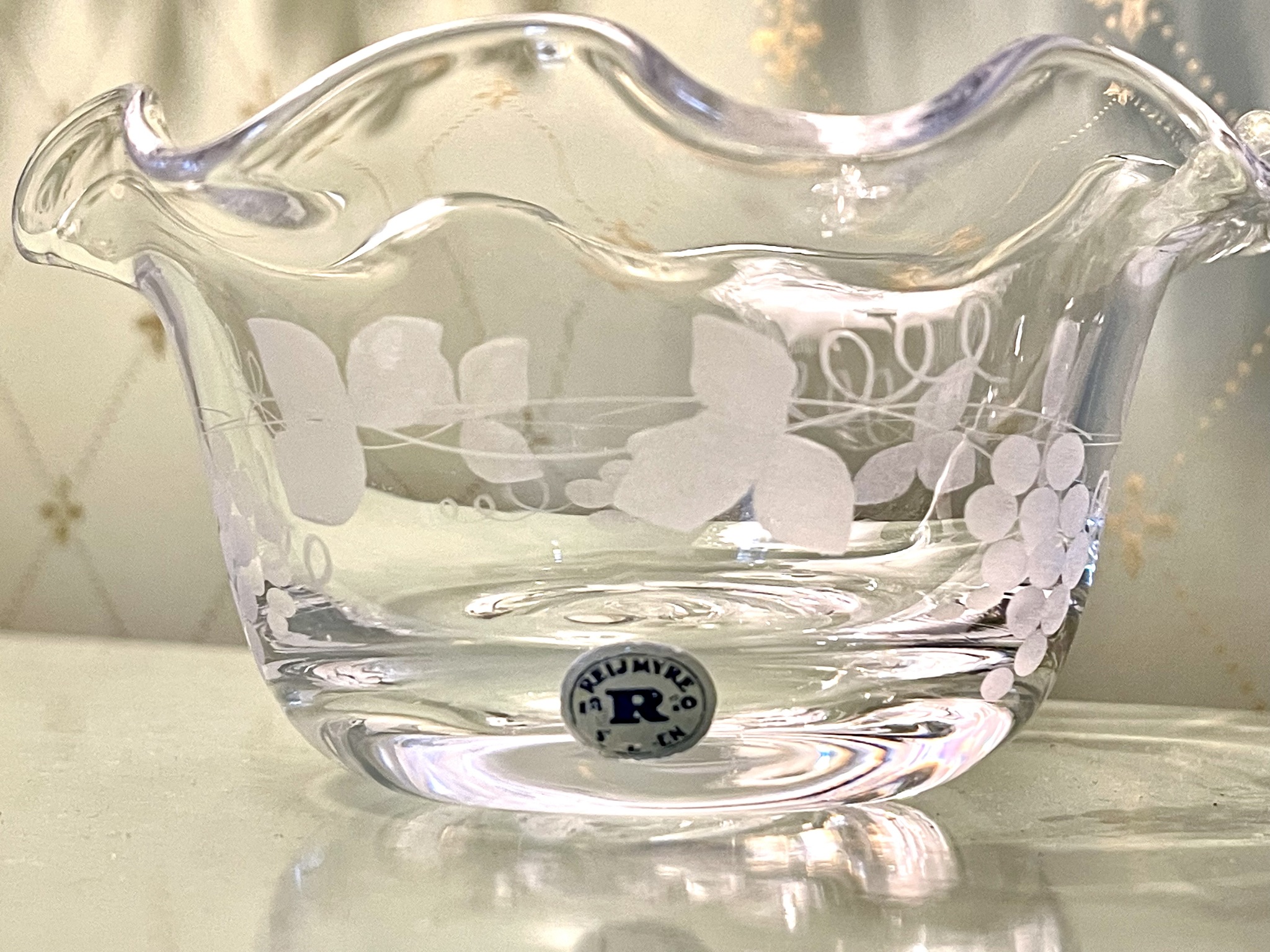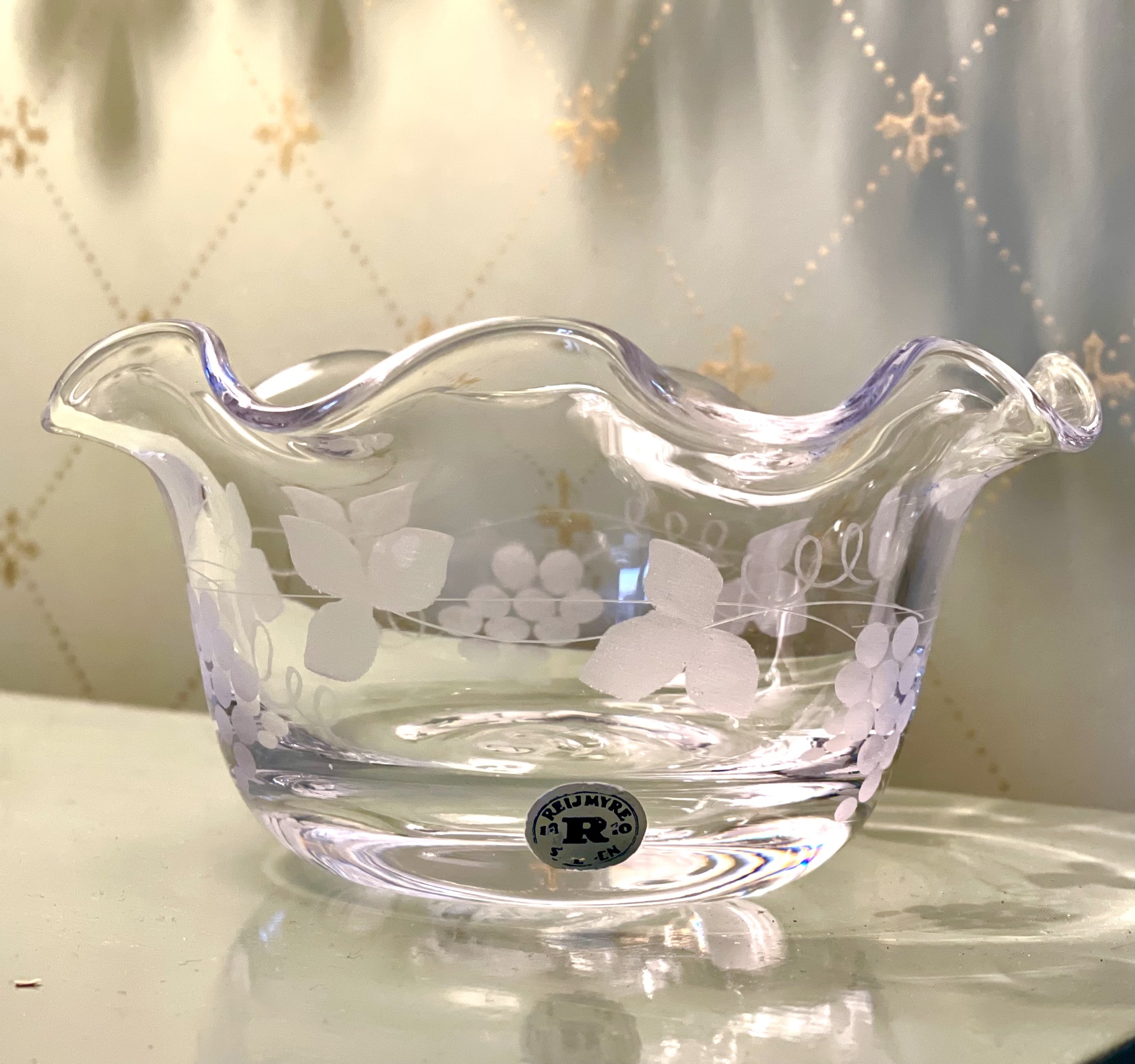 Sockersöt glasskål från Reijmyre glasbruk. Vågig kant och etsat mönster med vinrankor. Obetydligt bruksslitage. 6,5 cm, bredd 13 cm.