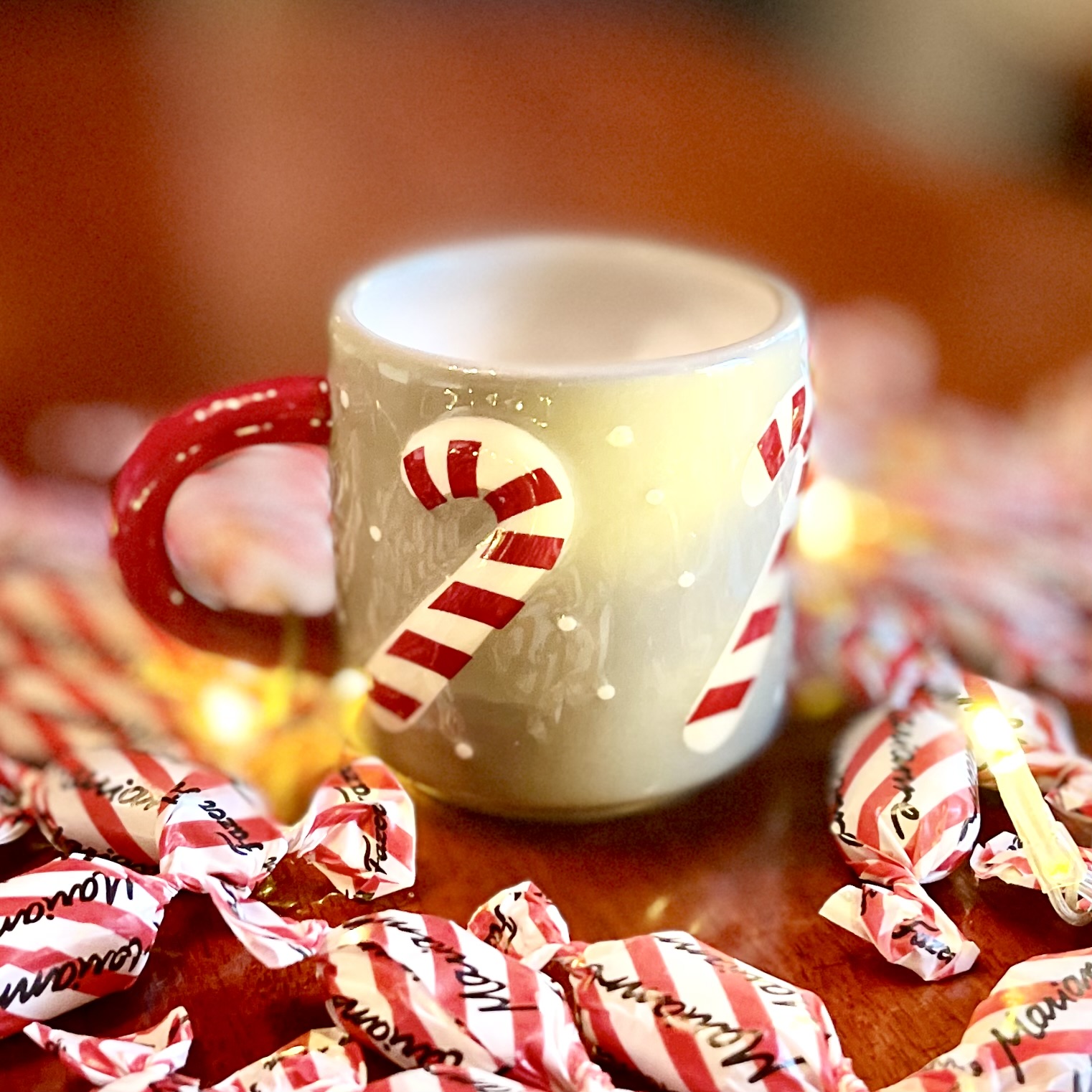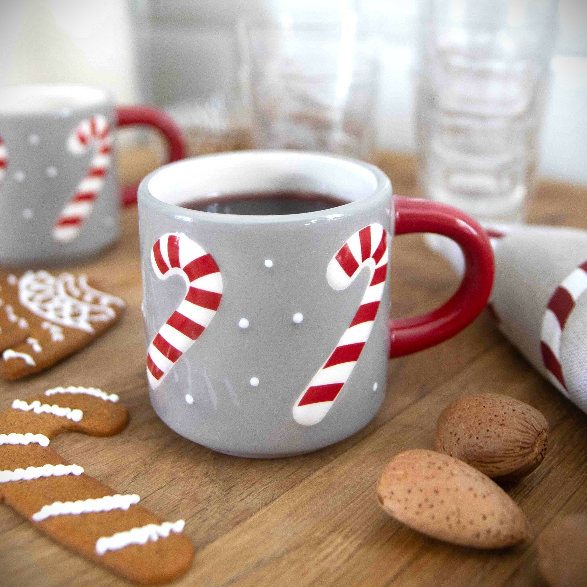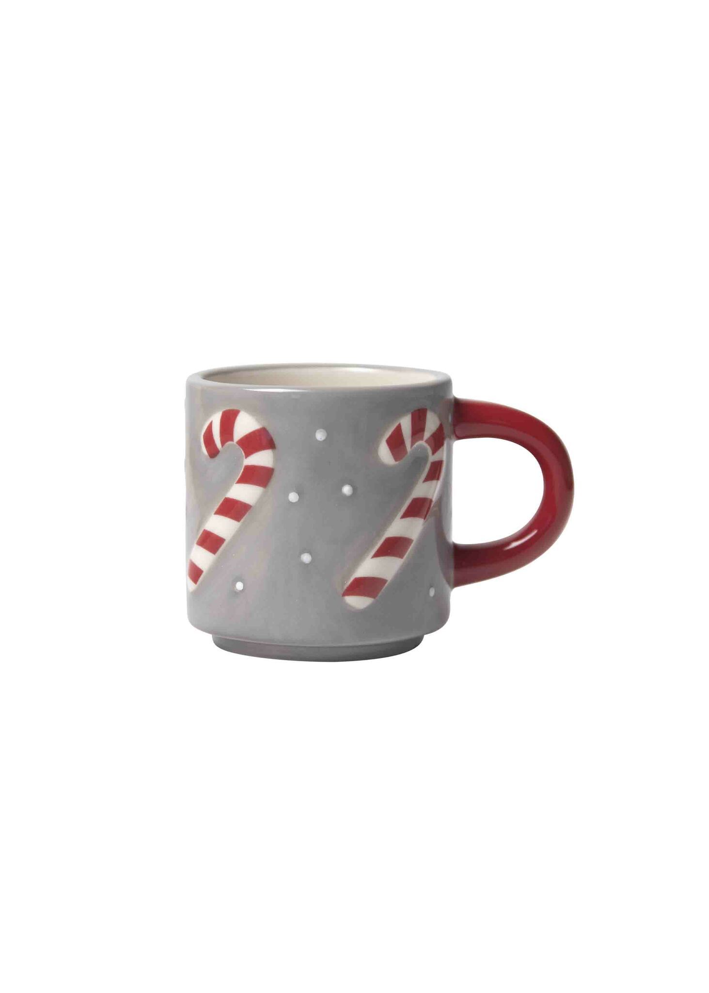 Glöggmugg i snygg polkagrisdesign! Perfekt för att njuta av en varm kopp glögg i vintermörkret. Passar perfekt för att ge ditt eget glöggmys lite extra charm. Handmålad keramik. Tål diskmaskin. Höjd: 6.5 cm.