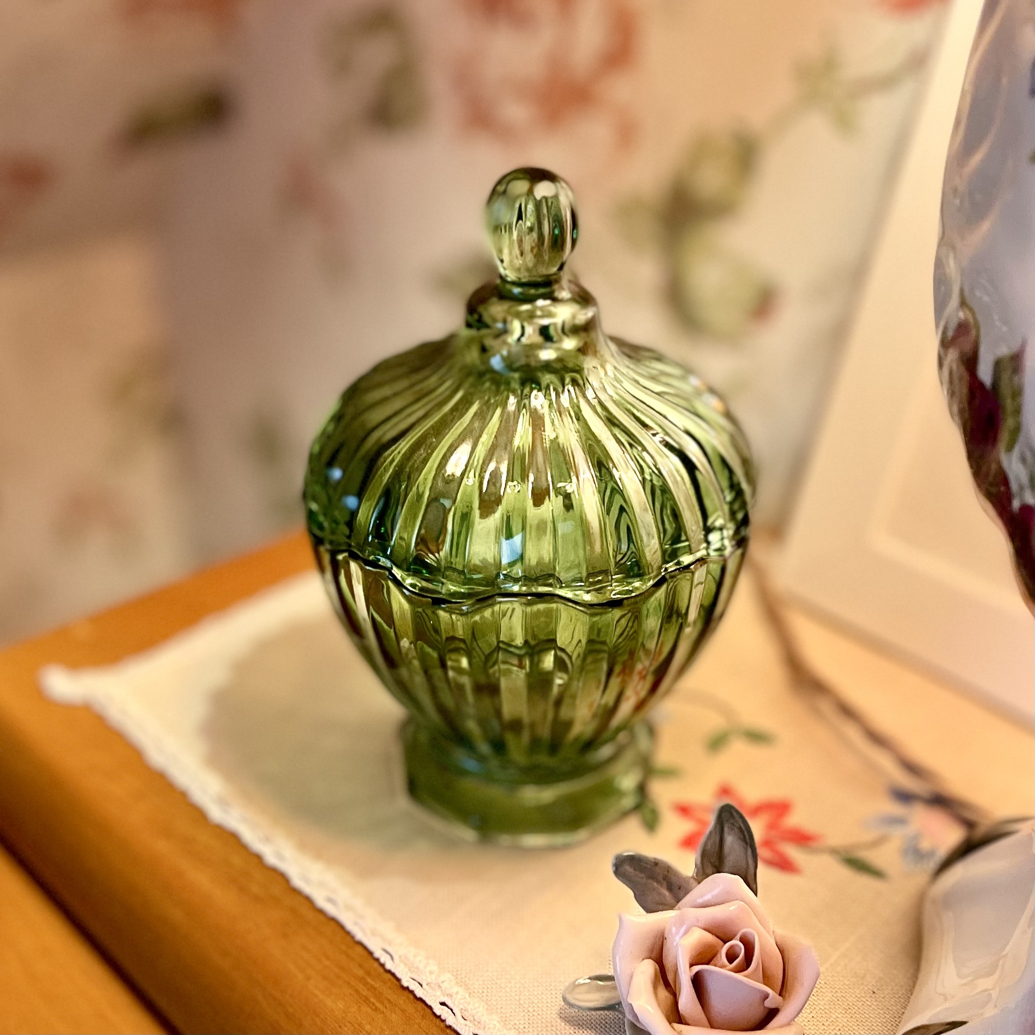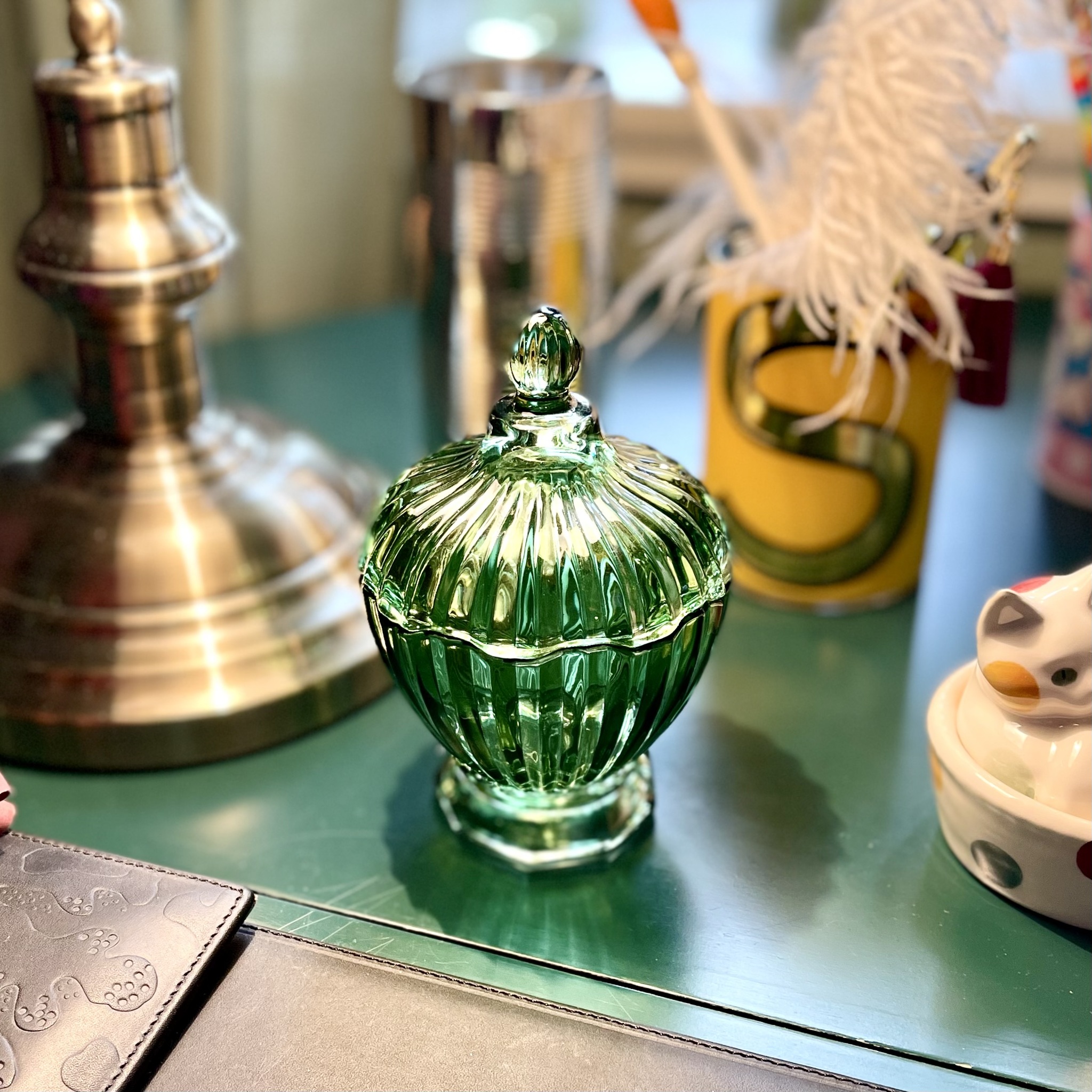 Underbar liten skål med lock med färgfinish, det vill säga att färgen ligger utanpå glaset. Det är inget man tänker på men det kräver handdisk i max 30 grader. Höjd 14 cm, bredd 9,4 cm.