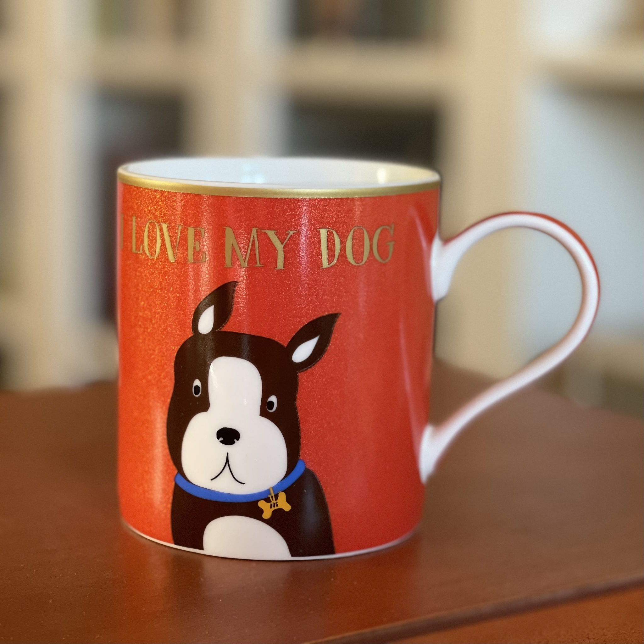 Världens gulligaste hundkompis avbildad på kopp av porslin. Den orange färgen glittrar lite på ett elegant sätt och överst står texten ?I love my dog?. Tål maskindisk och micro. Rymmer 350 ml.