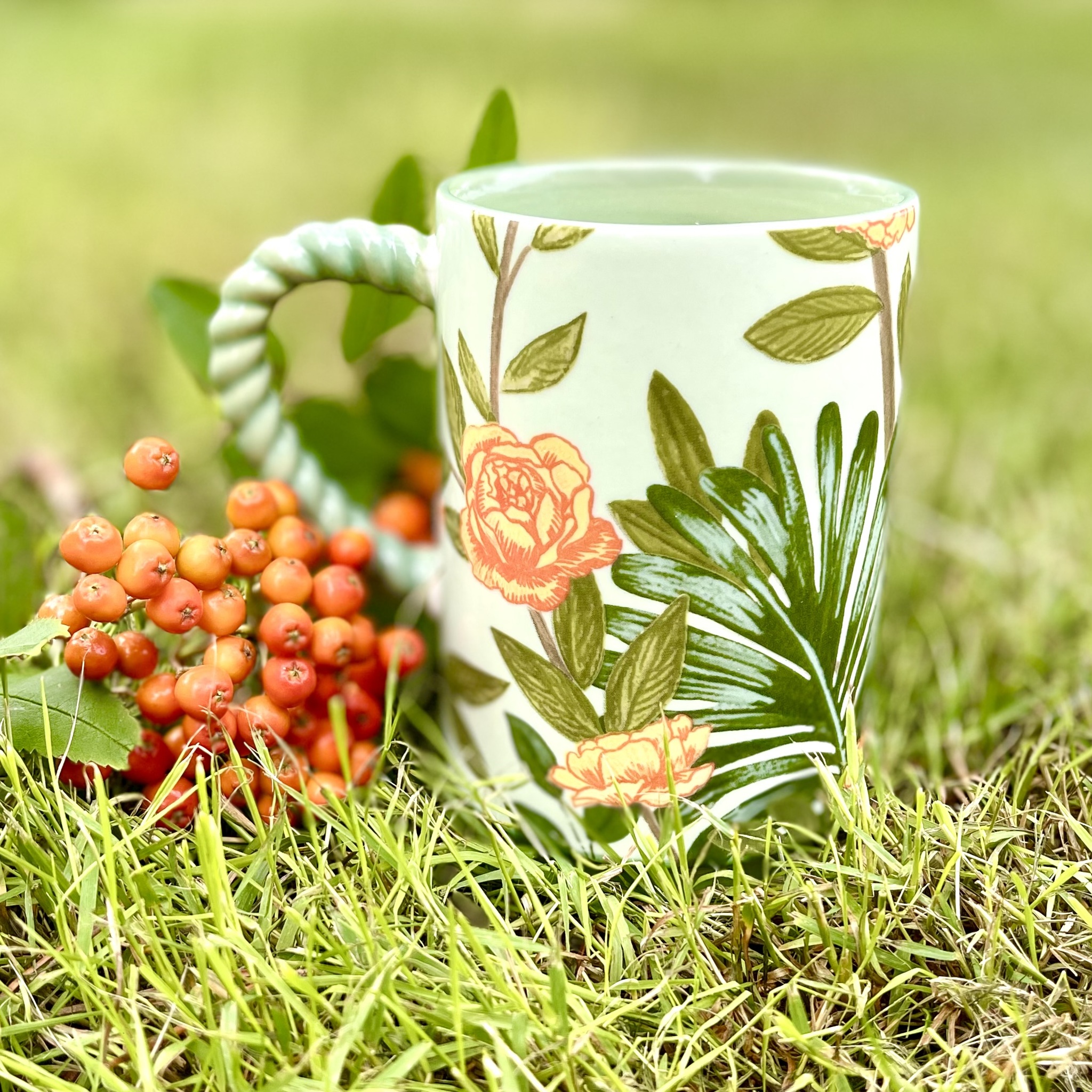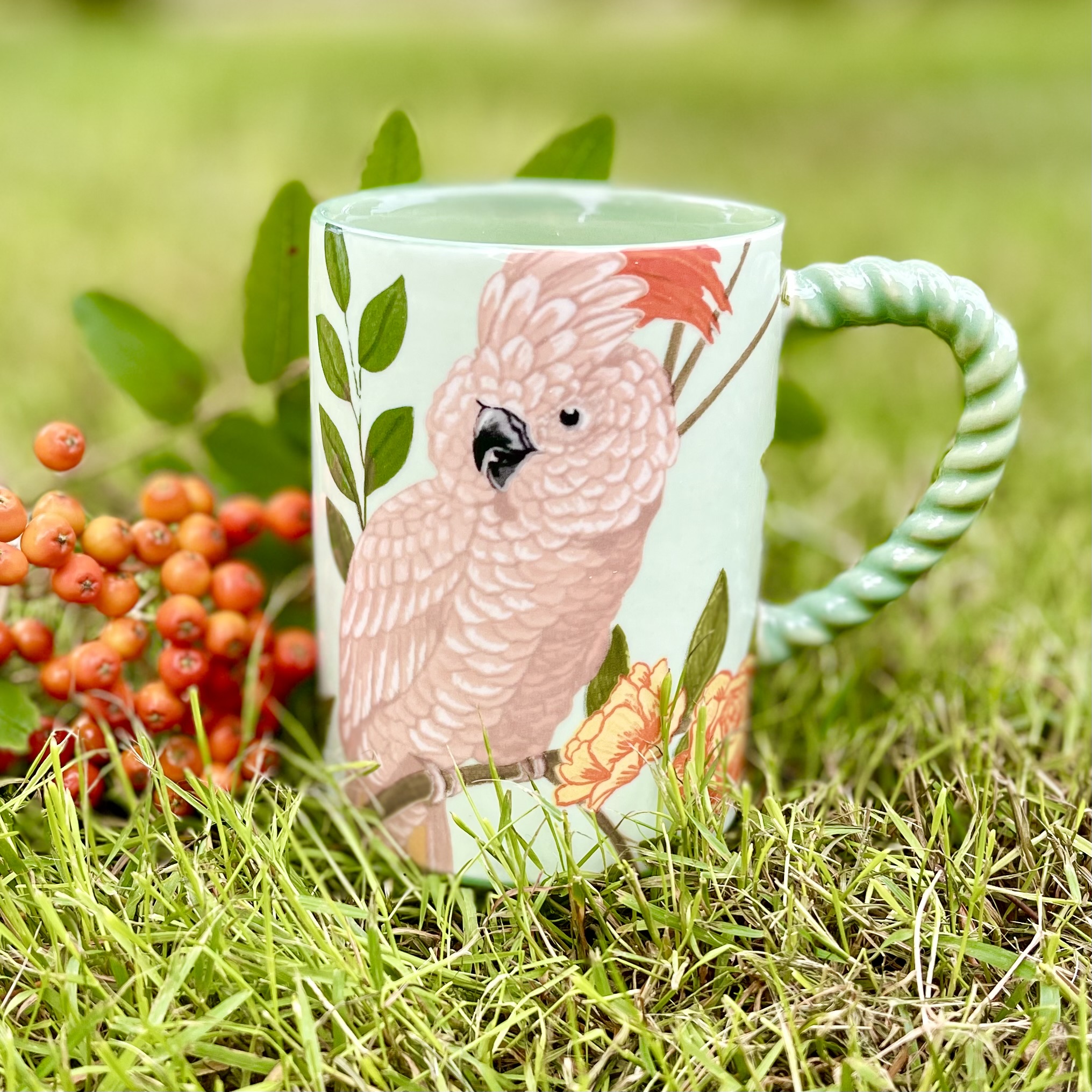 Somrig och färggrann kopp med kakadua och tvinnat öra. Tål diskmaskin och micro. Höjd 11 cm.