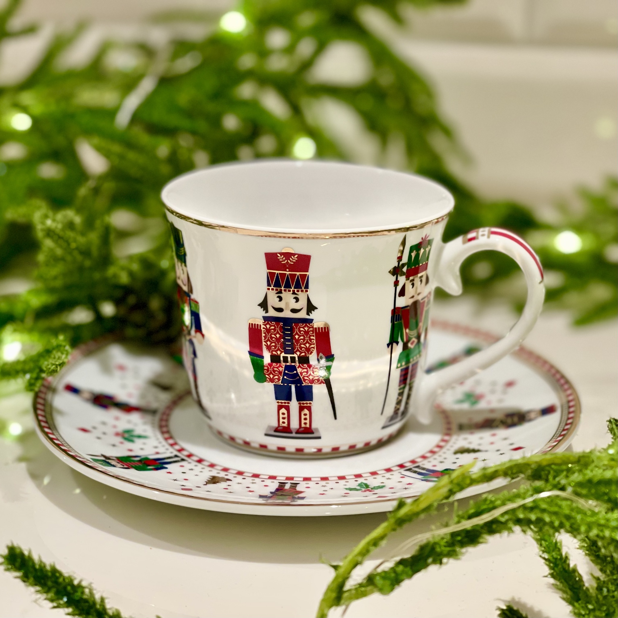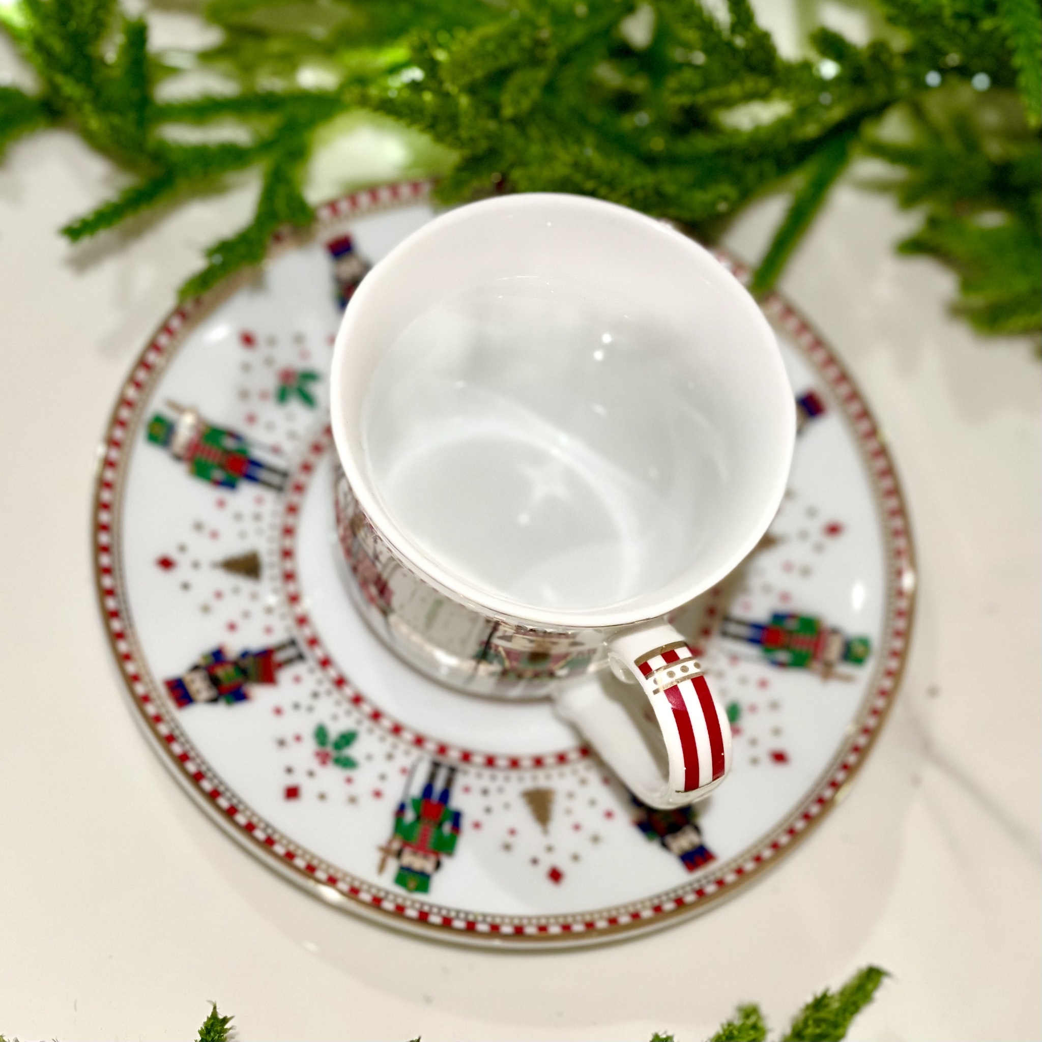 Fantastisk julkopp med fat, dekorerad med stiliga nötknäppare och gulddetaljer. Handdisk, ej micro. Höjd 7 cm.