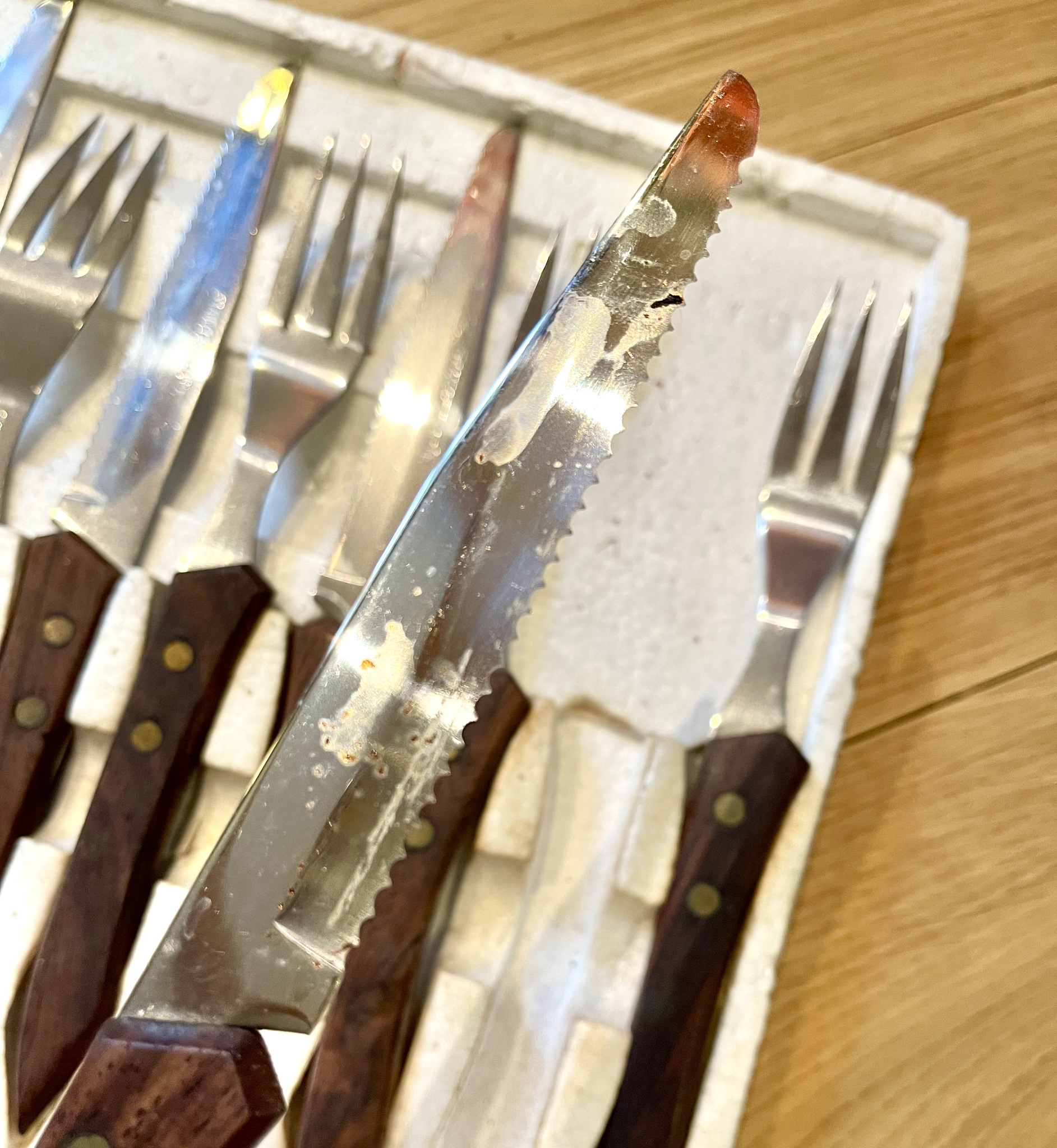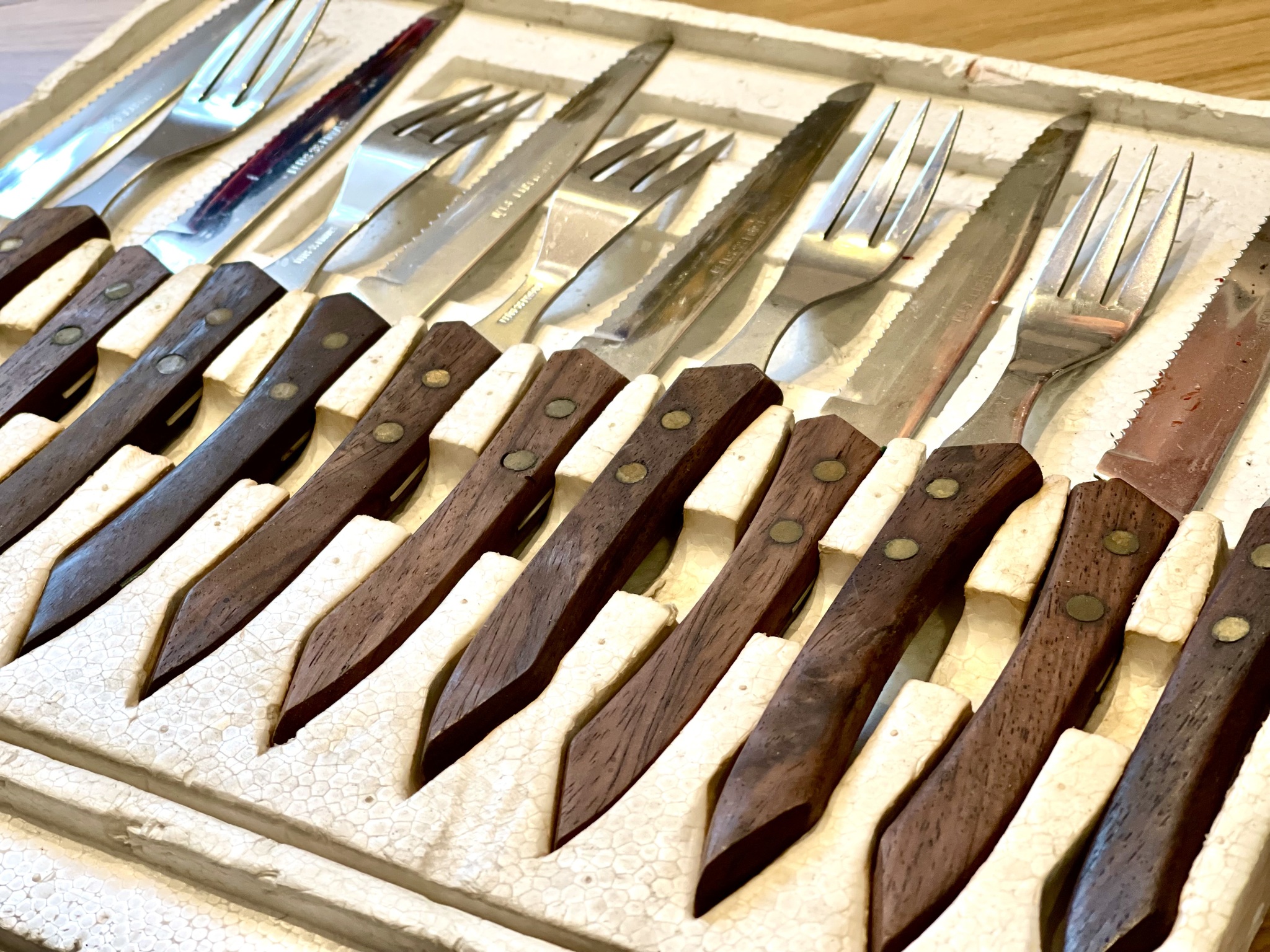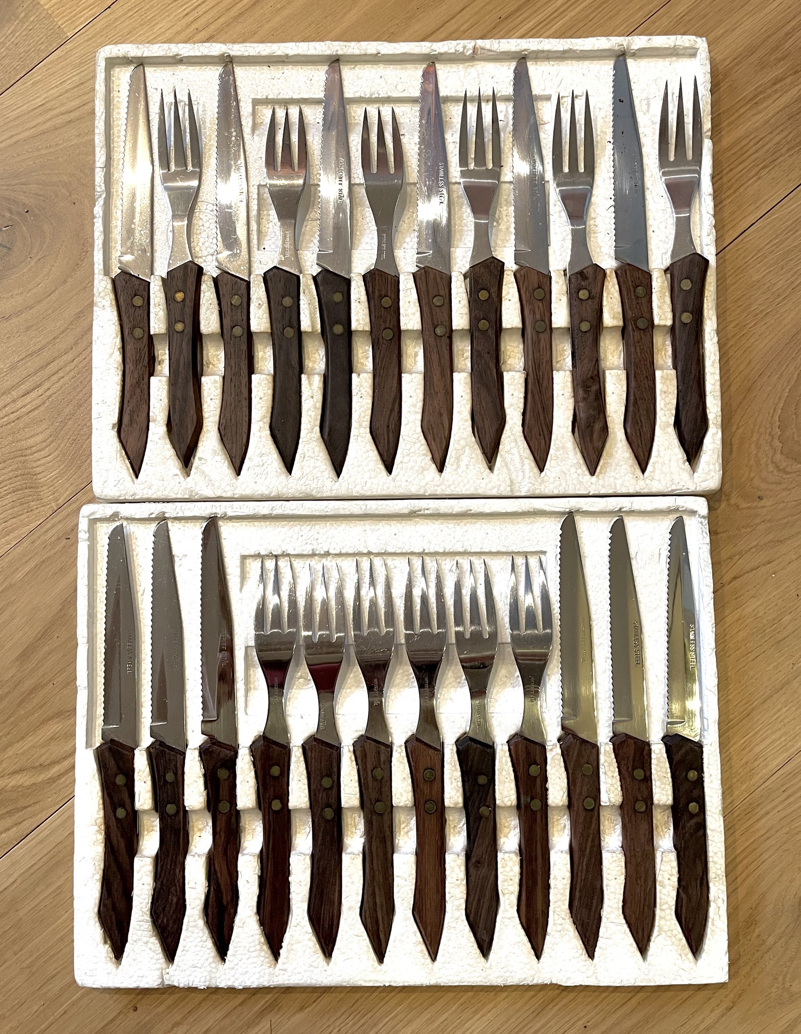 12 par köttbestick med trähandtag. Oanvända. Förekommer någon liten rostfläck som enkelt kan putsas bort (se sista bilden). Mått ca 23 cm långa.
