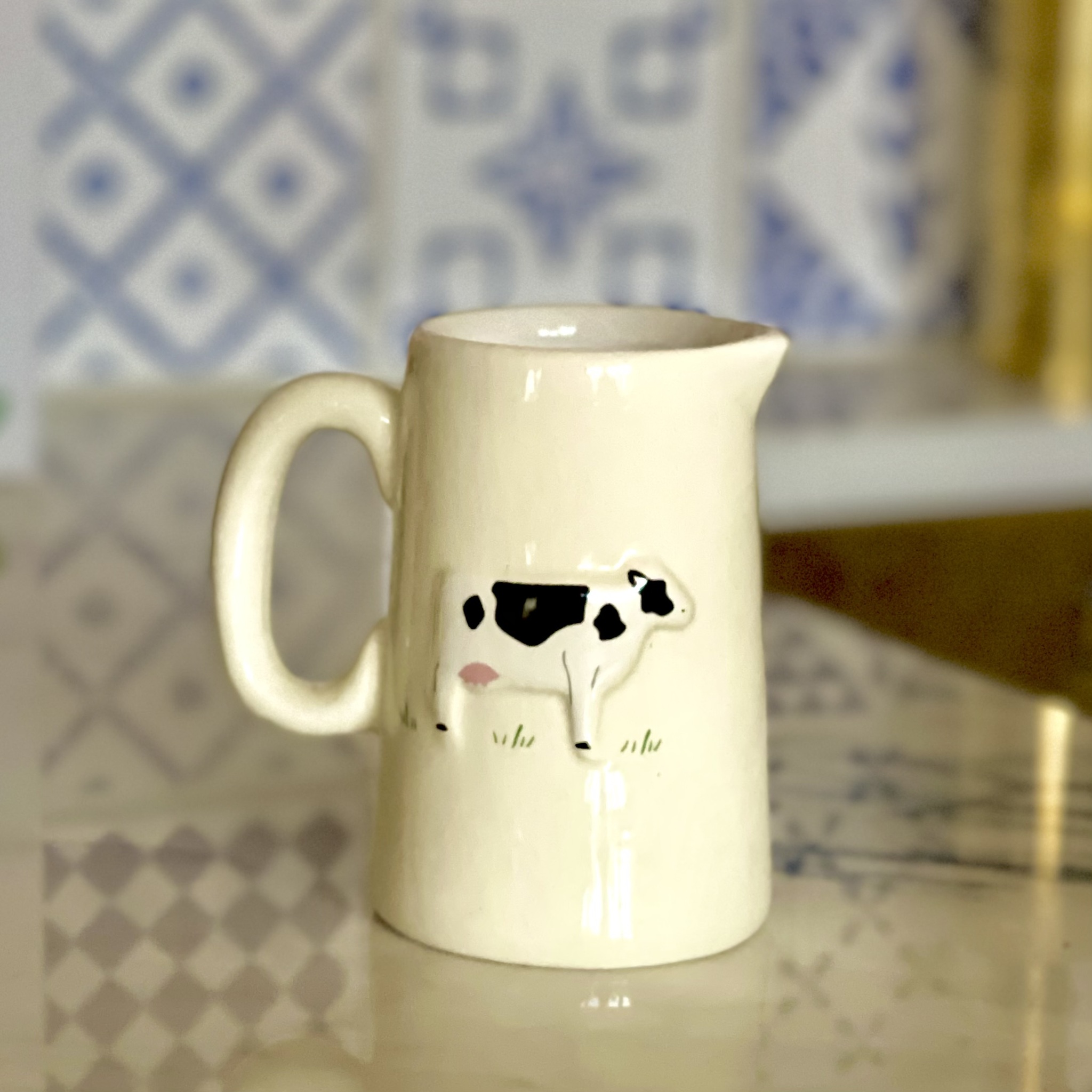Servera mjölken eller grädden i en liten klassisk kanna dekorerad med en ljuvlig ko i relief. Stengods. Höjd 8 cm.