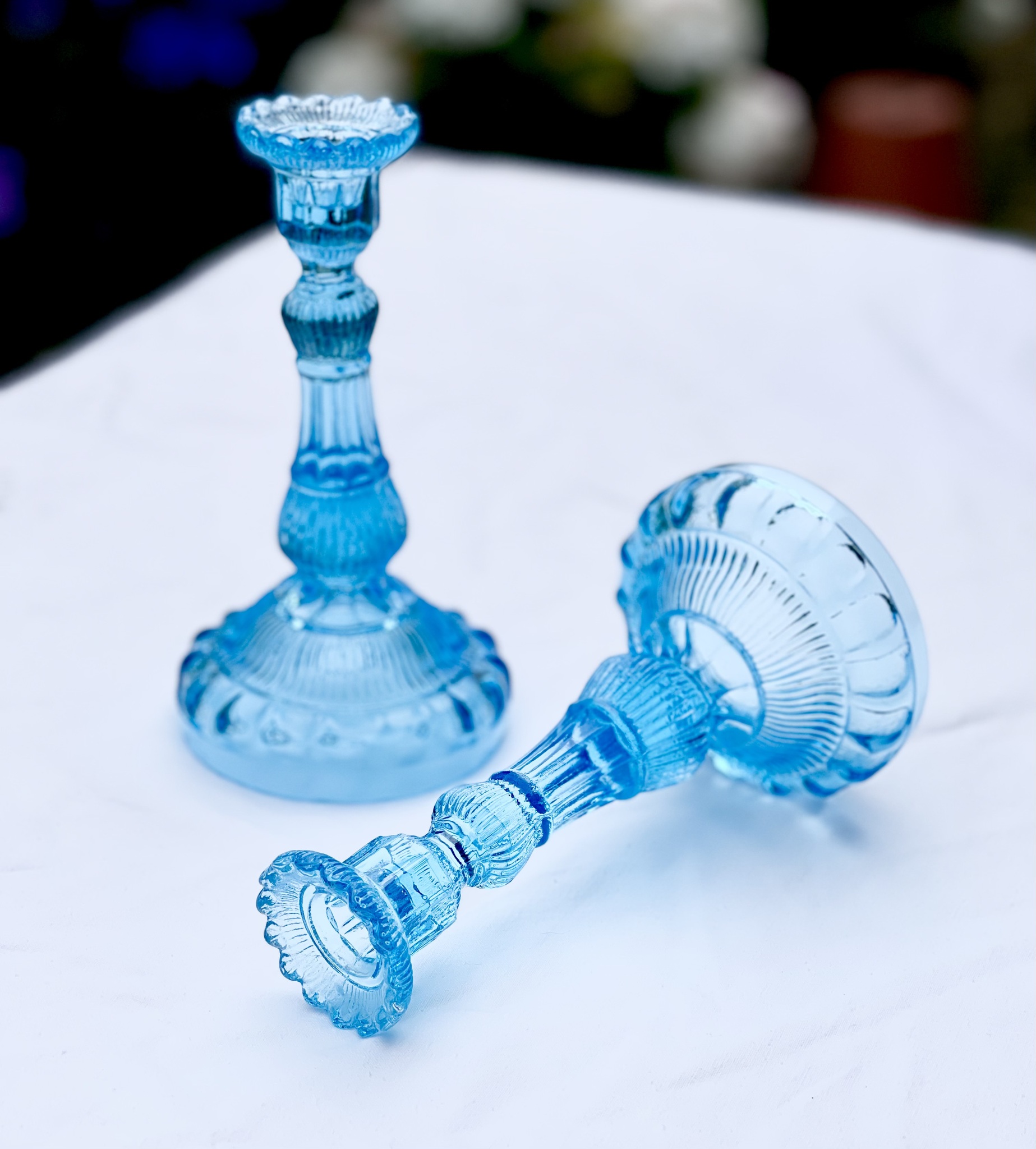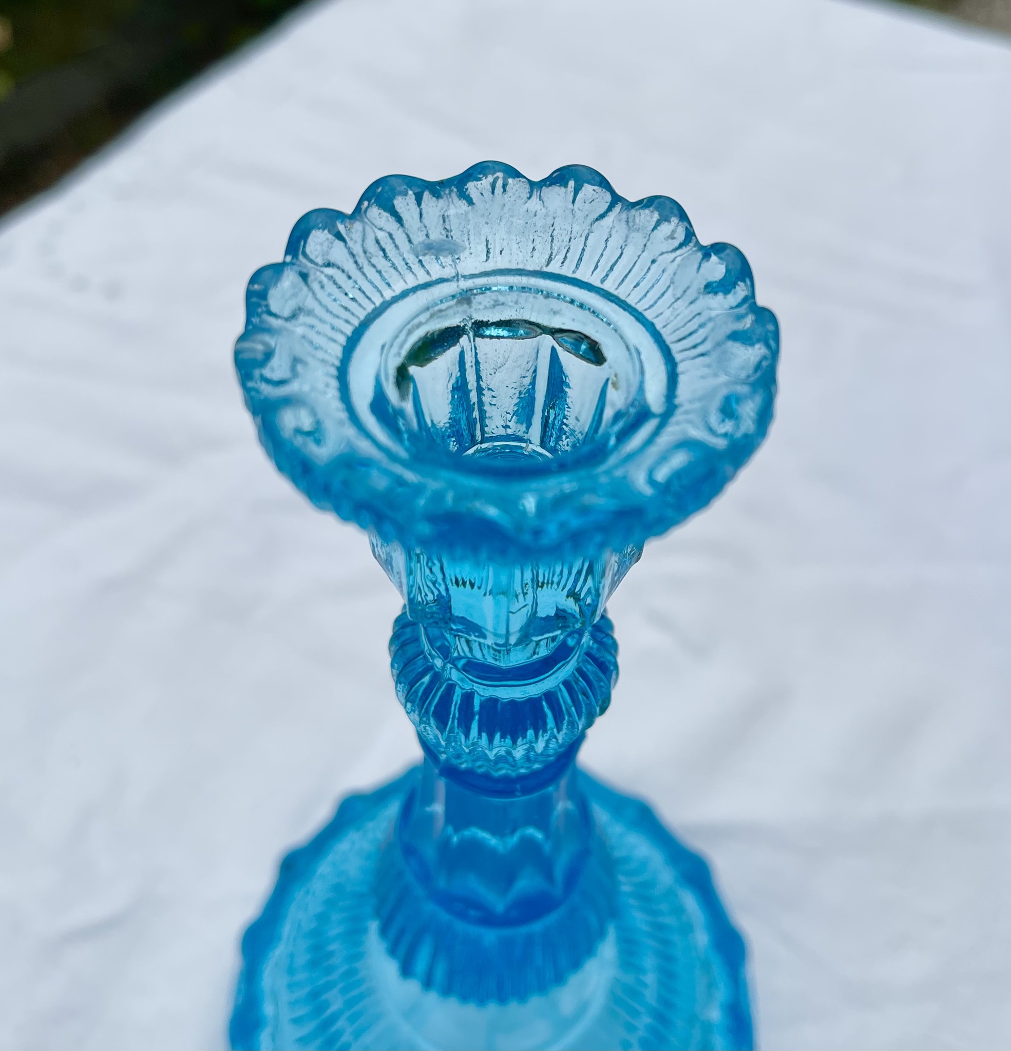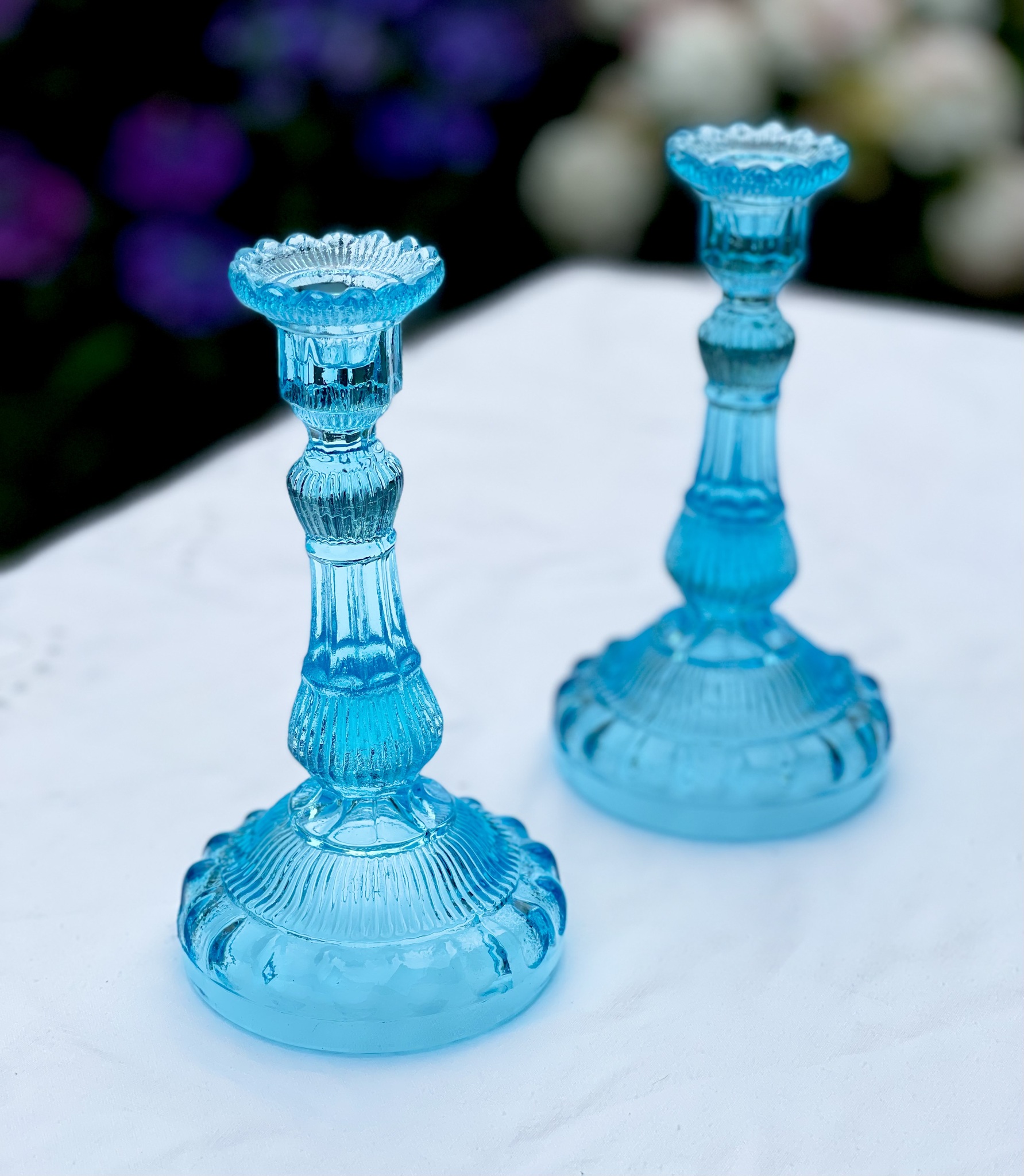 Romantiska ljusstakar av turkos pressglas. Priset är för paret. Obetydligt bruksslitage. 17 cm höga.