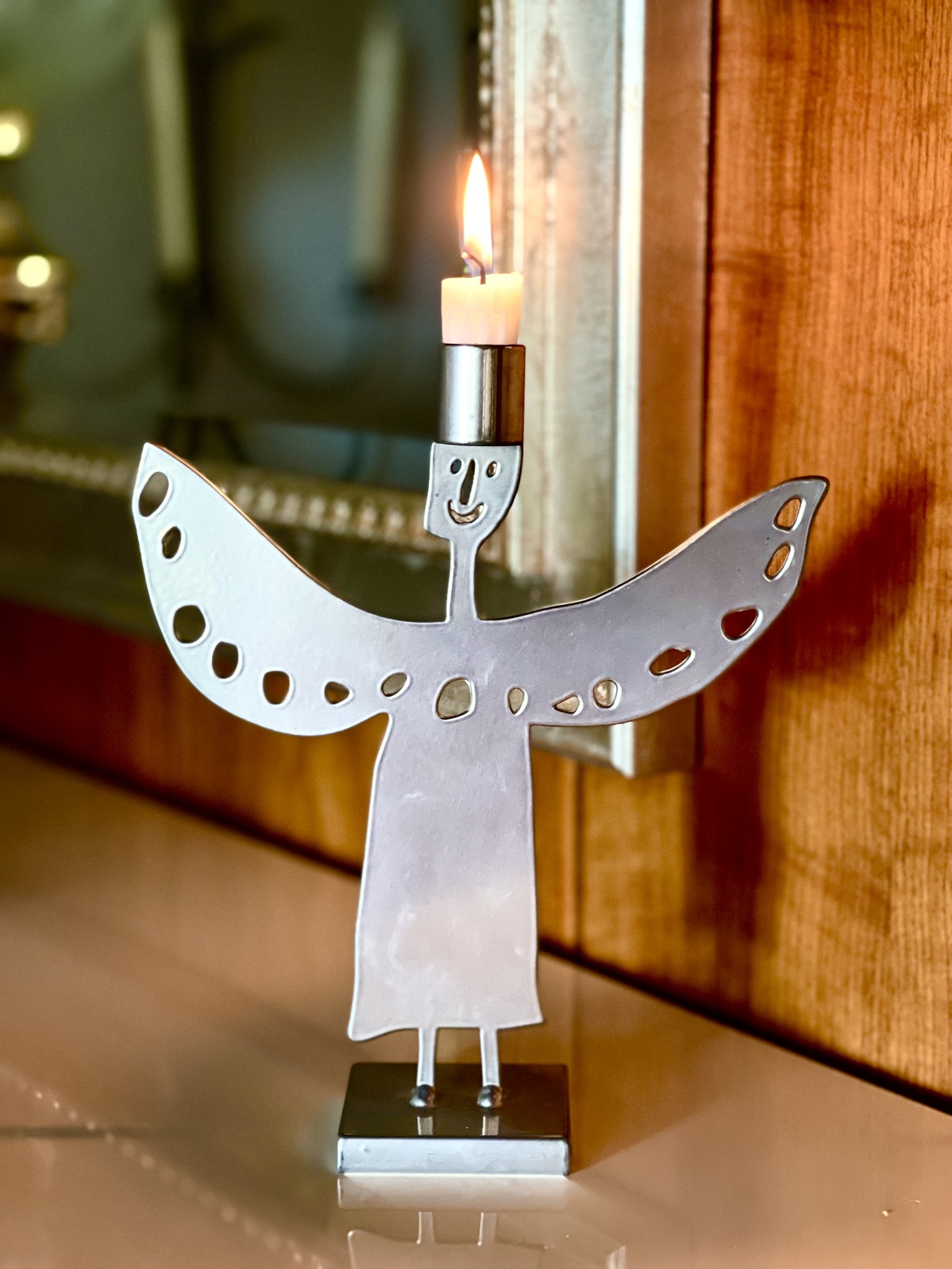 En riktig glädjespridare som alltid möter dig med värme! Ljusstake i metall i form av en ängel med utsträckta vingar, genombrutet mönster. Bruksslitage, repor. 23 cm hög, 20 cm bred.