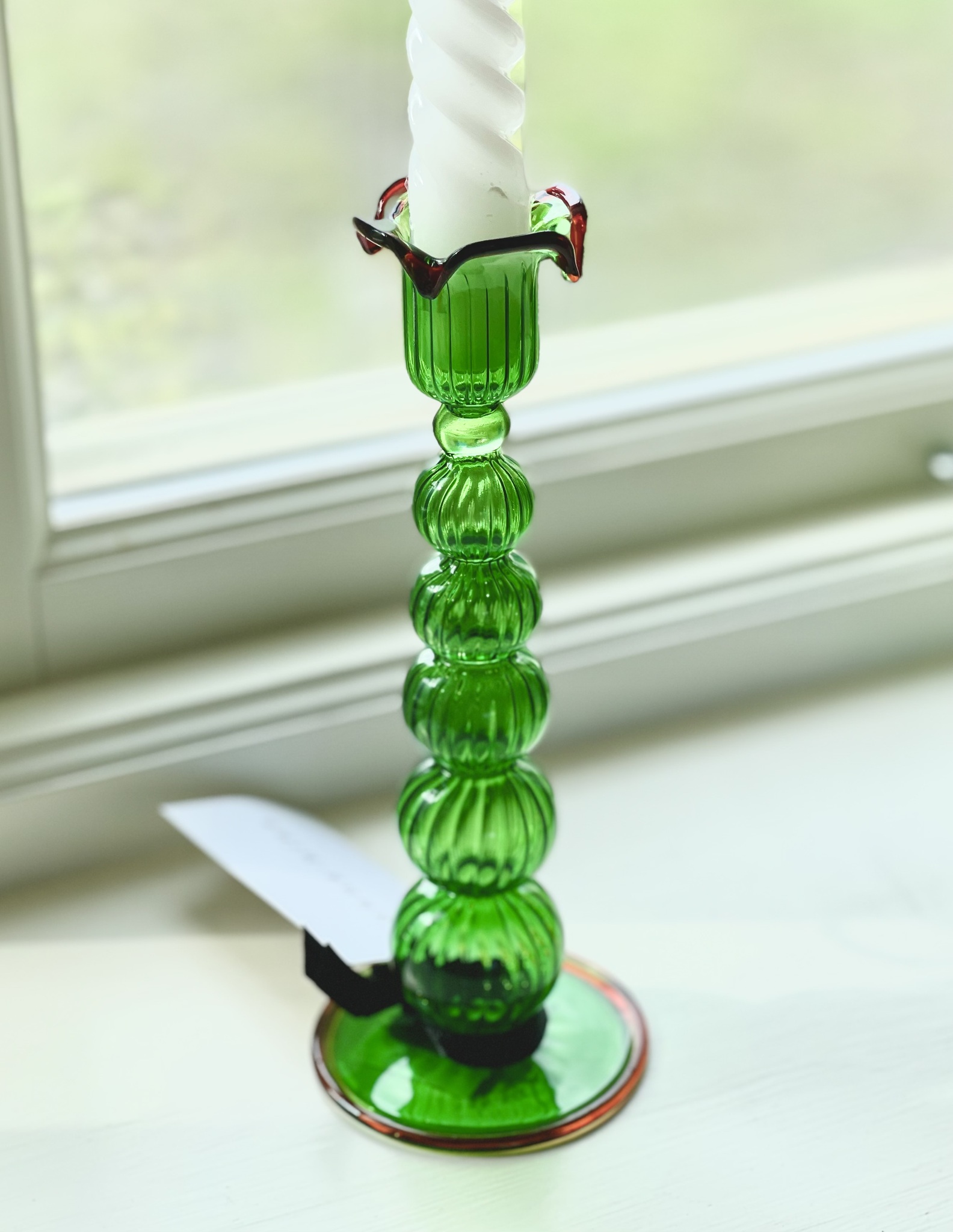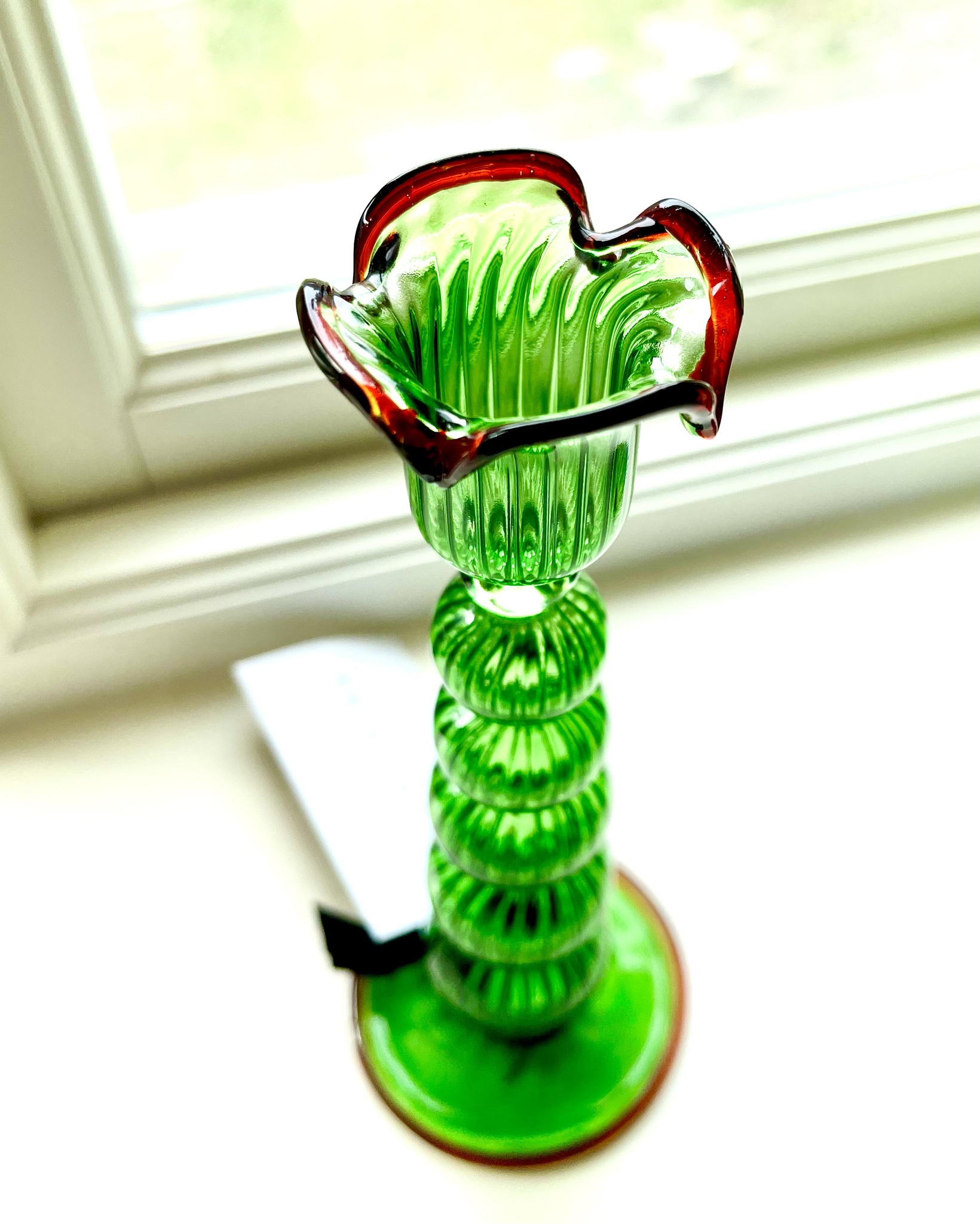 Är det en ljusstake eller är det en karamell? Denna goding från färgspecialisterna anna+nina blir ett självklart blickfång! Grönt glas med röd kant runt ljuskoppen och foten. Höjd 20 cm.