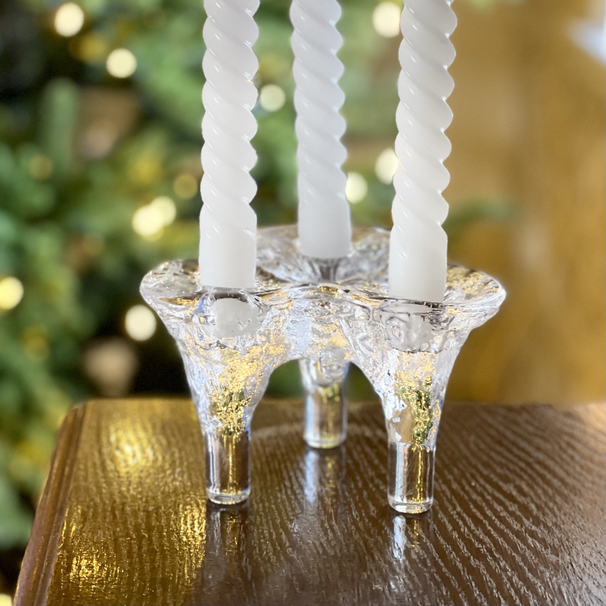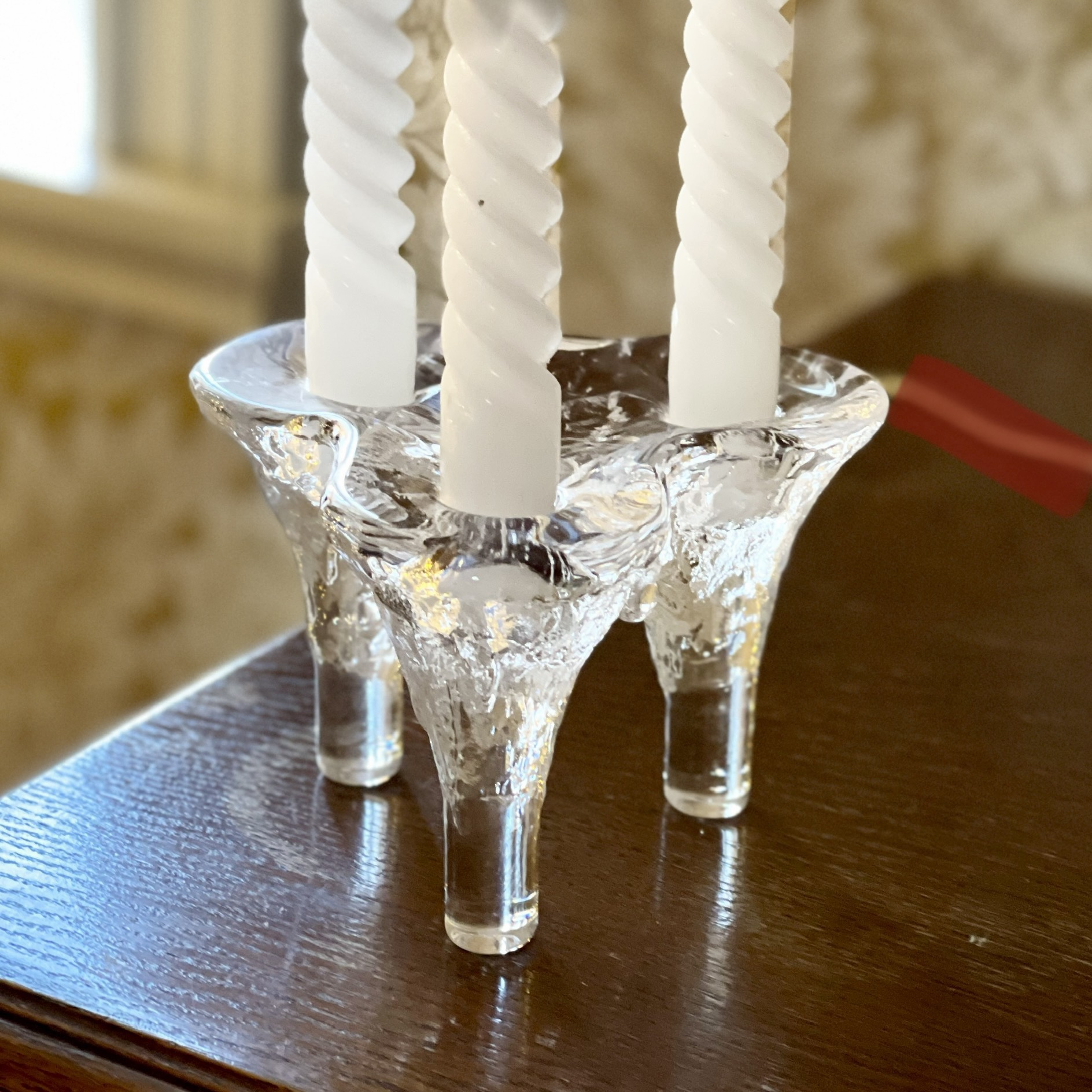 En riktig vinterklassiker! Kosta Bodas ljusstake ?Istapp? i glas i design av Göran Wärff med obetydligt bruksslitage. Plats för tre ljus med ljusen på bilden ingår ej. Höjd 9 cm, bredd 14 cm.