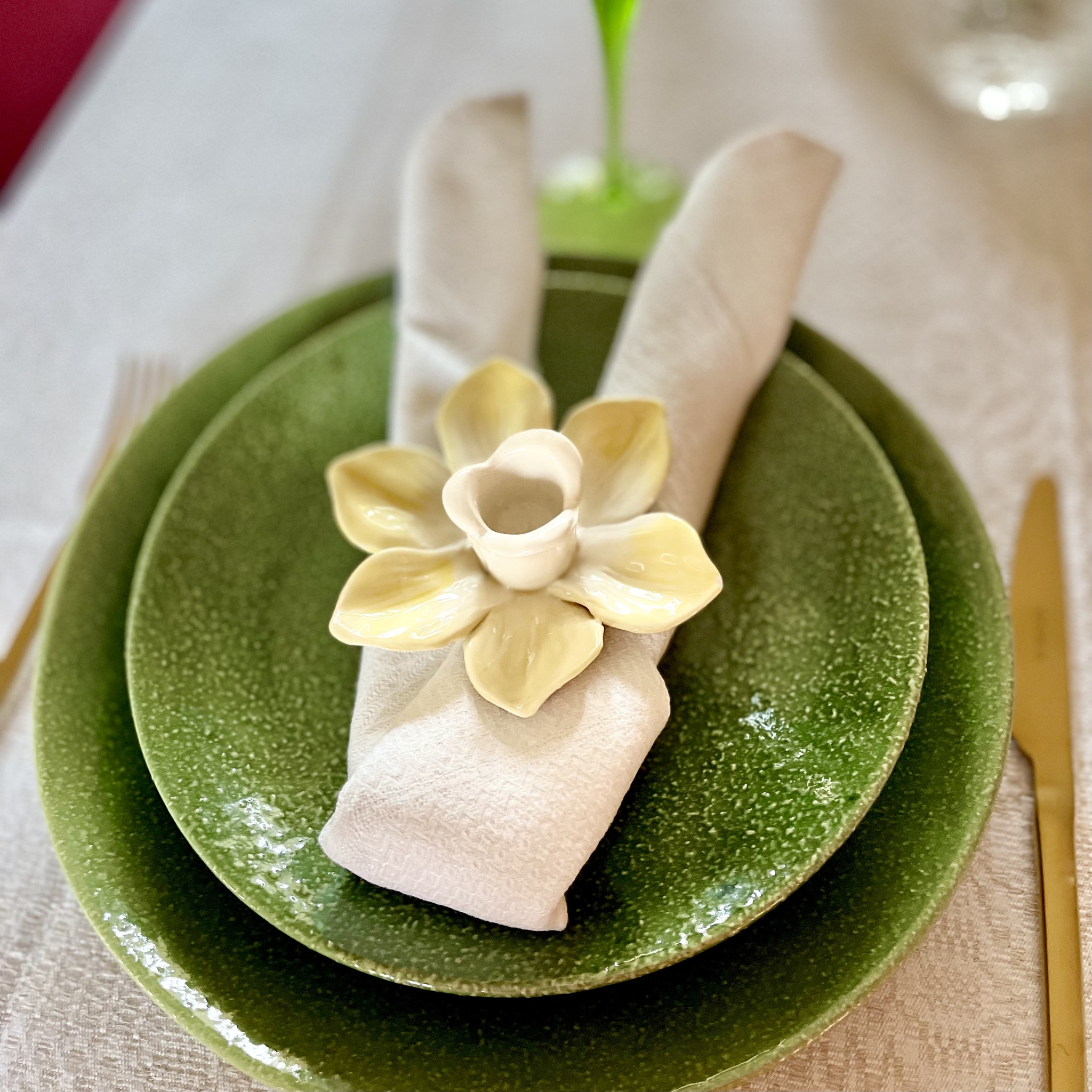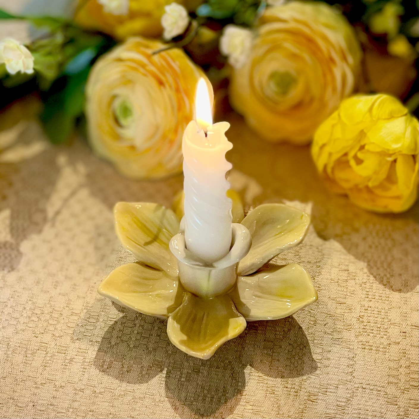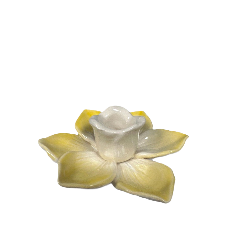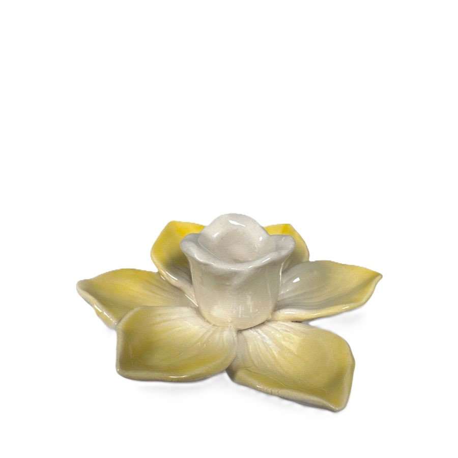 Förgyll ditt påskbord med den här ljusstaken av stengods i formen av en påsklilja. Bredd 10,8 cm, höjd 3,6 cm.