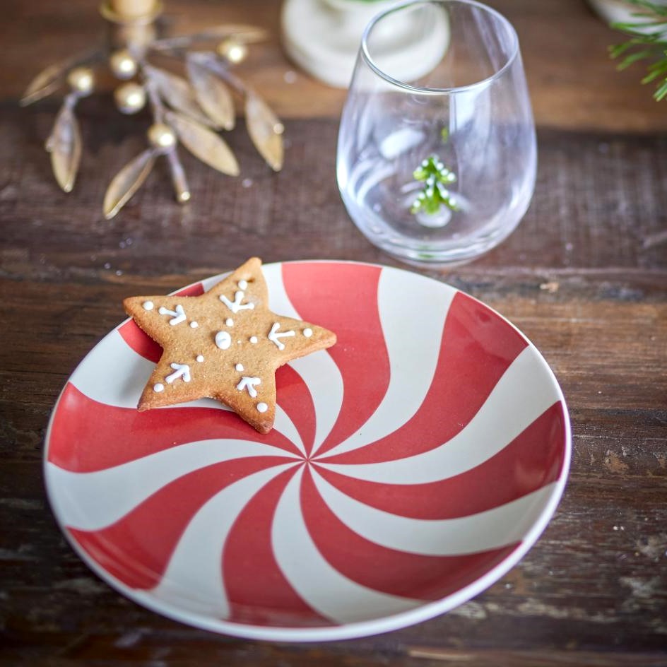 En stilren polkasnurr är väl aldrig fel? Iögonfallande lunchtallrik av stengods i klassiskt rött och vitt, perfekt för din juldukning. Tål diskmaskin och micro. Diameter 23 cm.