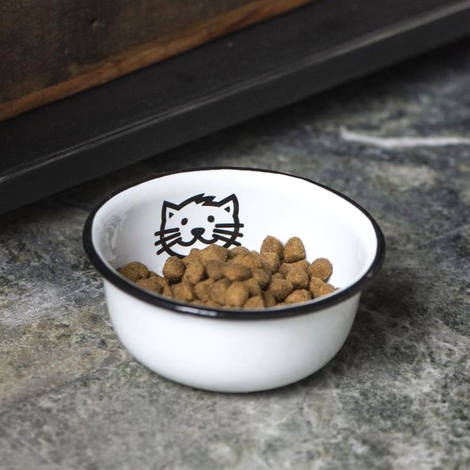 Skäm bort ditt lilla svansbarn med en bedårande matskål av emalj. Handdisk rekommenderas. Höjd 5, diameter 11 cm.
