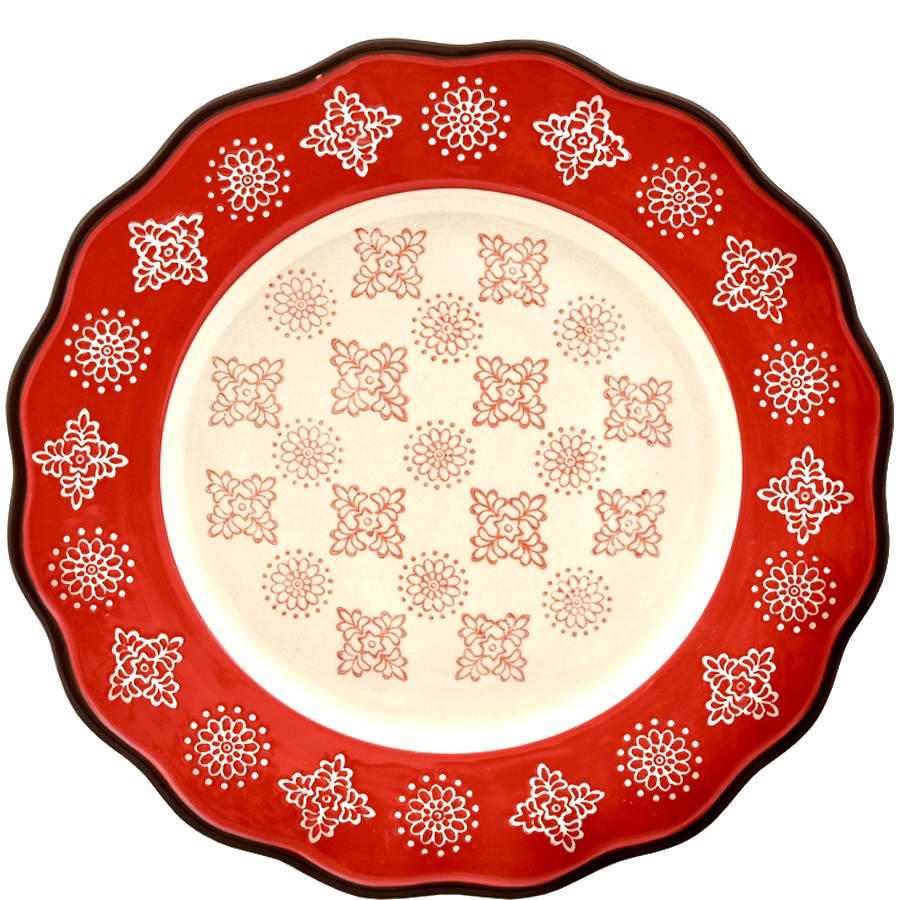 Helt underbar middagstallrik av stengods som är så julig som något kan bli! Mönstret är handtryckt vilket kan innebära viss skillnad på trycket i de olika delarna. Tål diskmaskin och micro. Alla delar är ugnsfasta, vilket innebär att serien är lämplig för långsam uppvärmning i ugnen, men inte för tillagning i öppen låga. Bredd 28 cm.