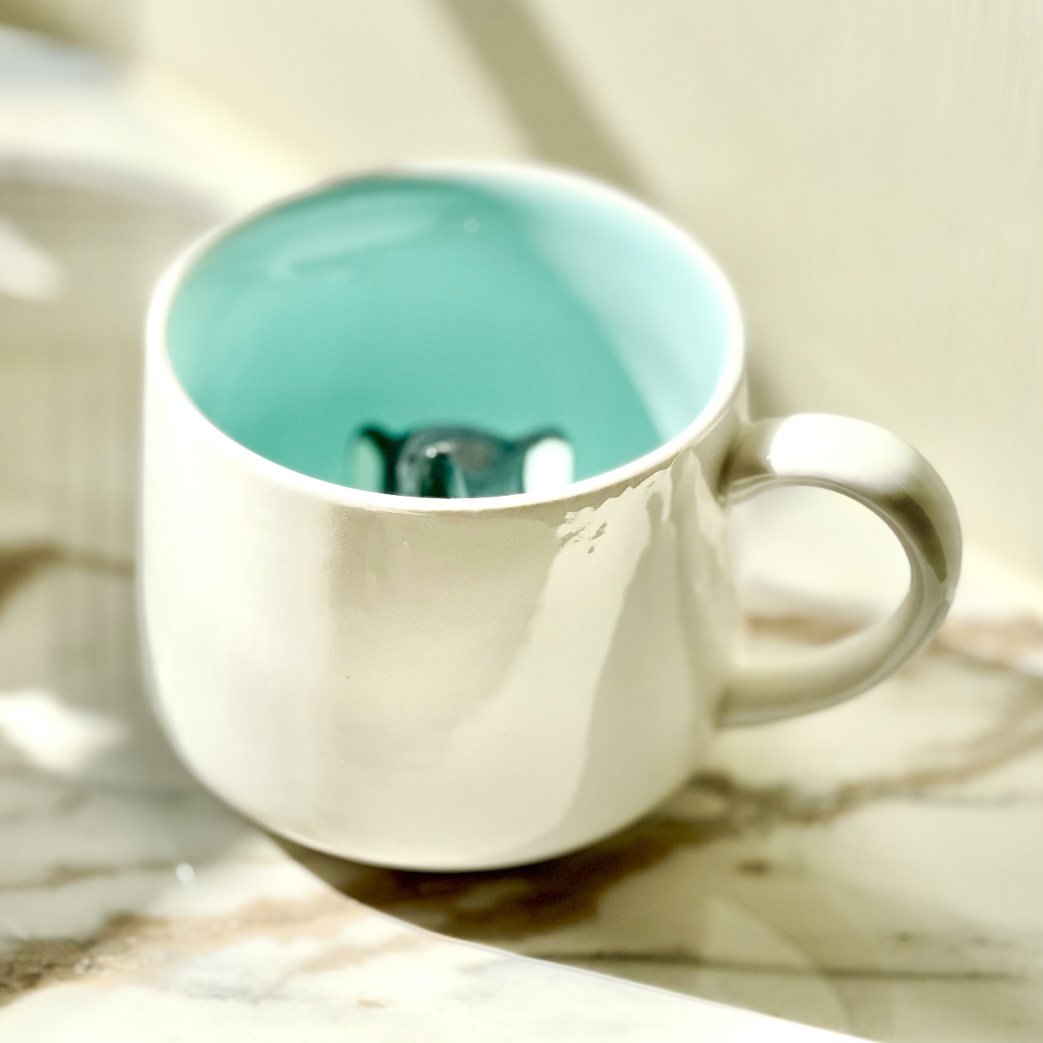 Men vad är det som tittar upp i botten av koppen? En elefant! Rejäl vit porslinsmugg med blå insida och liten näpen elefant. Höjd 8 cm.