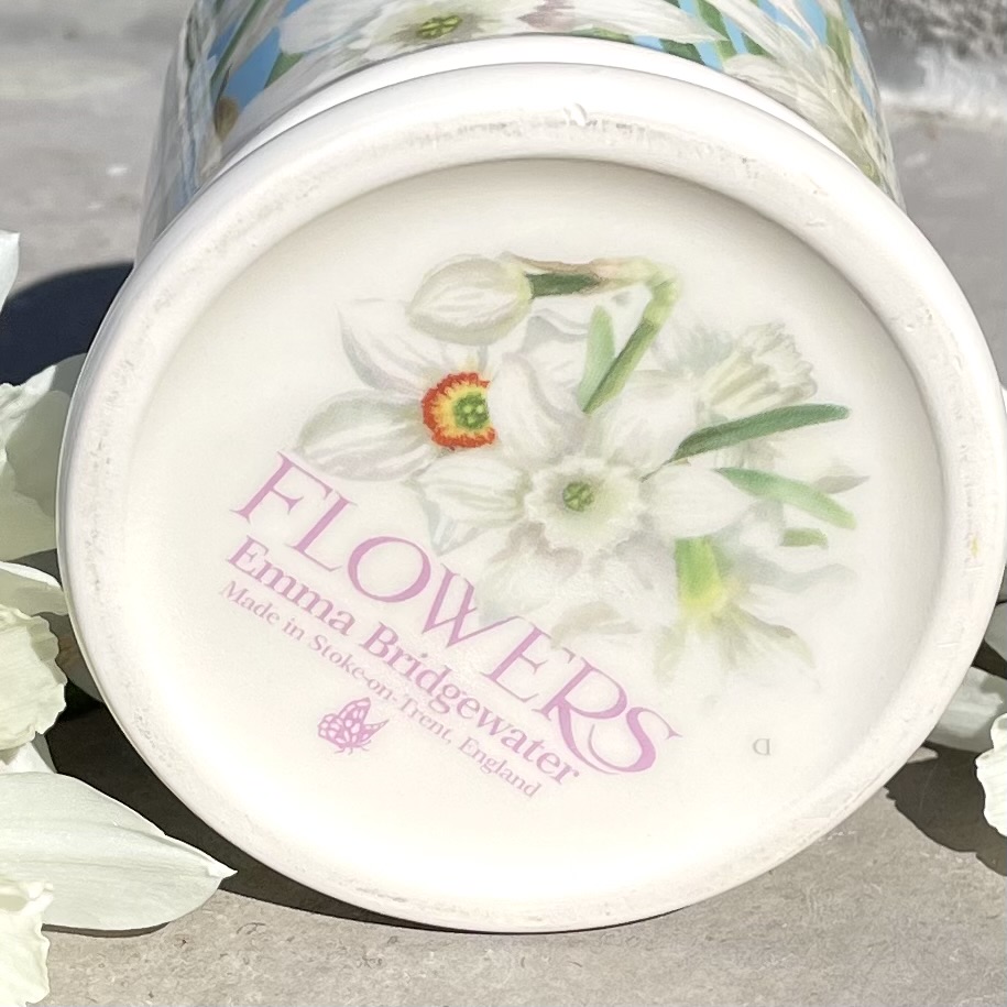 Porslinsmugg av absolut högsta kvalitet i design av Emma Bridgewater. Mönster med narcisser. NOS (New Old Stock) innebär att koppen är ny och oanvänd men tillhör en kollektion som utgått. Höjd 9,5 cm.