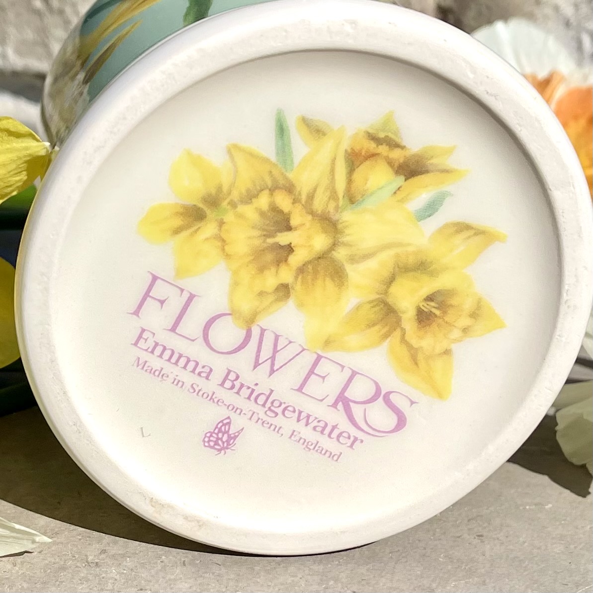 Porslinsmugg av absolut högsta kvalitet i design av Emma Bridgewater. Mönster med påskliljor. NOS (New Old Stock) innebär att koppen är ny och oanvänd men tillhör en kollektion som utgått. Höjd 9,5 cm