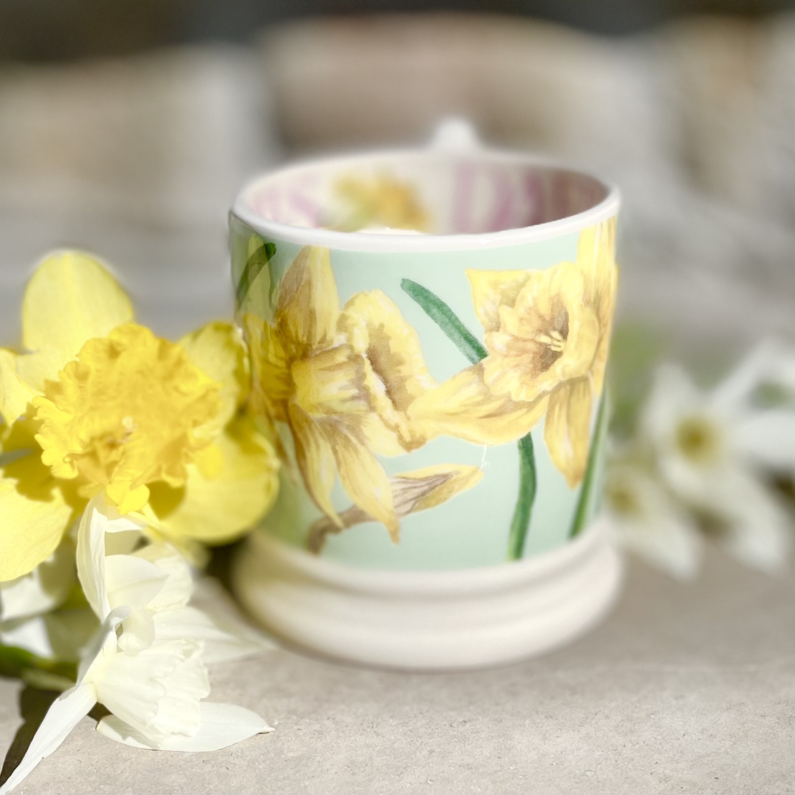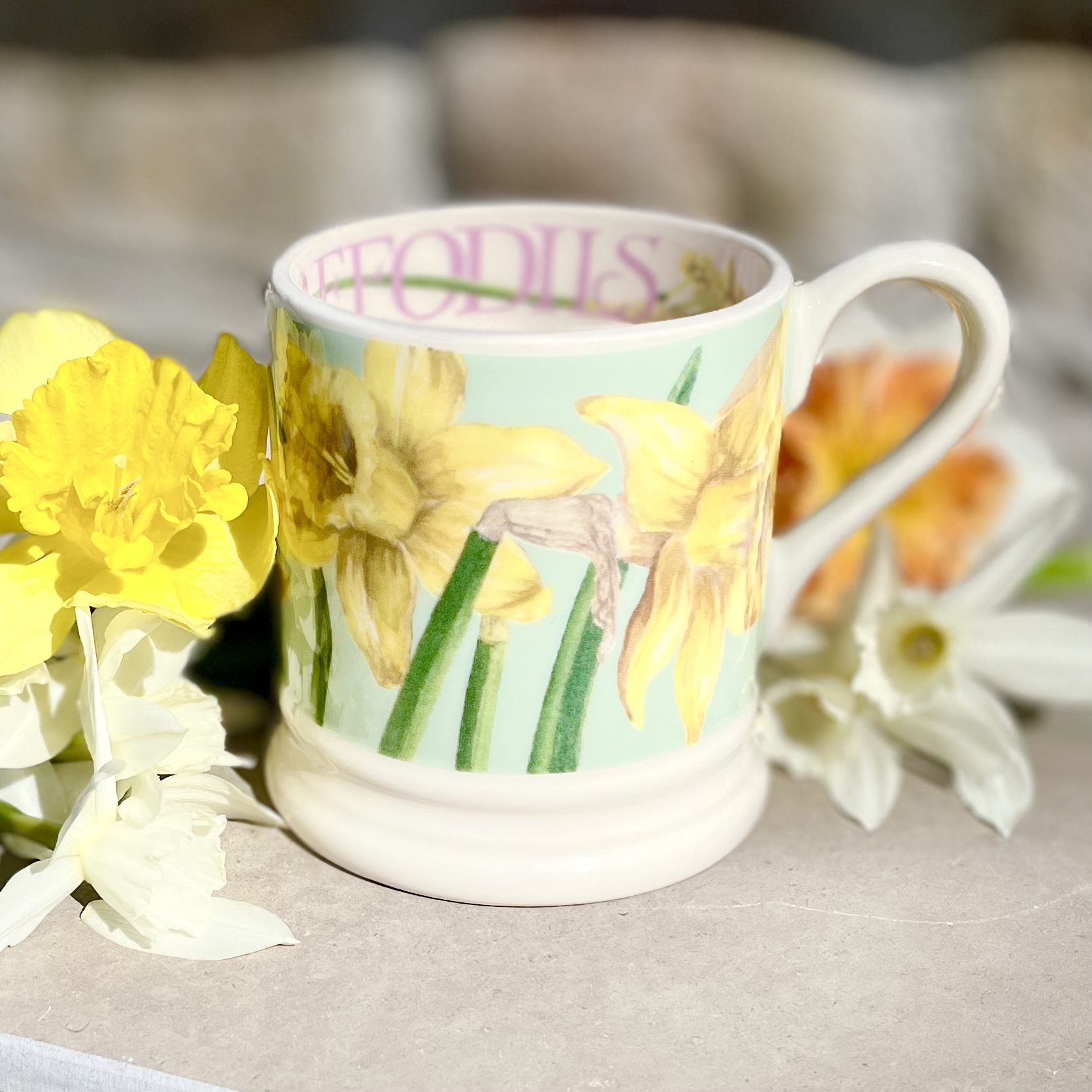 Porslinsmugg av absolut högsta kvalitet i design av Emma Bridgewater. Mönster med påskliljor. NOS (New Old Stock) innebär att koppen är ny och oanvänd men tillhör en kollektion som utgått. Höjd 9,5 cm.