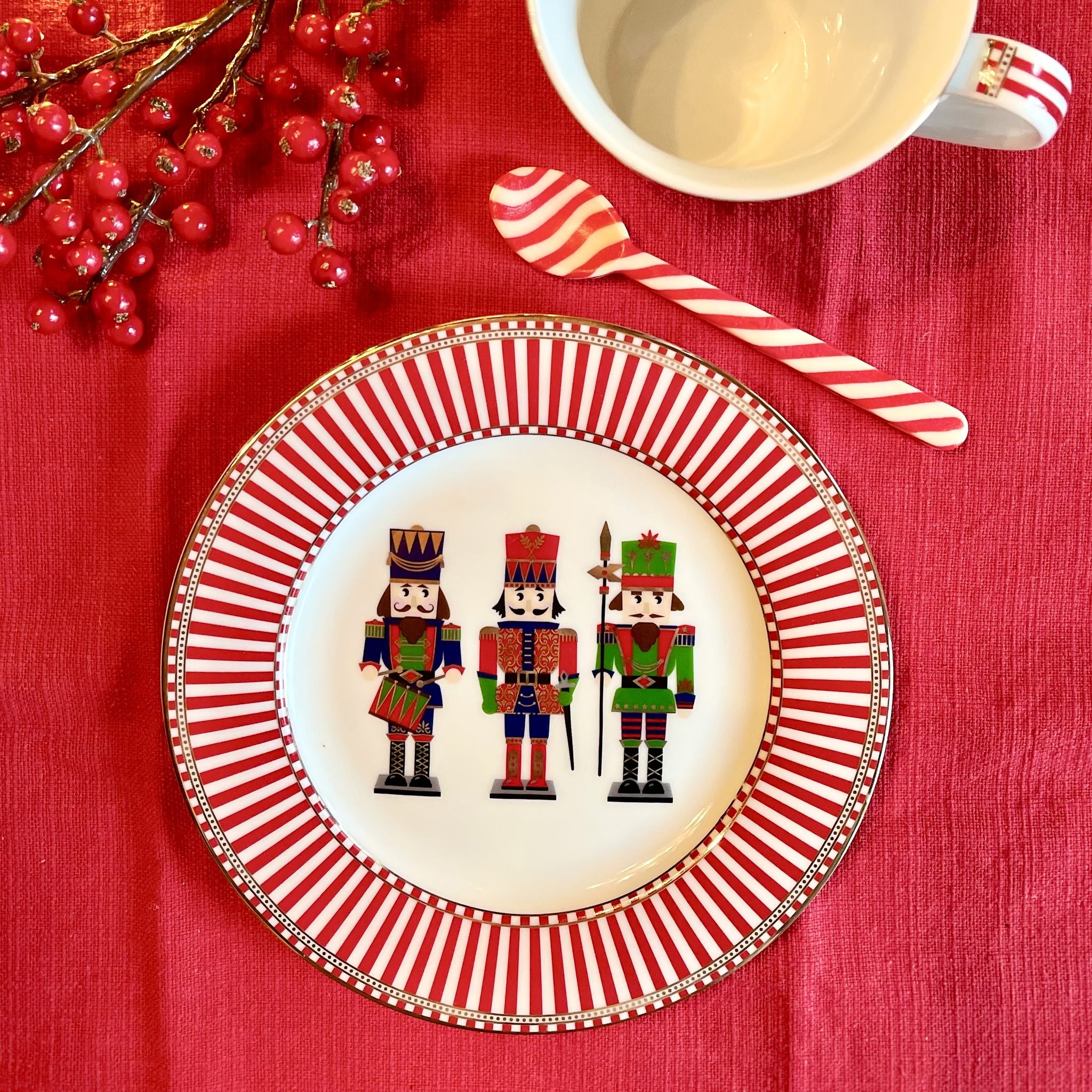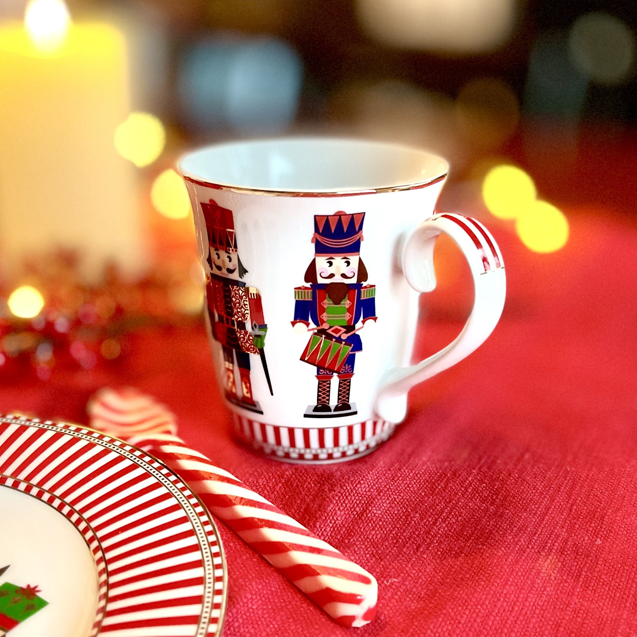 Underbar mugg av porslin med stolta nötknäpparsoldater i vackra färger och med lyxig guldkant. Julporslin som är en fröjd att duka fram. Handdisk, ej micro. Höjd 9,5 cm, rymmer 275 ml.