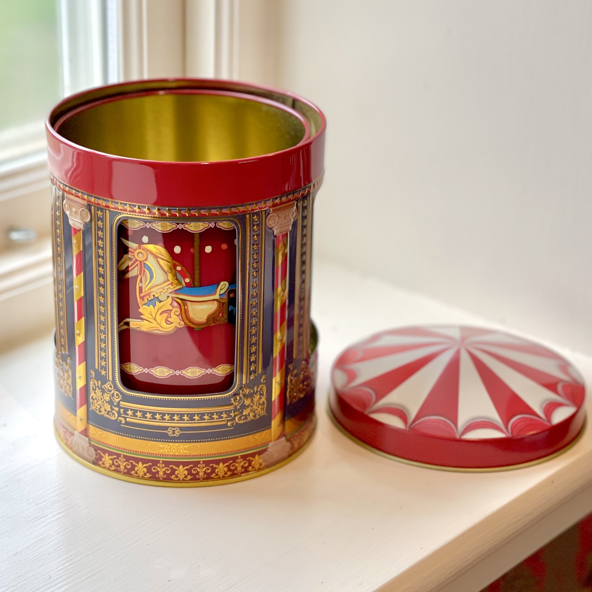 Plåtburk med speldosa och motiv med ljuvliga karusellhästar. Skruva upp speldosan under burken så snurrar bakgrundsbilden med karusellhästarna runt. Fyll med karameller eller kakor, ge bort som present eller gläds åt det vackra varje dag hemma. Höjd 16,5 cm, bredd 12 cm, djup att fylla med innehåll 10,5 cm.